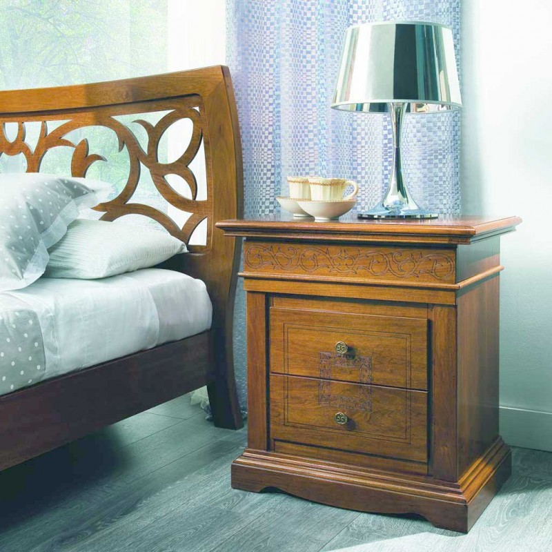 - 2 comodini classici con 2 cassetti con intagli: Larghezza 63 cm x Profondità 44 cm x Altezza 70 cm