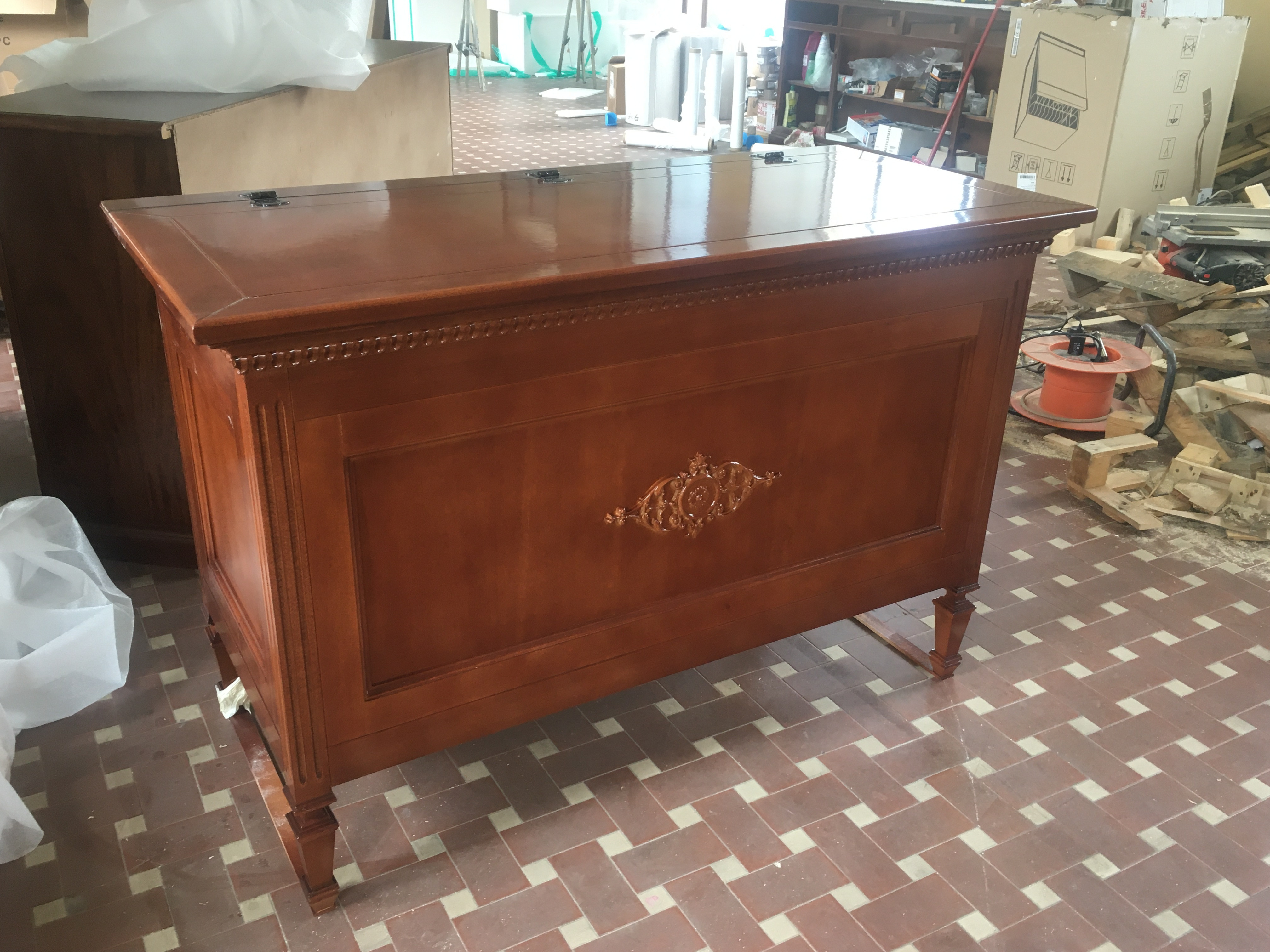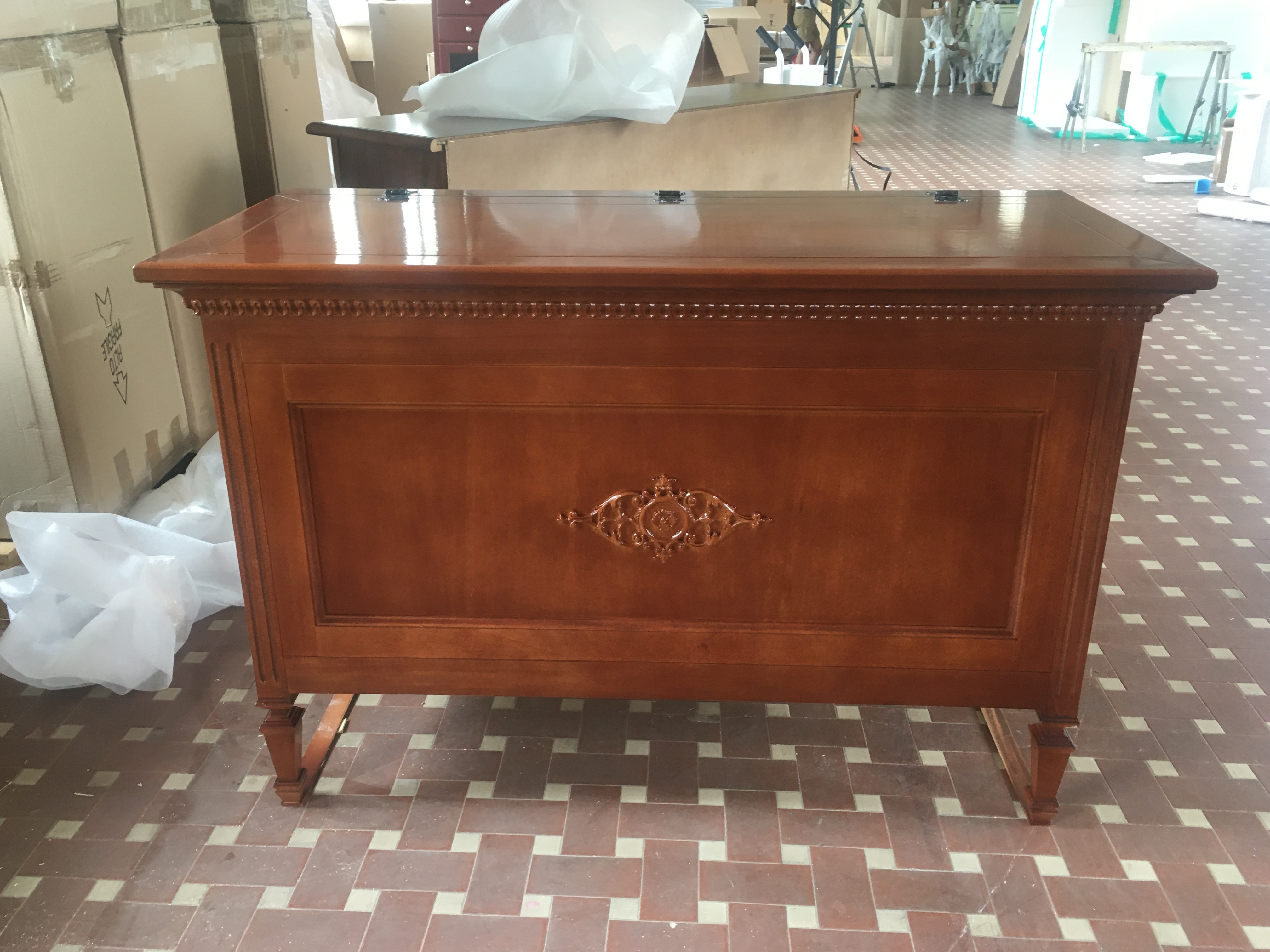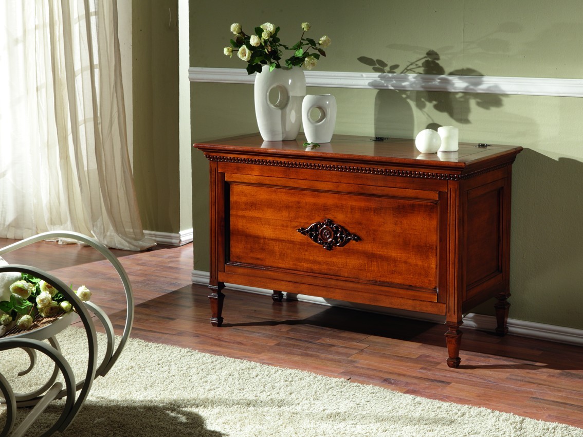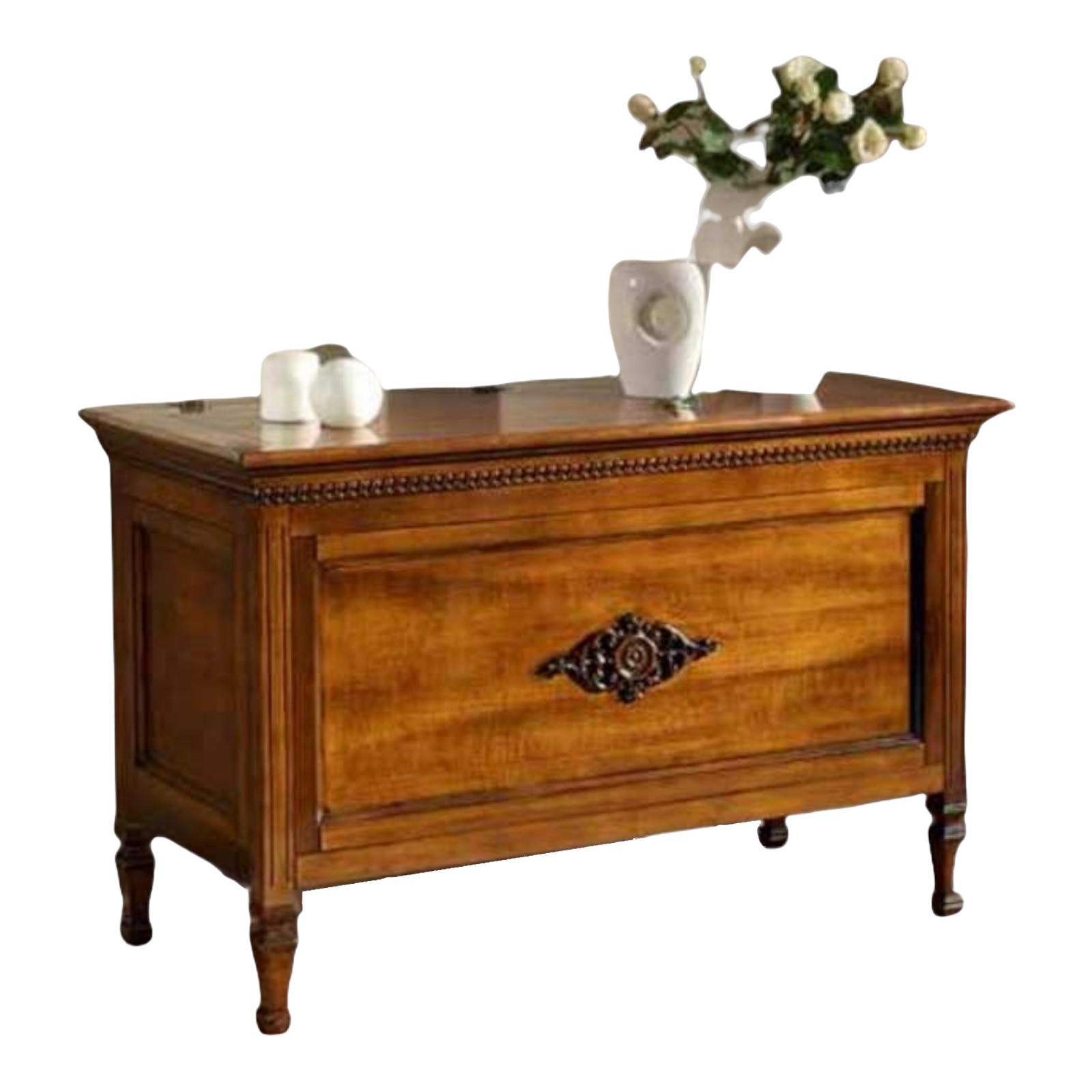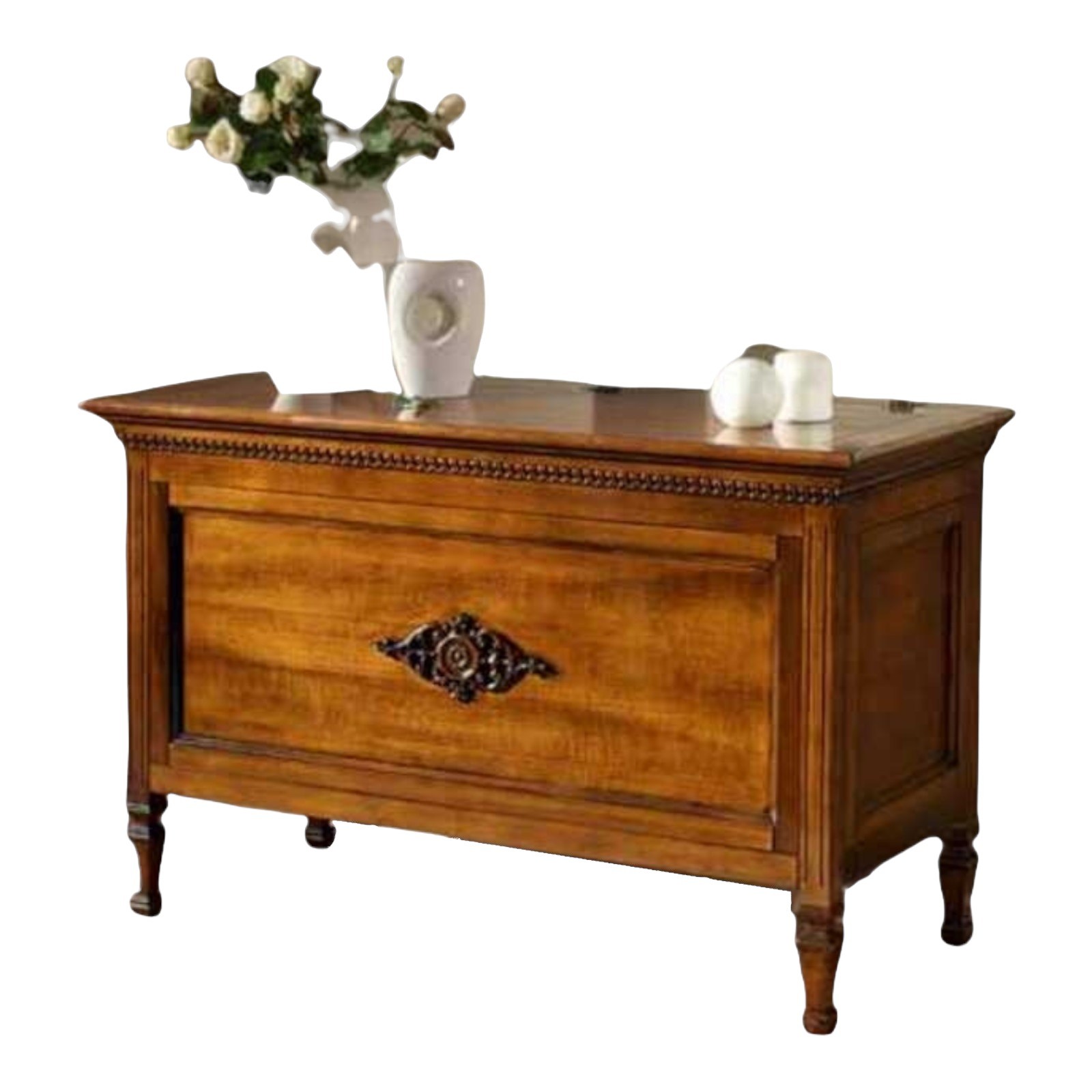 Cassapanca con apertura centrale con rosone intagliato , ideale per il riordino di stoviglie e oggetti. Complemento d'arredo apprezzato per la sua solidità e capienza ma allo stesso tempo funzionale , adatta per creare un'impatto estetico unico nel suo genere in cui domina lo stile classico. Ideale per arredare con gusto la stanza del soggiorno o come mobile per l'entrata.