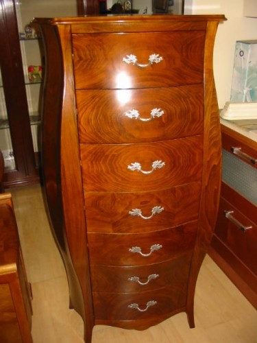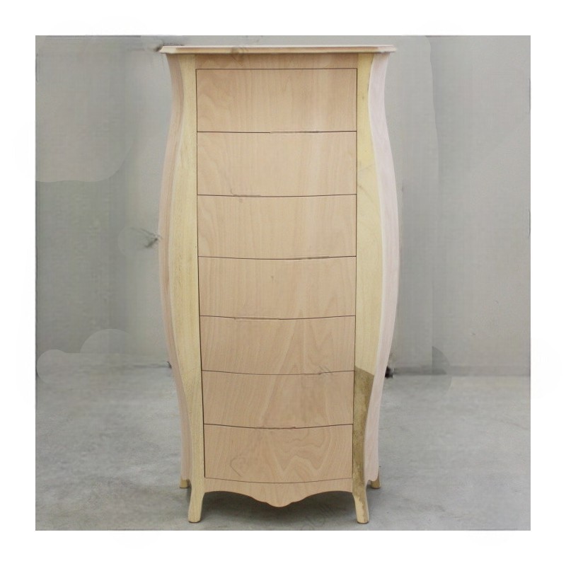 Cassettiera bombata costruita in legno massello, dotata di sette cassetti per riporre all'occorrenza biancheria intima e oggetti. Trovano facilmente posto nella zona notte proteggendo con i suoi cassetti il suo contenuto all'interno. Unica nel suo genere con la sua particolare sagomatura dando un tocco a un' atmosfera dallo stile elegante.