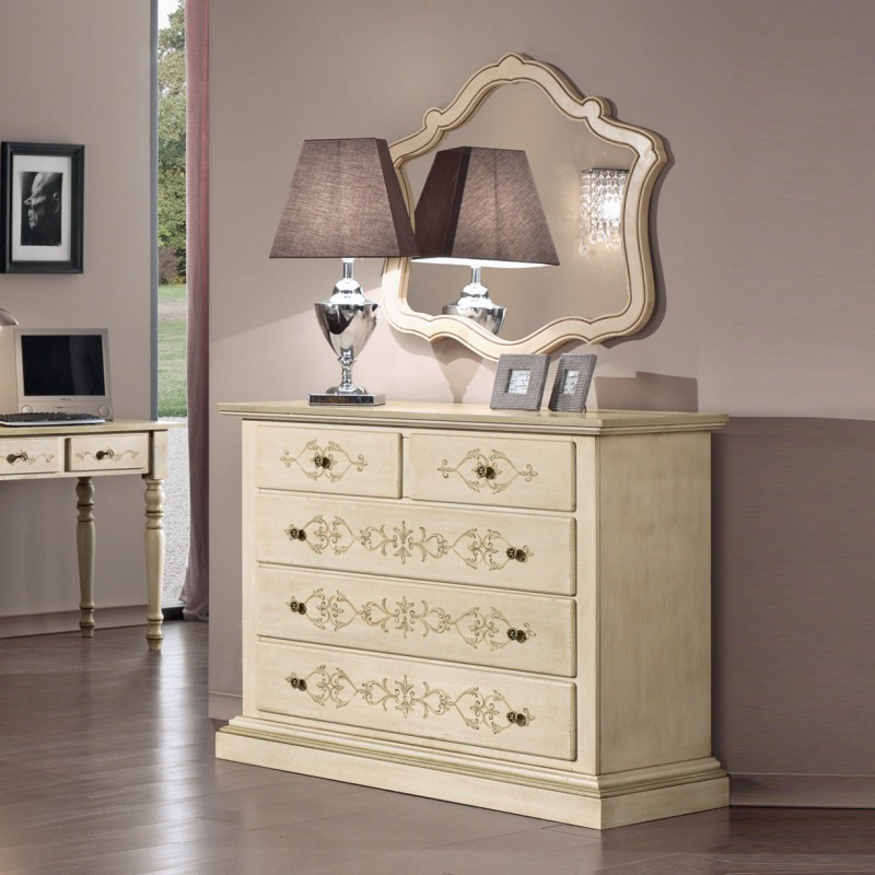 Finitura: laccatura artigianale con fondo colore avorio anticato con patine e decori filo colore verde