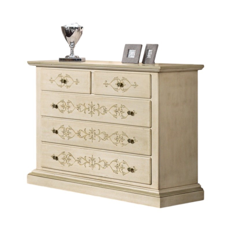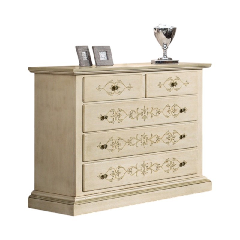 Cassettiera 5 cassetti legno shabby avorio anticato decorato filo verde 125x51x98 (1470)