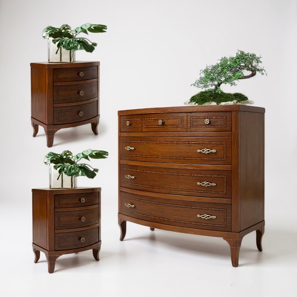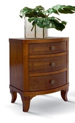 Gruppo cassettiera e Comodini costruiti in legno sagomati e con gambe a sciabola. Cassettiera e comodini dotati di cassetti per riporre all'occorrenza biancheria intima e oggetti. Trovano facilmente posto nella zona notte proteggendo con i suoi cassetti il suo contenuto all'interno. Unici nel loro genere con la sue maniglie e la decorazione a filetto di legno sul frontale dei cassetti e incisione sul piano, per migliorare l' aspetto estetico dando un tocco a un' atmosfera dallo stile d'altri tempi.