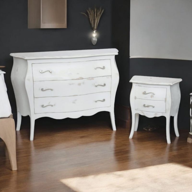 Cassettiera costruita in legno bombata con gambe a sciabola. Cassettiera dotata di cassetti per riporre all'occorrenza biancheria intima e oggetti. Trovano facilmente posto nella zona notte proteggendo con i suoi cassetti il suo contenuto all'interno. Unici nel loro genere con la sua particolare laccatura consumata dando un tocco a un' atmosfera dallo stile romantico.