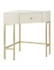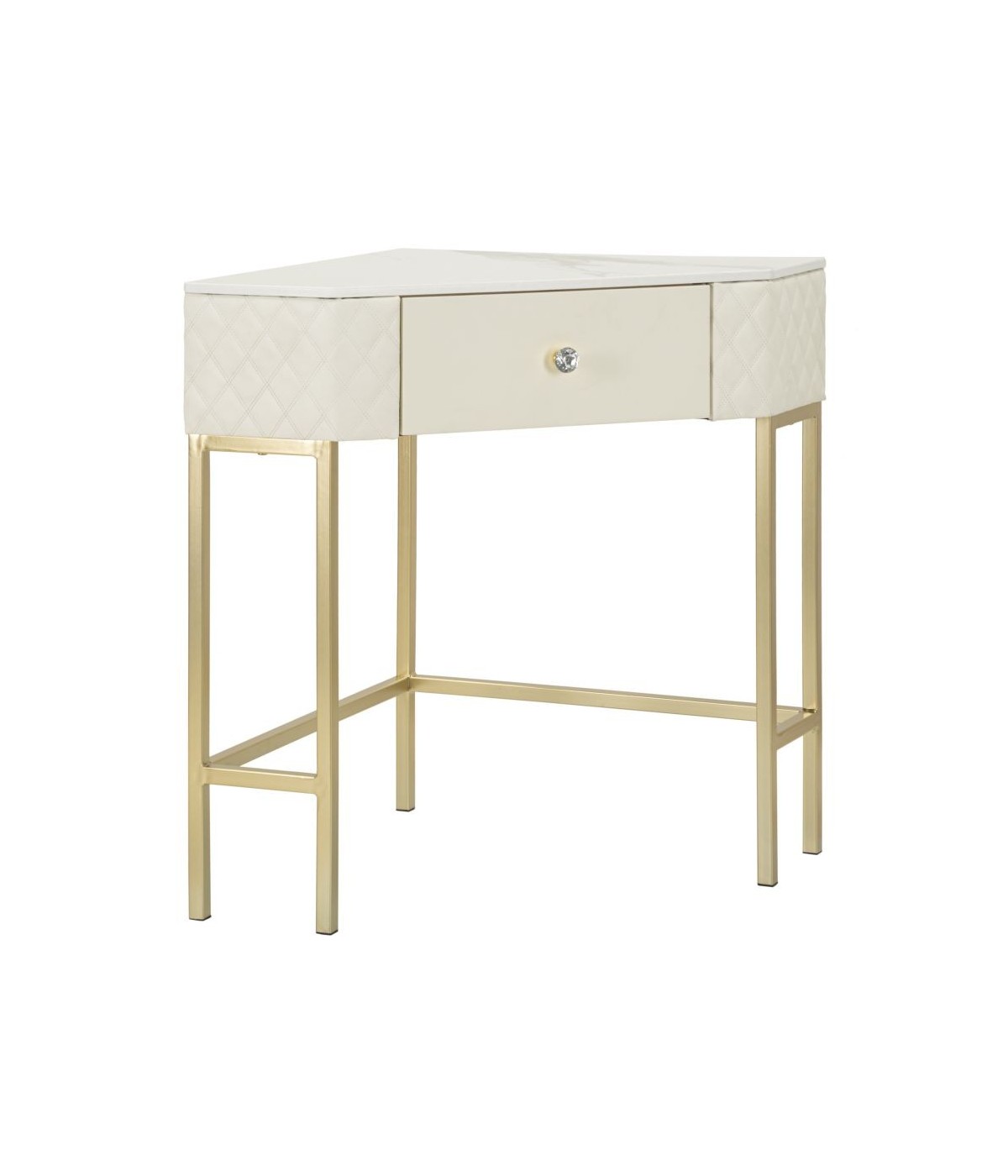 Console ad angolo trapuntata in simil pelle con eleganti gambe dorate e poggiapiedi integrato. Pomello a forma di brillante per un tocco di lusso e stile. Completa di cassetto. Prodotto da assemblare.