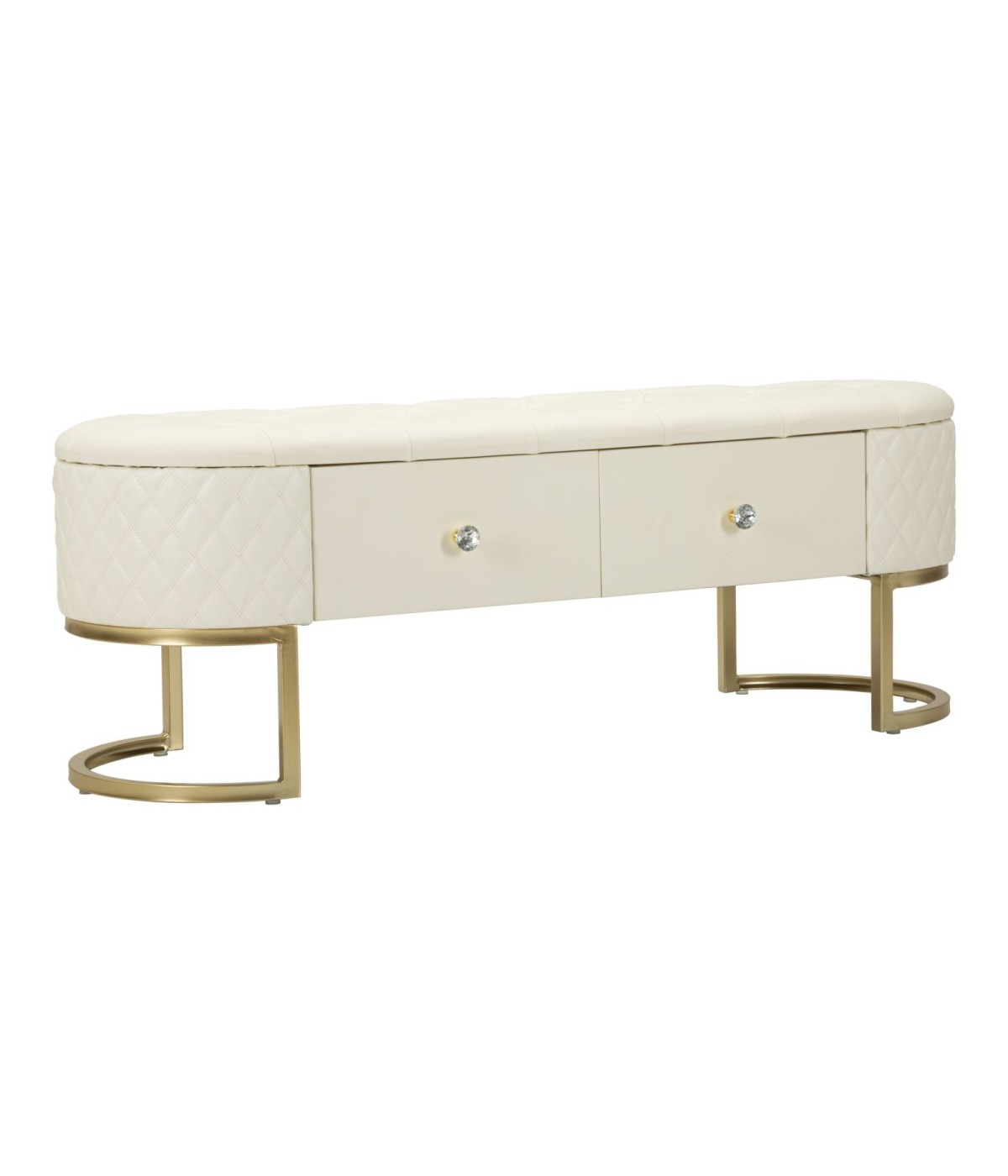Panca elegante e funzionale con cassetti, rivestita in simil pelle trapuntata, con gambe circolari in metallo dorato che abbracciano la sua forma distintiva.