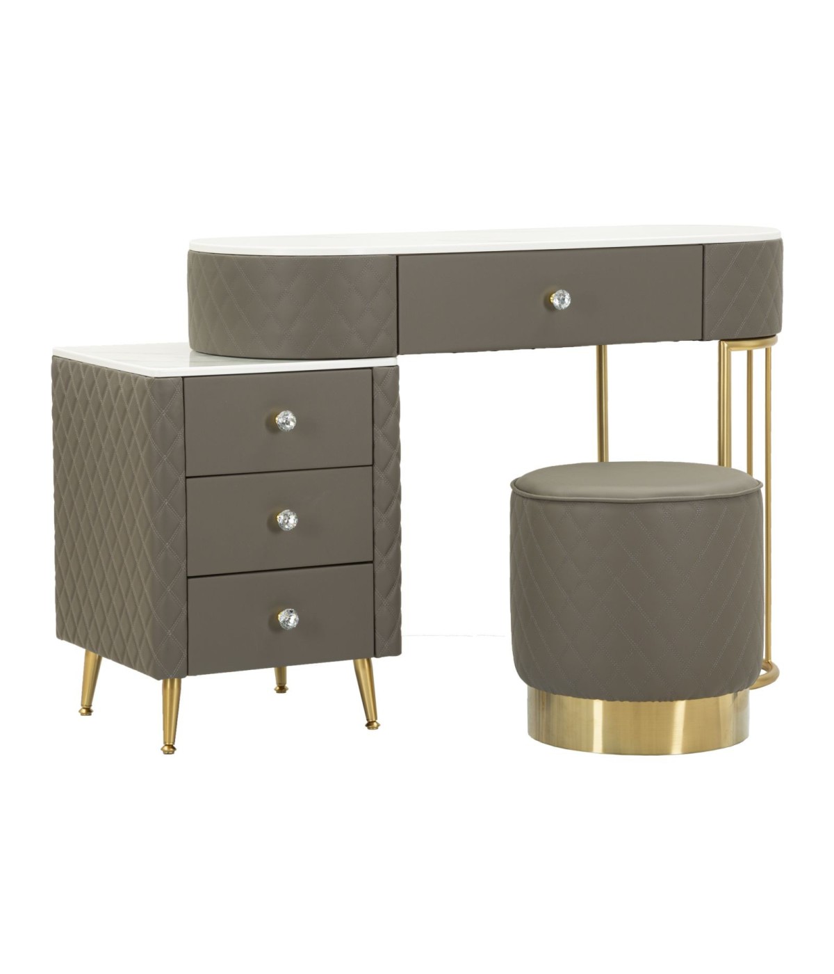Una toeletta lussuosa e raffinata in simil pelle trapuntata e struttura in metallo dorato, il top in simil marmo suggerisce lusso, e i pomelli diamantati brillano di glamour. Completa di pouff rotondo in simil pelle trapuntata con base in metallo dorato.
