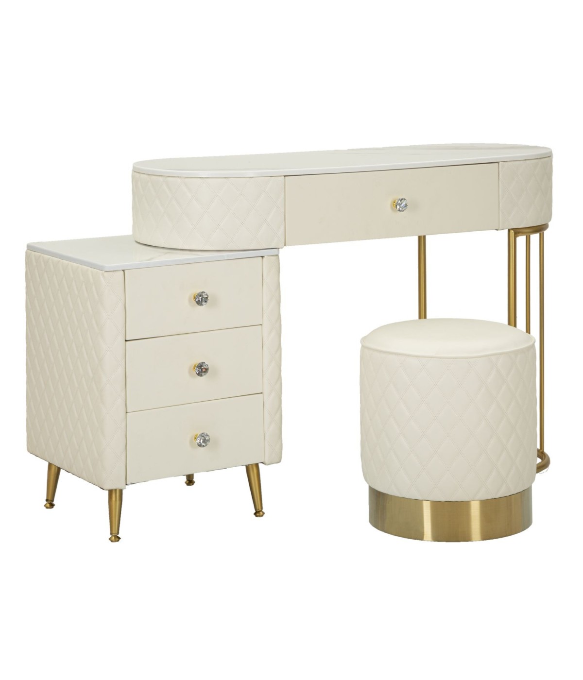 Una toeletta lussuosa e raffinata in simil pelle trapuntata e struttura in metallo dorato, il top in simil marmo suggerisce lusso, e i pomelli diamantati brillano di glamour. Completa di pouff rotondo in simil pelle trapuntata con base in metallo dorato.