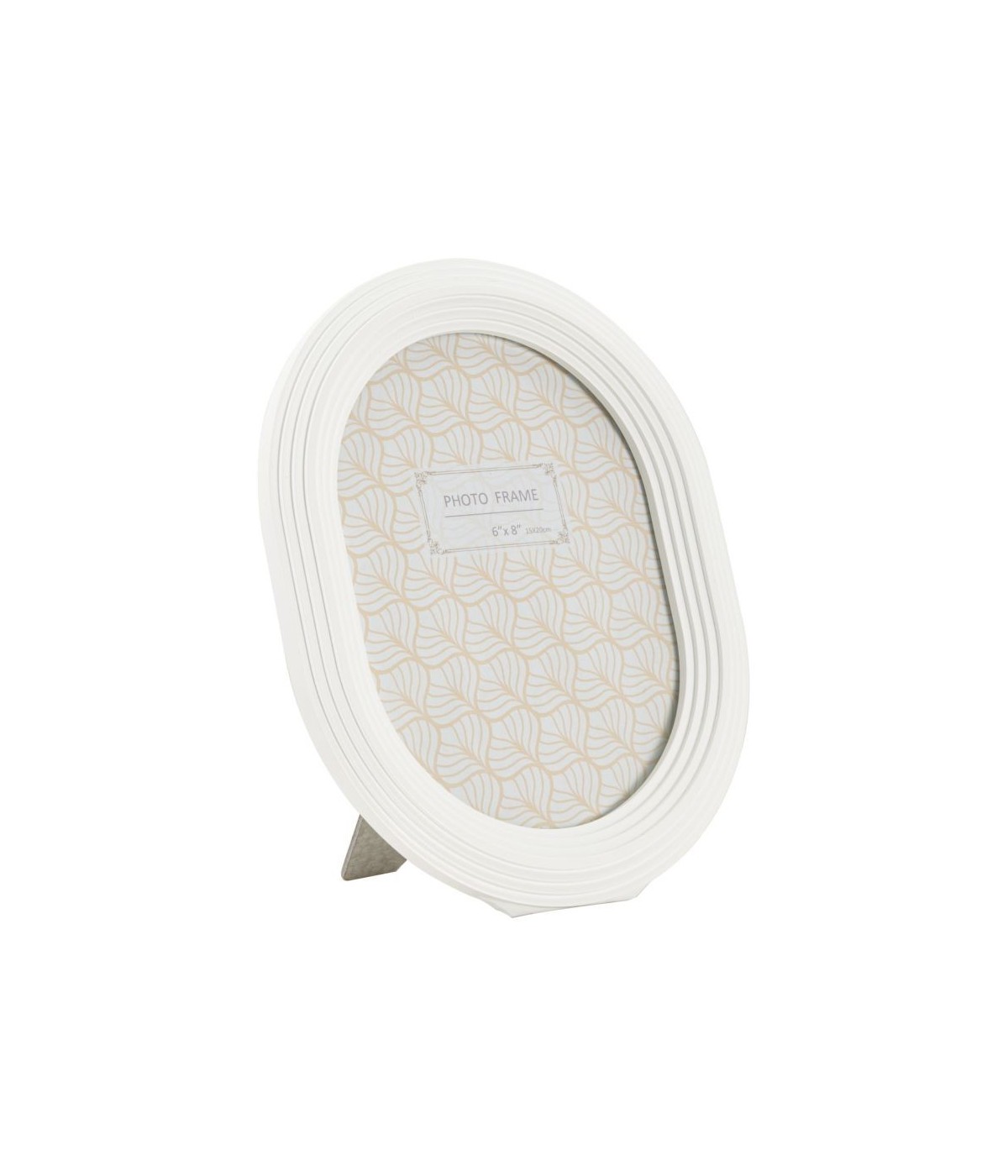 Cornice ovale da appoggio in resina bianca dal design semplice e lineare. Dimensioni foto cm 15x20.