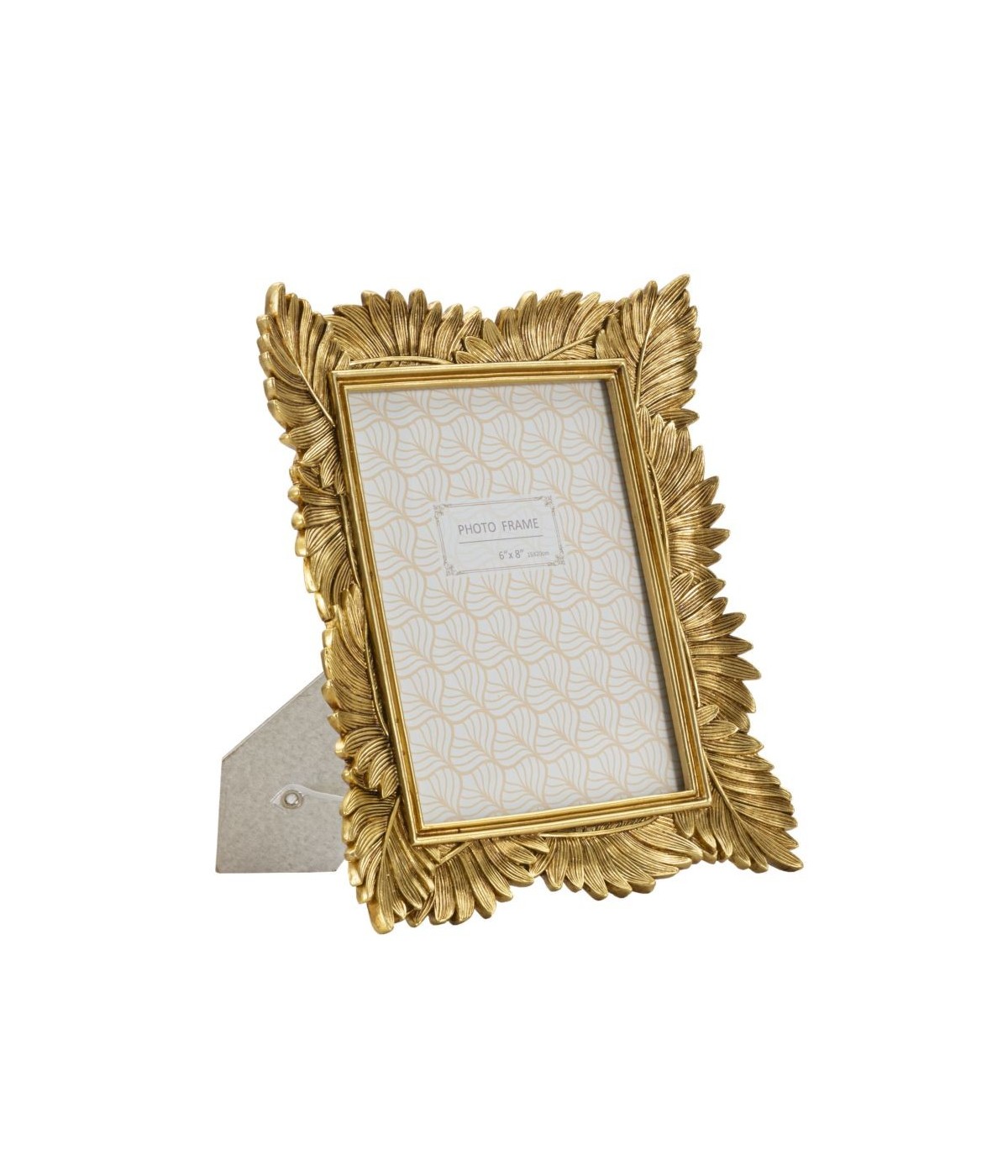 Cornice rettangolare da appoggio in resina dal design composto da un insieme di foglie. Può essere posizionata sia in orizzontale che in verticale. Dimensioni foto cm 15x20.