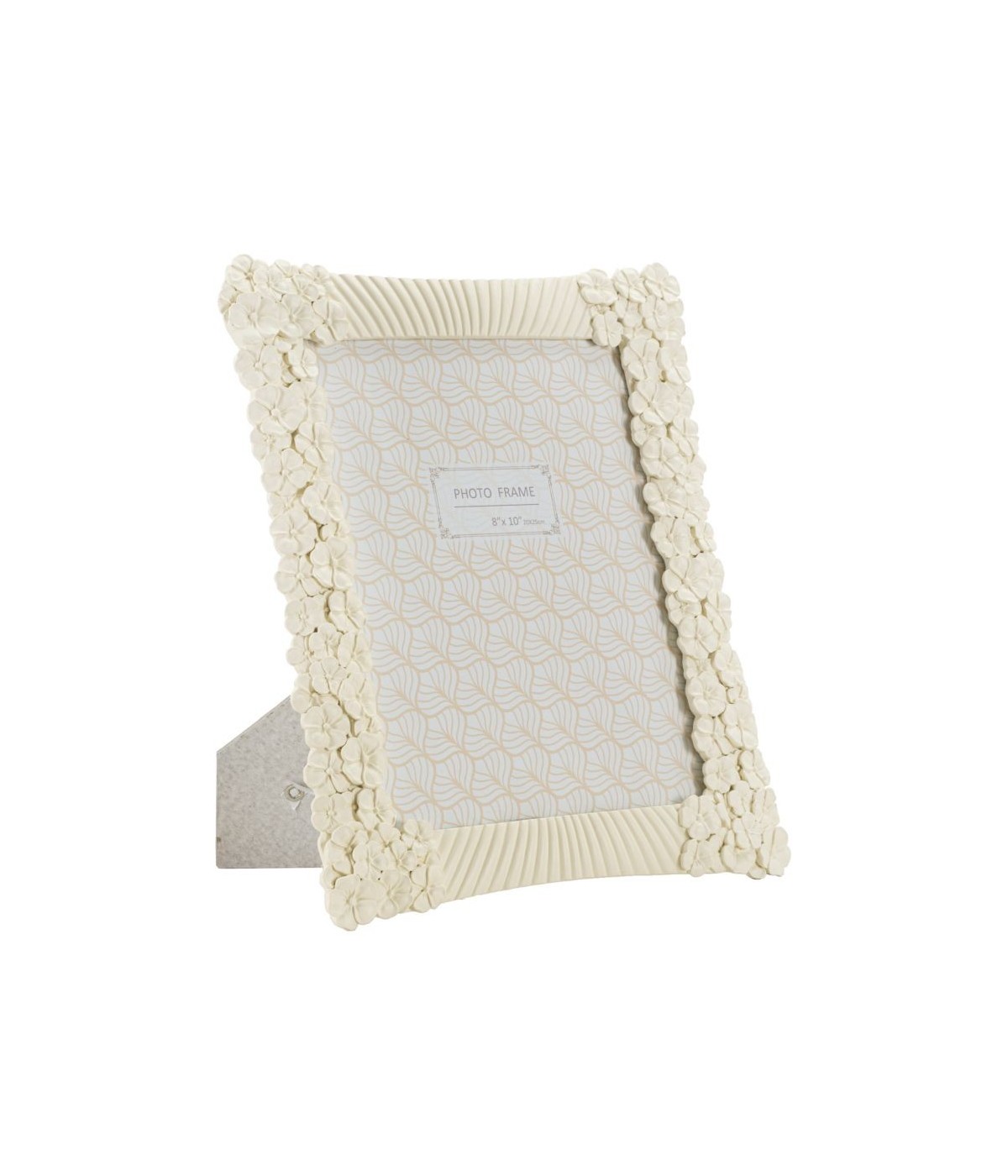 Cornice rettangolare da appoggio in resina dalle linee morbide e impreziosita da un insieme di fiorellini. Può essere posizionata sia in orizzontale che in verticale. Dimensioni foto cm 20x25.