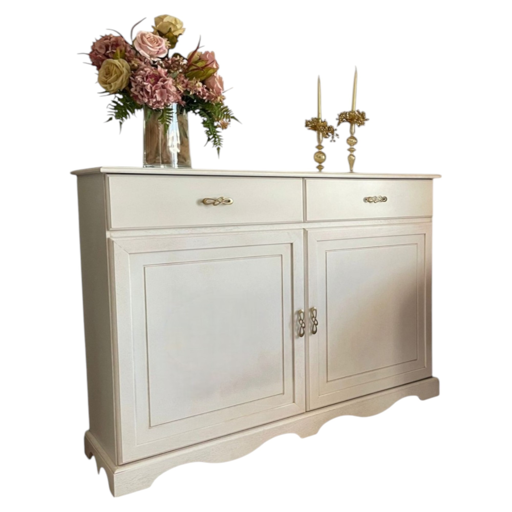 Credenza classica che conquisterà i vostri ospiti per l'eleganza esclusiva nel suo genere, esempio perfetto in stile shabby dal design raffinato e dalle linee classiche. Solida e Capiente per il riordino delle stoviglie e di bicchieri in modo ordinato, complemento di arredo ideale per creare un' atmosfera luminosa in cui domina il tono neutro unico nel suo genere .