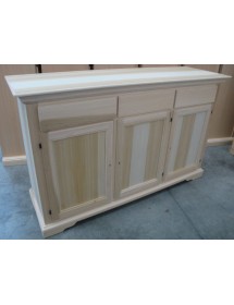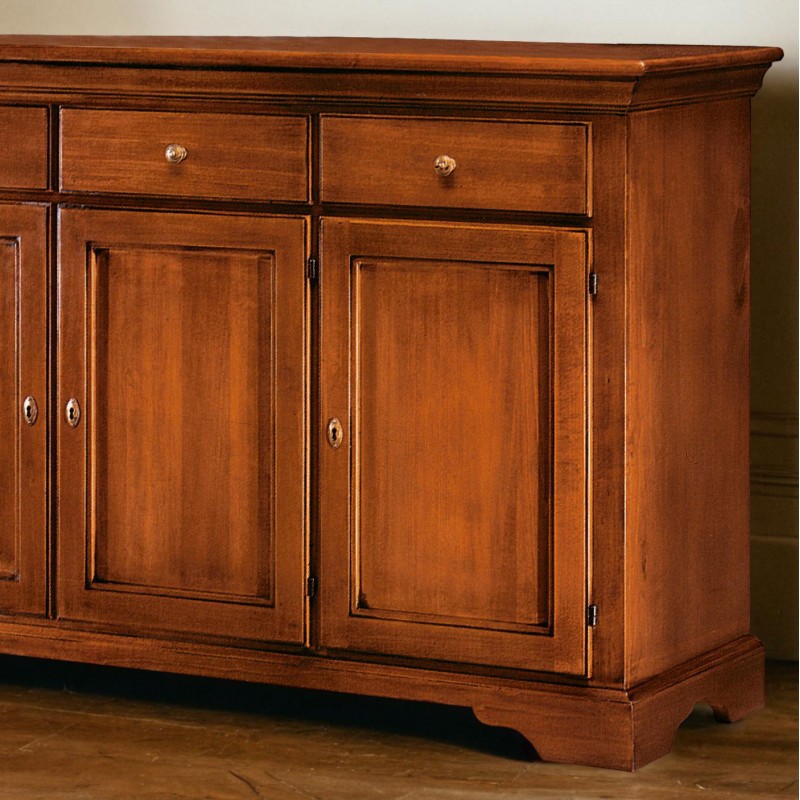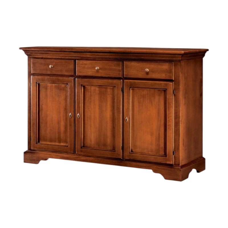 Credenza classica in in legno massello con zoccolo sagomato. Grazie al suo ripiano interno ti permetterà di suddividere all' interno: cibi , piatti , bicchieri e quanto altro si voglia aggiungere, sfruttando anche i cassetti per riporre strofinacci, posate e tovaglie. Ideale da posizionare nella taverna, all'ingresso della casa o nella zona living ottimizzando ogni minimo spazio.