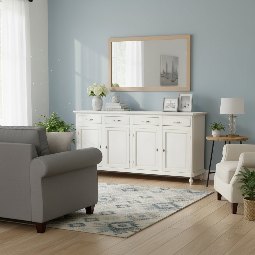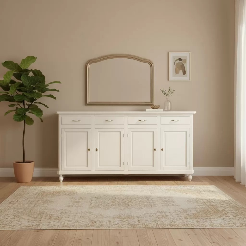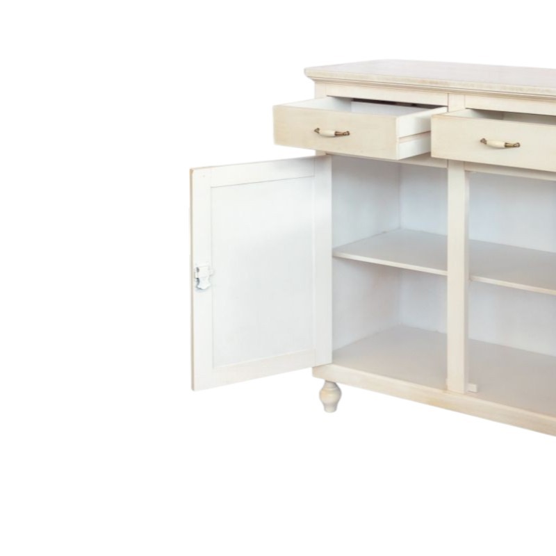 Madia credenza dallo stile Shabby perfetta per la tua sala da pranzo o soggiorno grazie alla sua laccatura bianco anticato e alle maniglie retrò in porcellana. Complemento d' arredo indispensabile per ogni casa grazie ai quattro cassetti e alle quattro ante riponendo all' interno stoviglie, piatti , bicchieri e oggetti di piccole dimensioni.