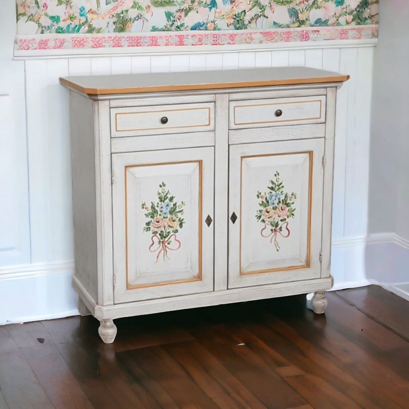 Madia credenza dallo stile Shabby perfetta per la tua sala da pranzo o soggiorno grazie ai suoi decori floreali! Complemento d' arredo indispensabile per ogni casa riponendo all' interno dei due cassetti e delle due ante piatti, stoviglie e bicchieri e oggetti di piccole dimensioni. Questa madia è capace di soddisfare tutti i requisiti di eleganza e versatilità.