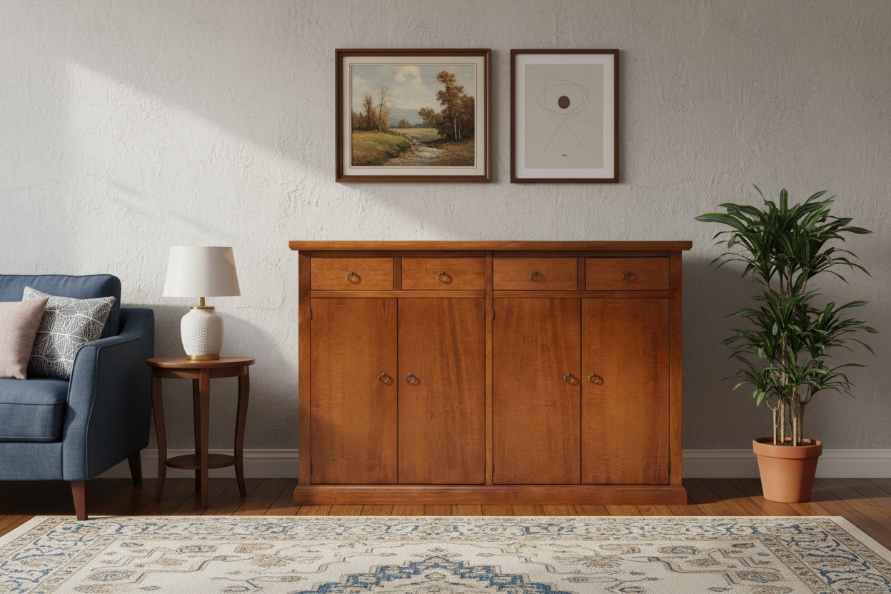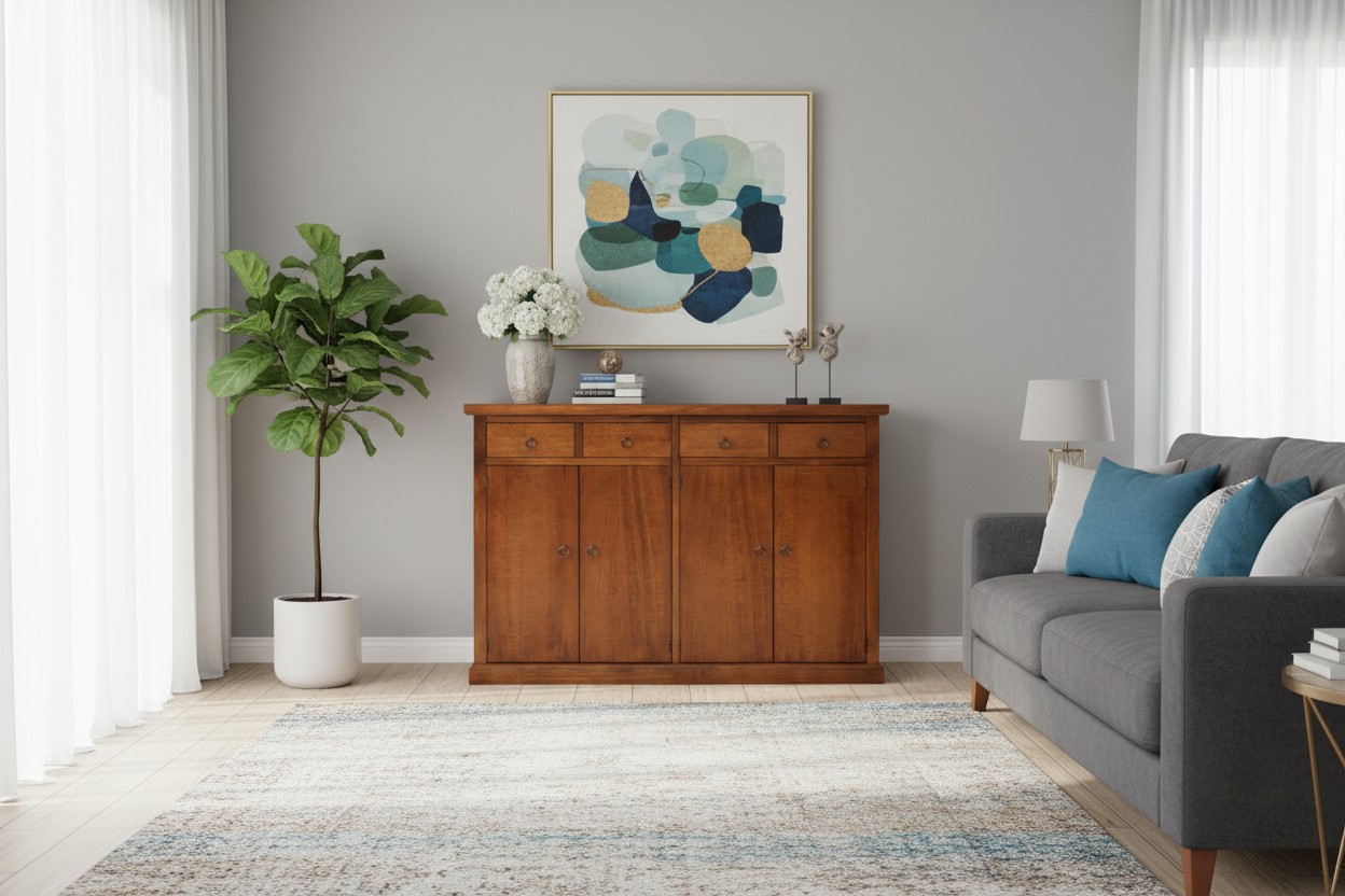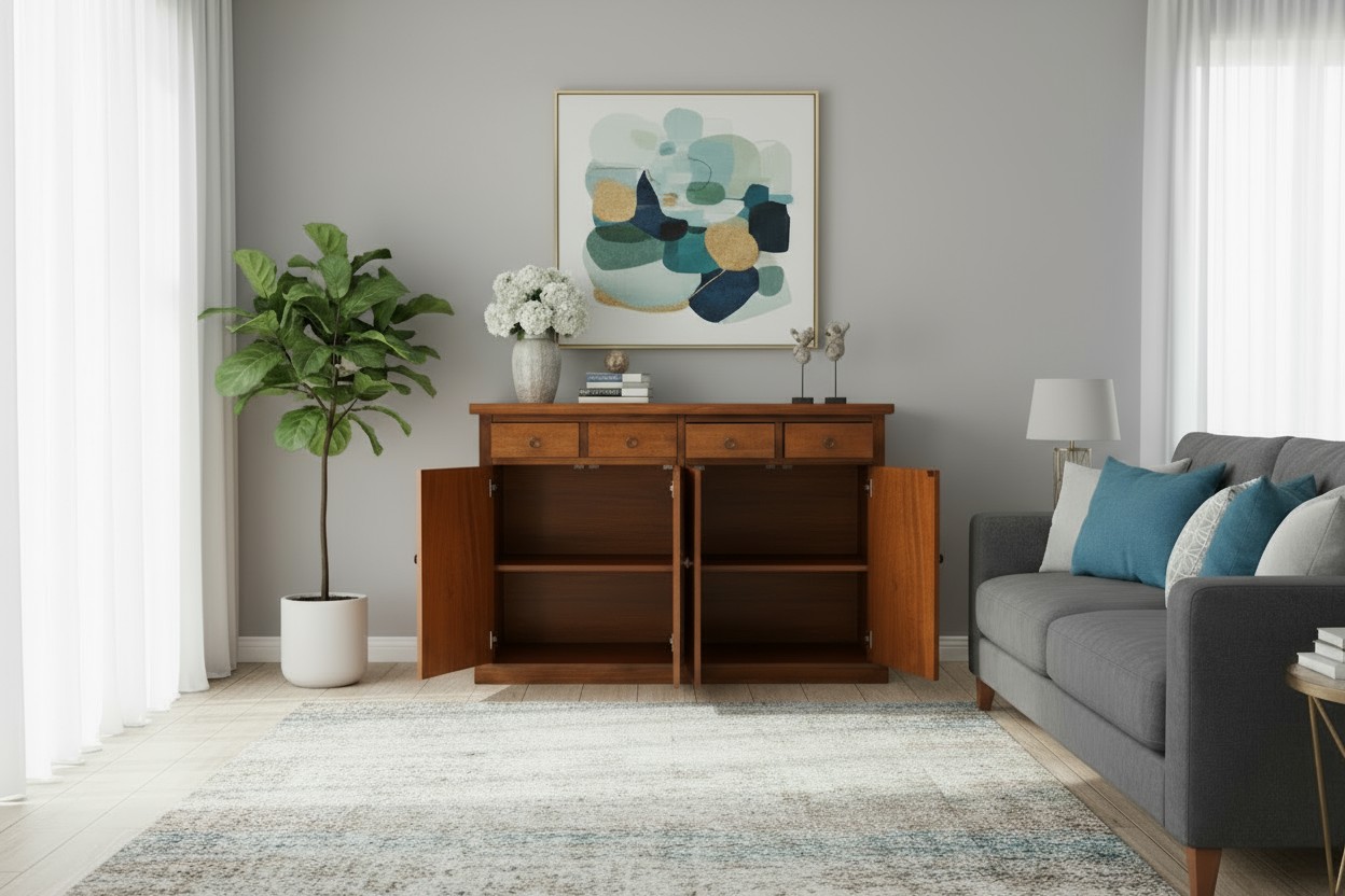 Grazie alle sue dimensioni contenute, la credenza si adatta ad ambienti con poco spazio, a cui non mancherà di dare un tocco di eleganza e sobrietà.