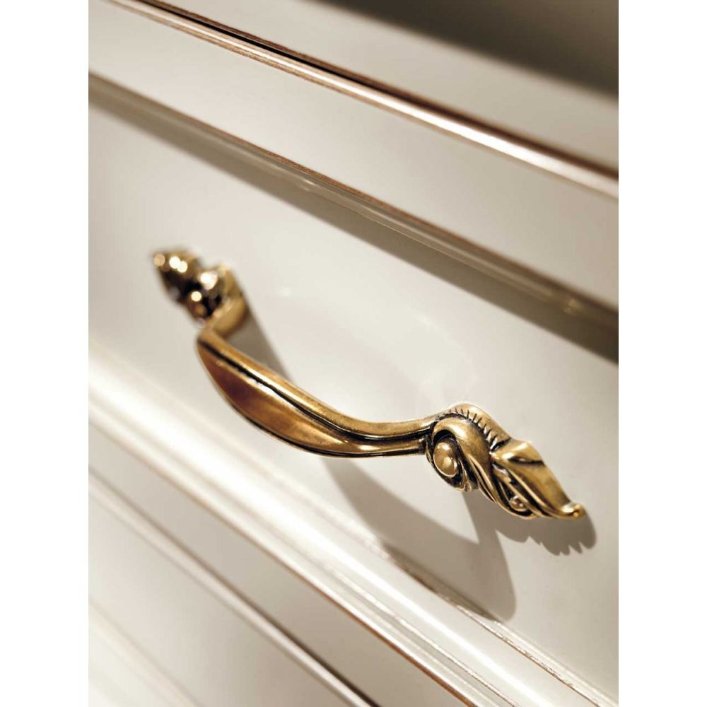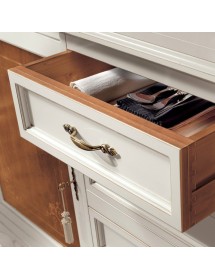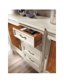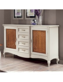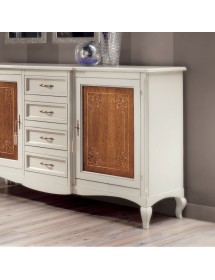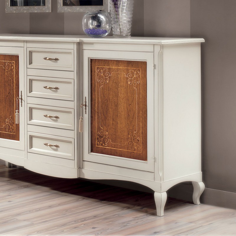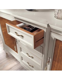 Credenza classica finitura bicolore, costruita in legno massello gambe anteriori e posteriori curvate e fascia sottostante sagomata. Porte battenti con decori e filettature realizzate con maestria da artigiani del settore, aggiungendo un tocco di unicità con i 4 cassetti centrali realizzati in un corpo avanzato . ideale per una zona soggiorno classica o come elemento di contrasto con mobili moderni.