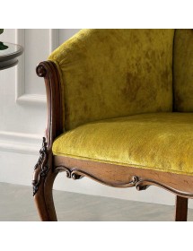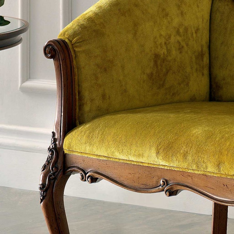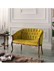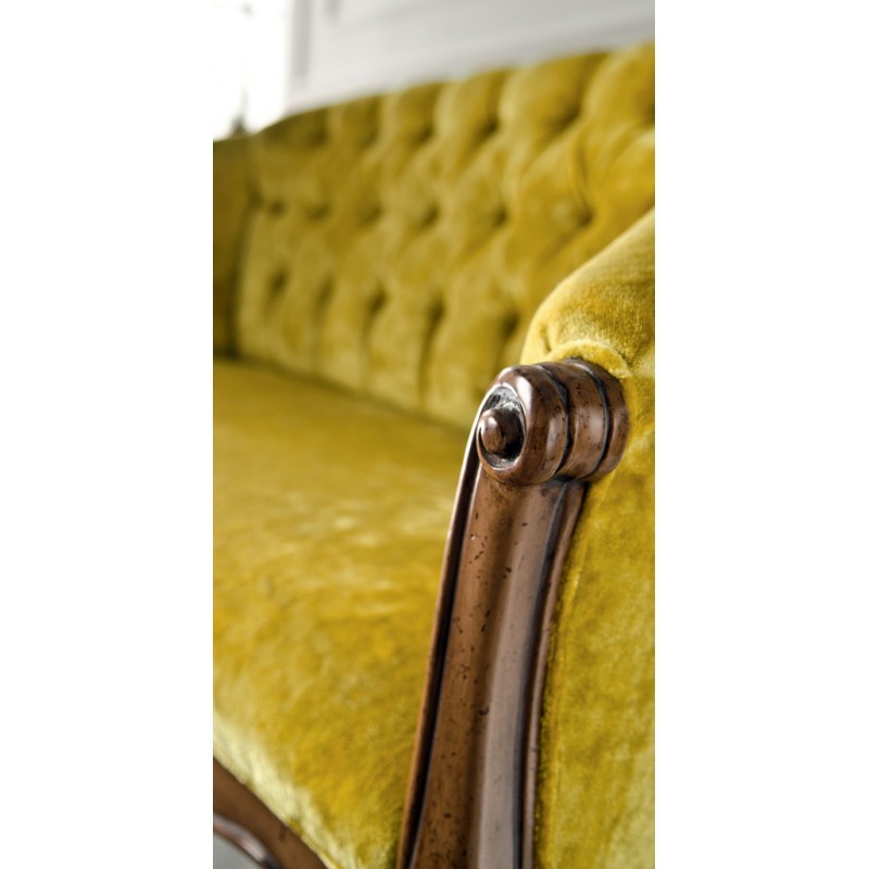 Divano classico in legno finitura bassano , fondo schienali e braccioli imbottiti in tessuto, schienale con cimasa e braccioli intagliati. Questo grande classico conferirà all'ambiente un tocco dallo stile retrò per renderlo ancora più speciale e ricercato. Ideale per interni classici e contemporanei che in un' arredo industriale o vintage.