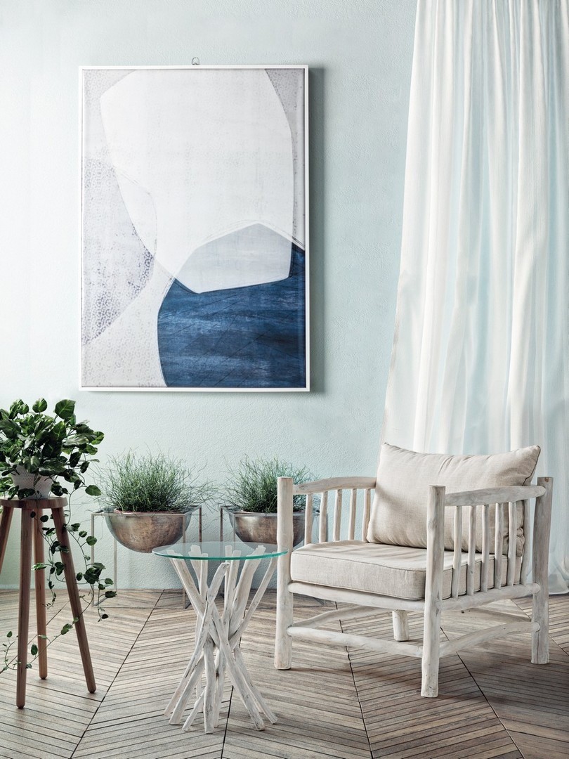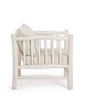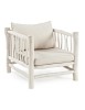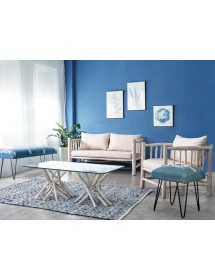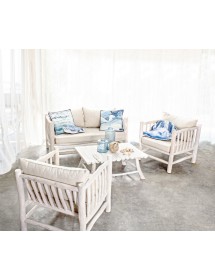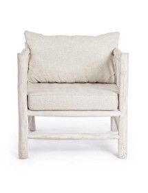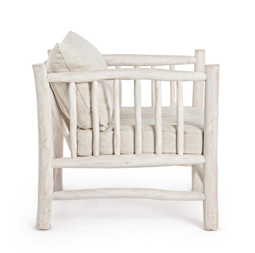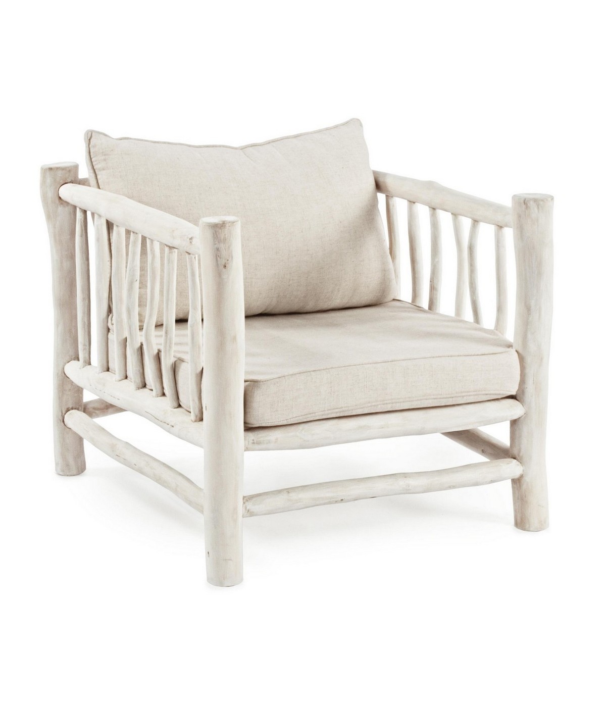 RAMI DI TEAK SBIANCATO CON FINITURA A BASE DI NITROCELLULOSA. CUSCINI SFODERABILI CON TESSUTO PER INTERNO (40% LINO, 60% COTONE). SOLO PER USO INTERNO. IMBALLO SENZA CARTONE.