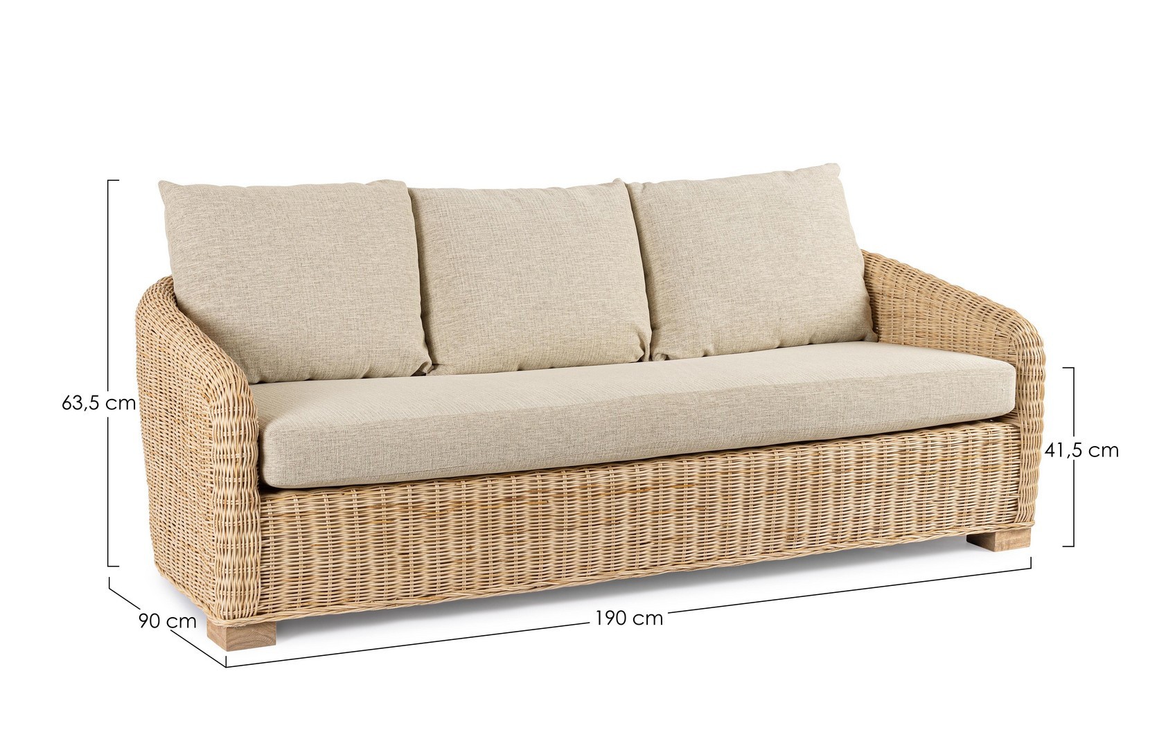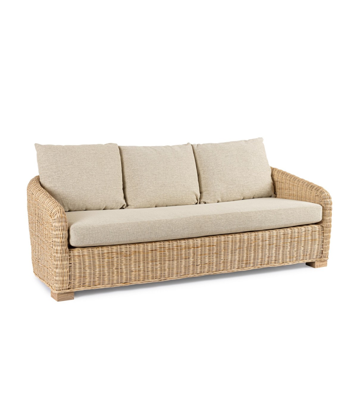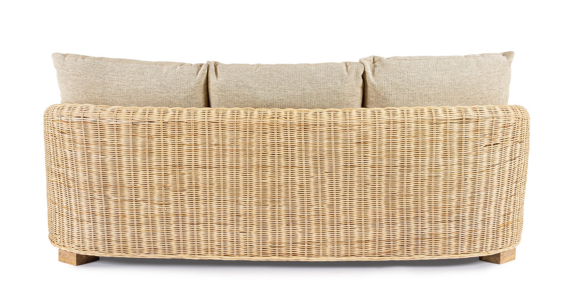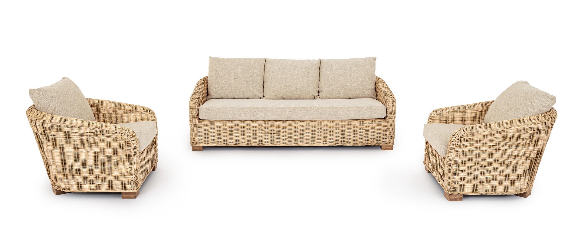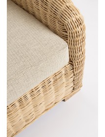 STRUTTURA ED INTRECCIO IN RATTAN, FINITURA NATURALE A BASE DI NITROCELLULOSA. CUSCINI SFODERABILI CON TESSUTO 100% POLIESTERE. PIEDINI IN LEGNO DI MANGO. SI RACCOMANDA DI NON ESPORRE IL MOBILE ALLA LUCE DIRETTA DEL SOLE E ALLE INTEMPERIE. IMBALLO SENZA CARTONE.