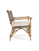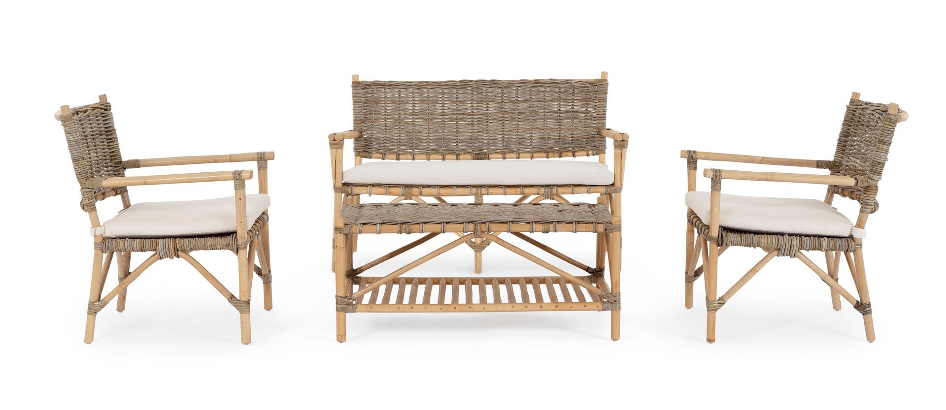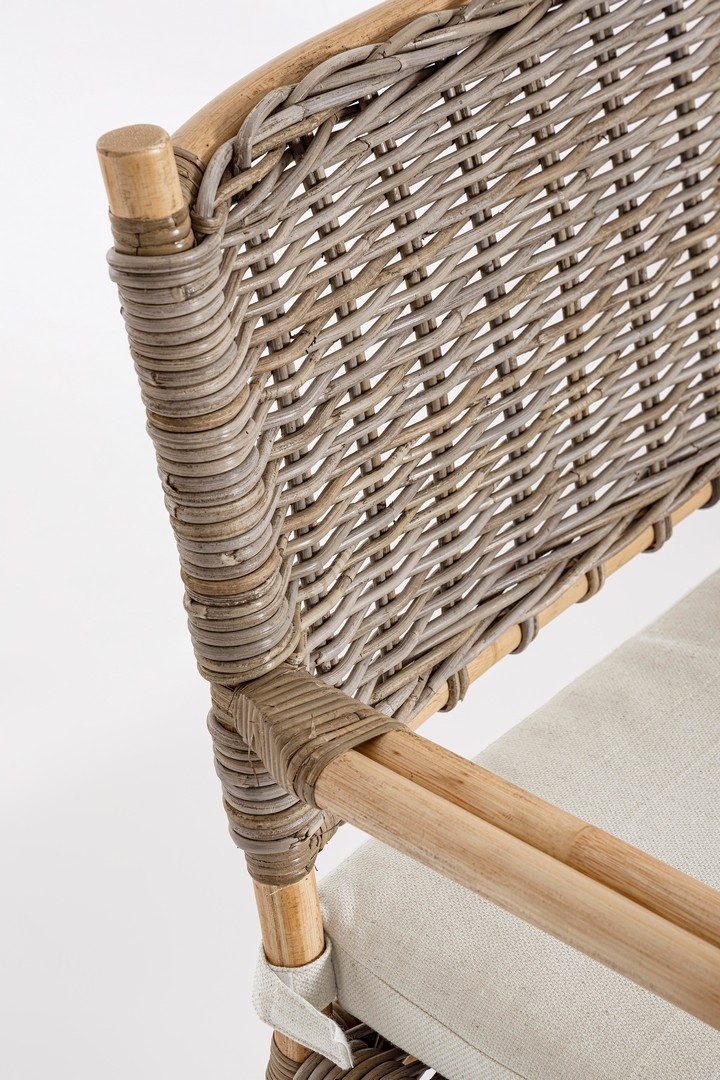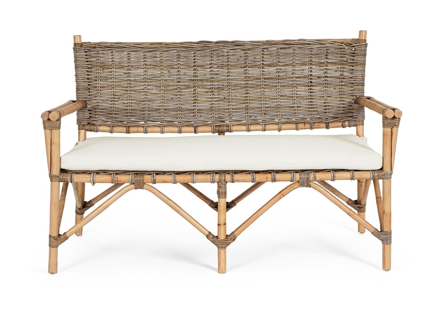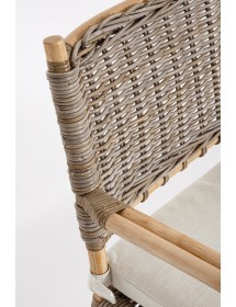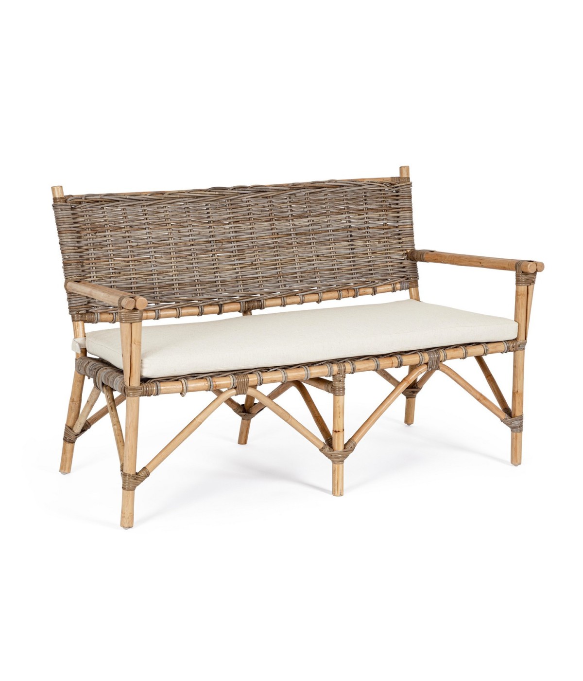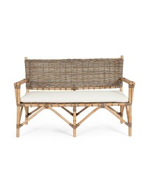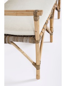 STRUTTURA IN RATTAN, INTRECCIO IN KUBU. FINITURA A BASE DI NITROCELLULOSA. CUSCINO SFODERABILE CON TESSUTO PER USO INTERNO (30% COTONE, 30% LINO, 40% POLIESTERE). SI RACCOMANDA DI NON ESPORRE L'ARTICOLO ALLA LUCE DIRETTA DEL SOLE E ALLE INTEMPERIE. IMBALLO SENZA CARTONE.