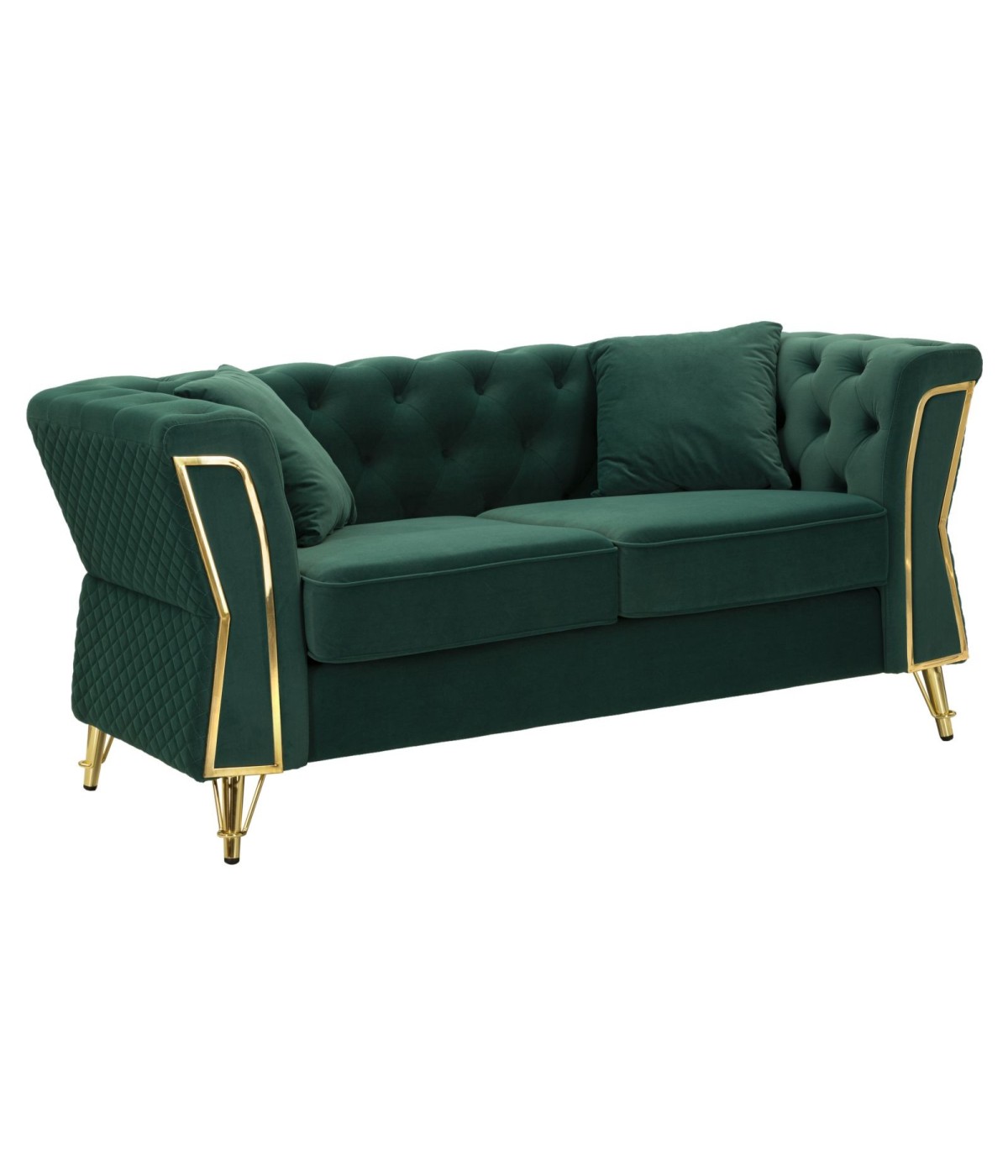 Divano due posti verde con gambe dorate da assemblare, rivestito in velluto trapuntato. Ideale per ambienti moderni e raffinati, aggiunge un tocco di lusso e comfort.