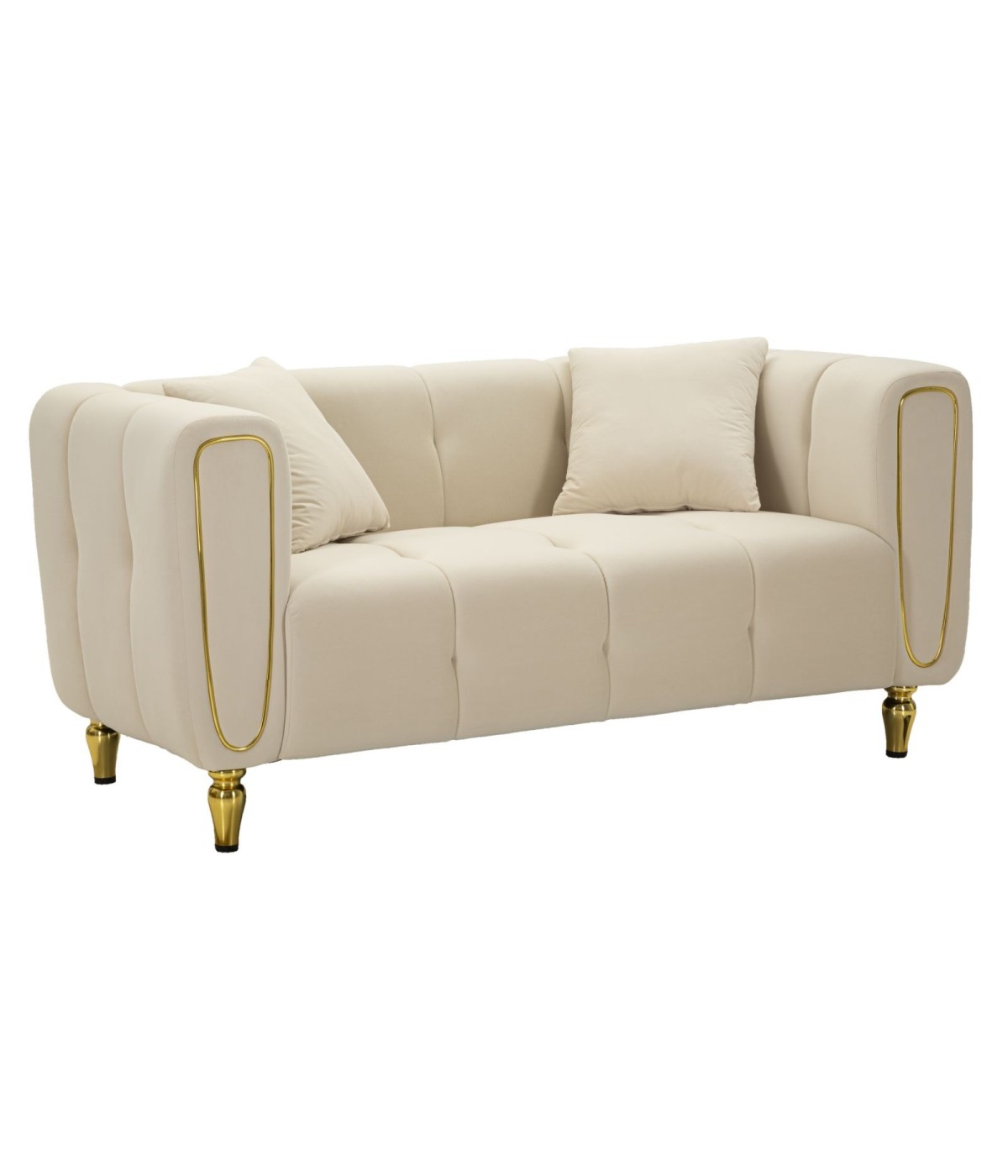 Divano due posti crema con gambe dorate da assemblare, rivestito in velluto trapuntato. Ideale per ambienti moderni e raffinati, aggiunge un tocco di lusso e comfort.