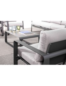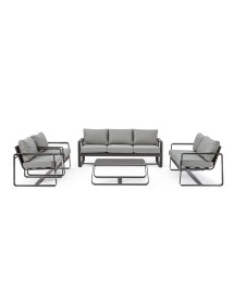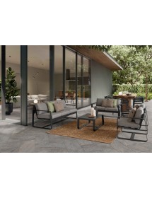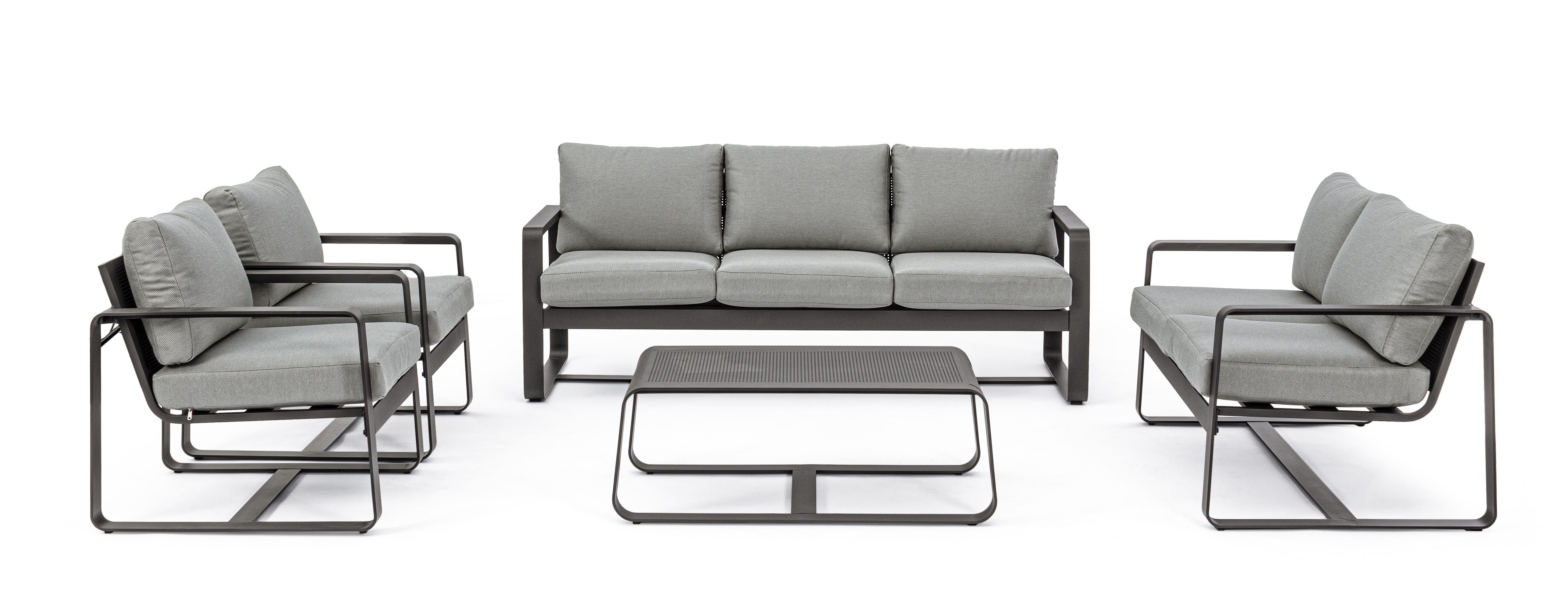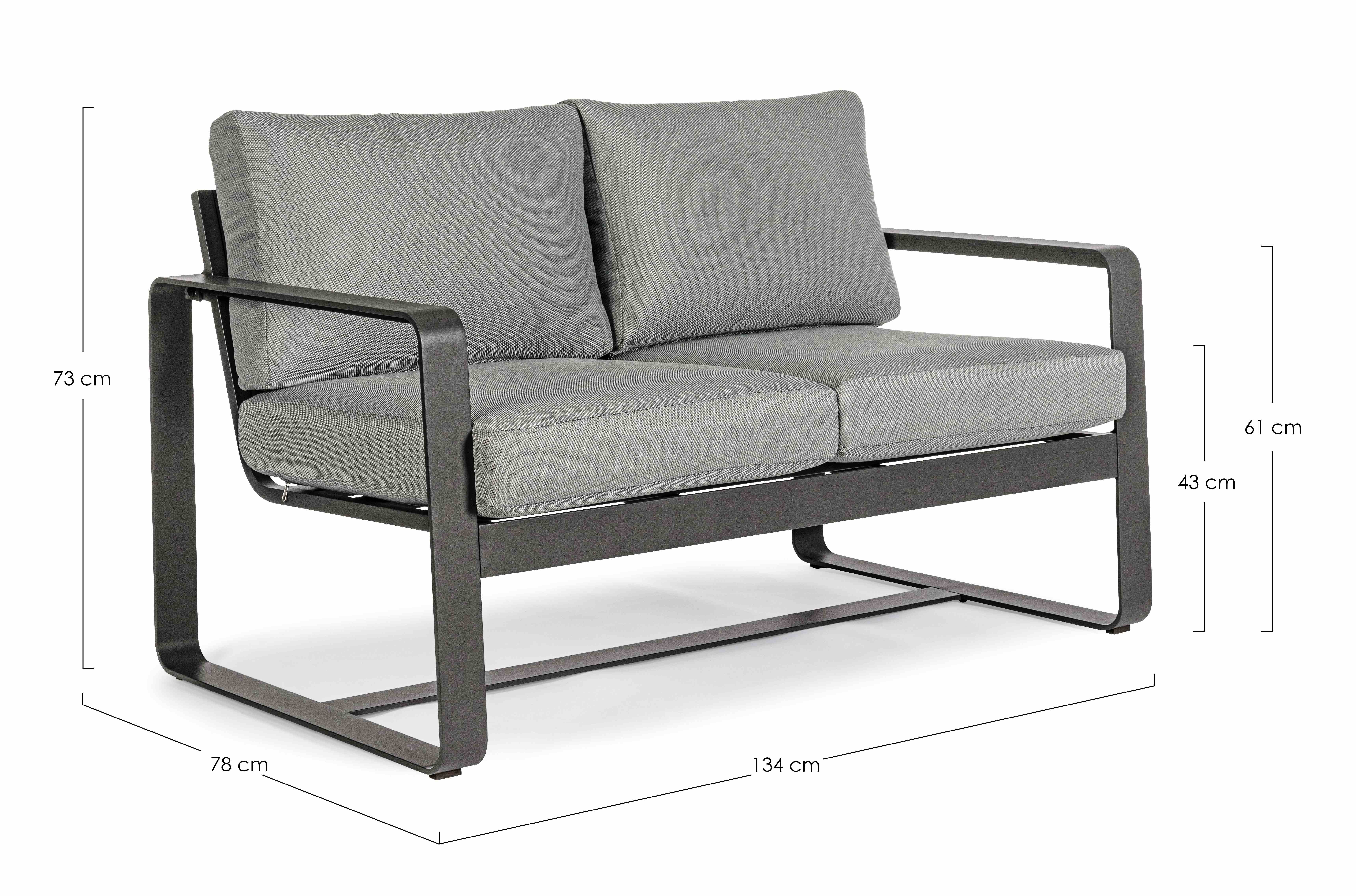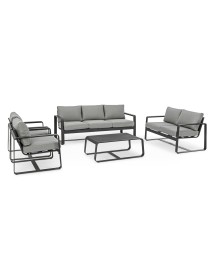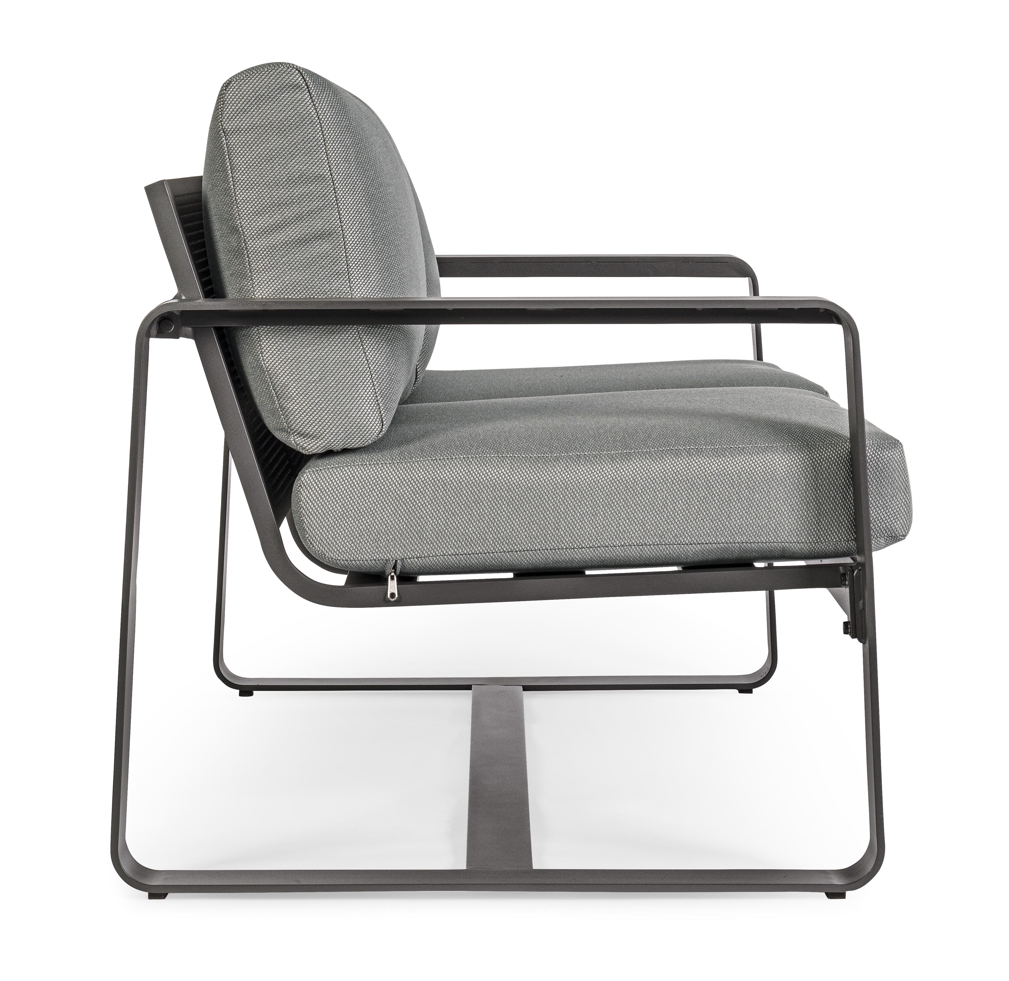 ALLUMINIO VERNICIATO A POLVERE (POLIESTERE). CUSCINI SEDUTA E SCHIENALE SFODERABILI CON TESSUTO IDROREPELLENTE OLEFIN (100% POLIPROPILENE). DA ASSEMBLARE.