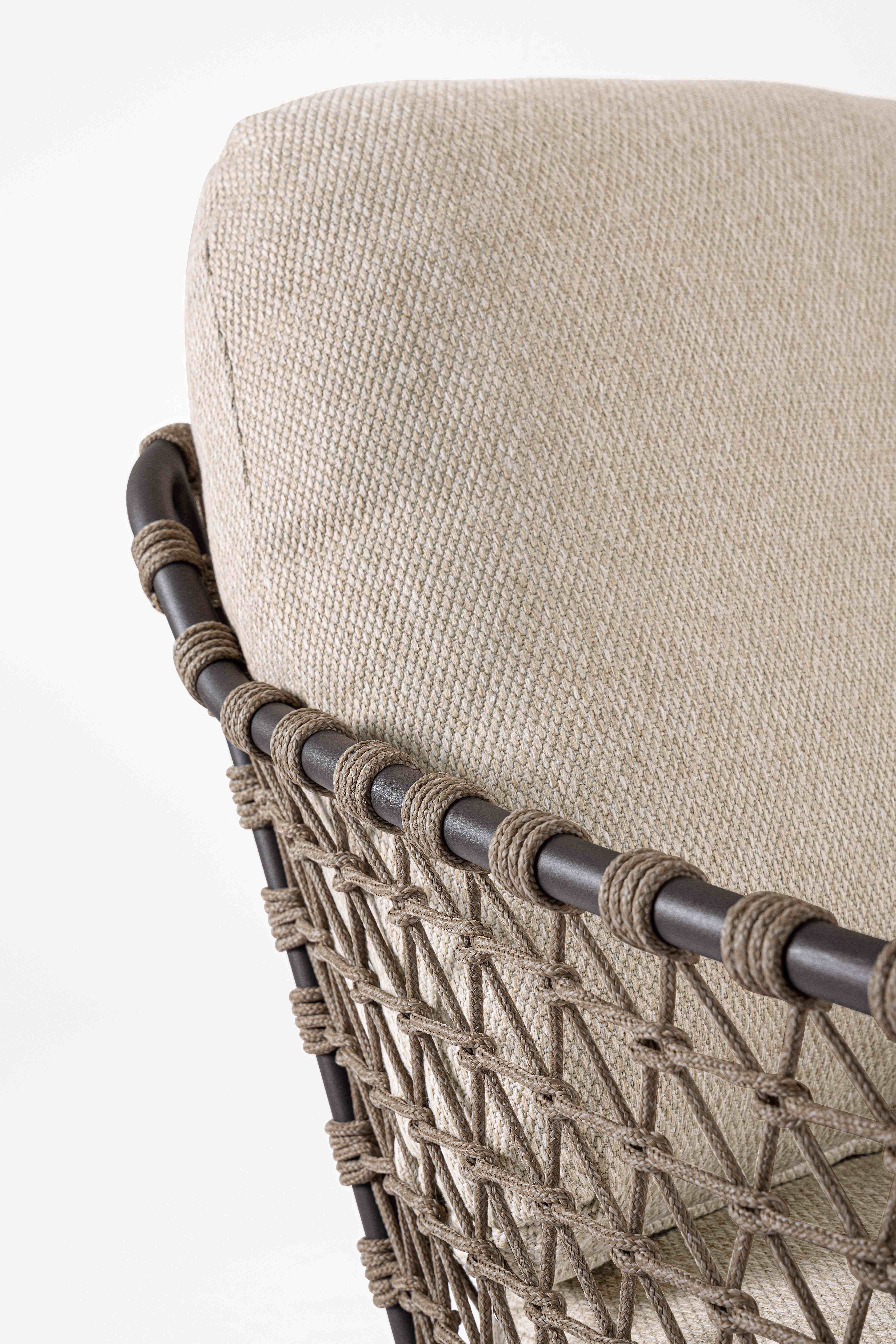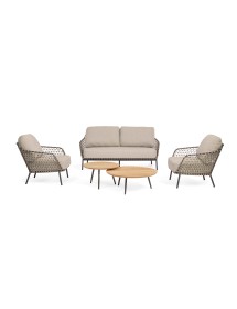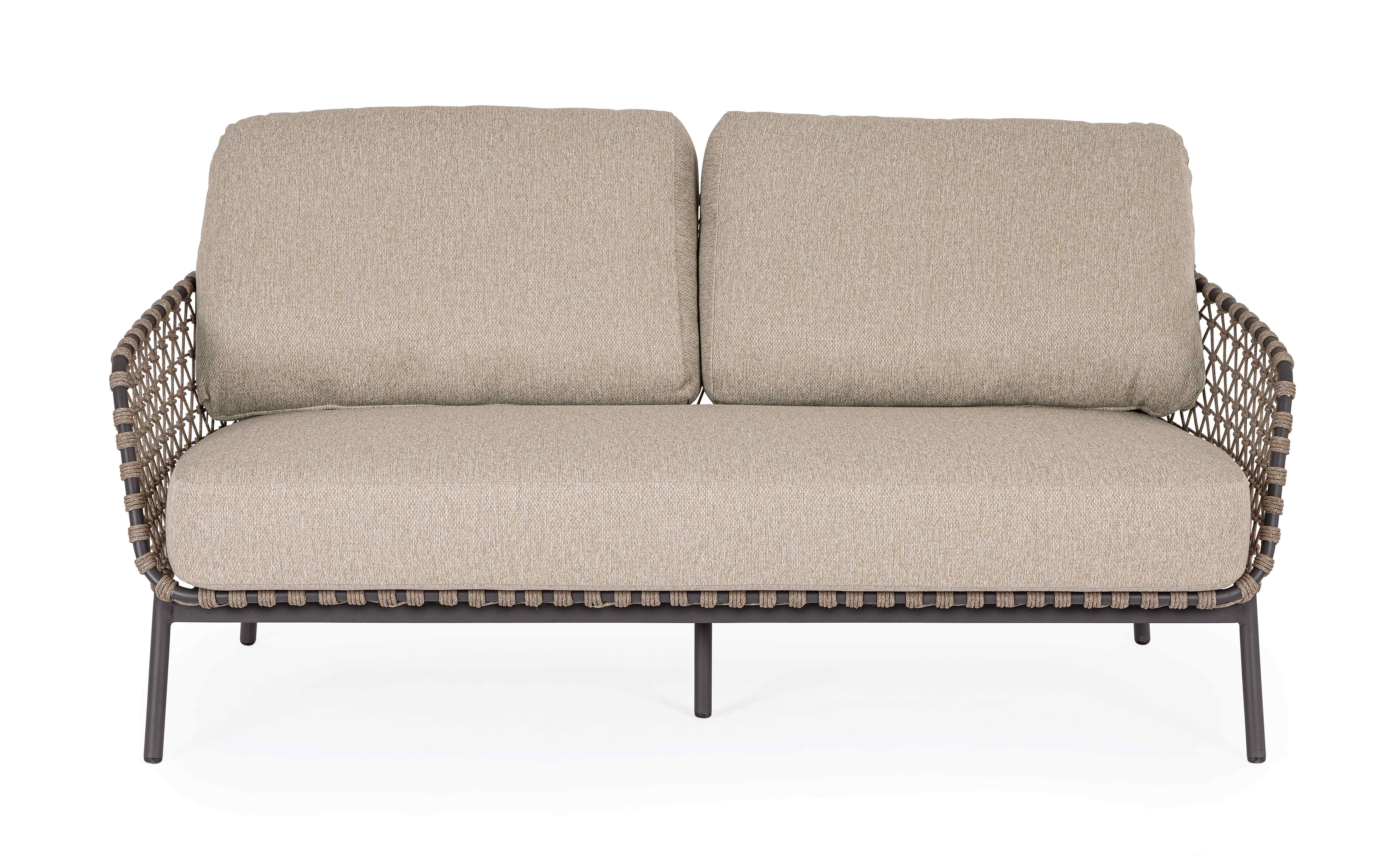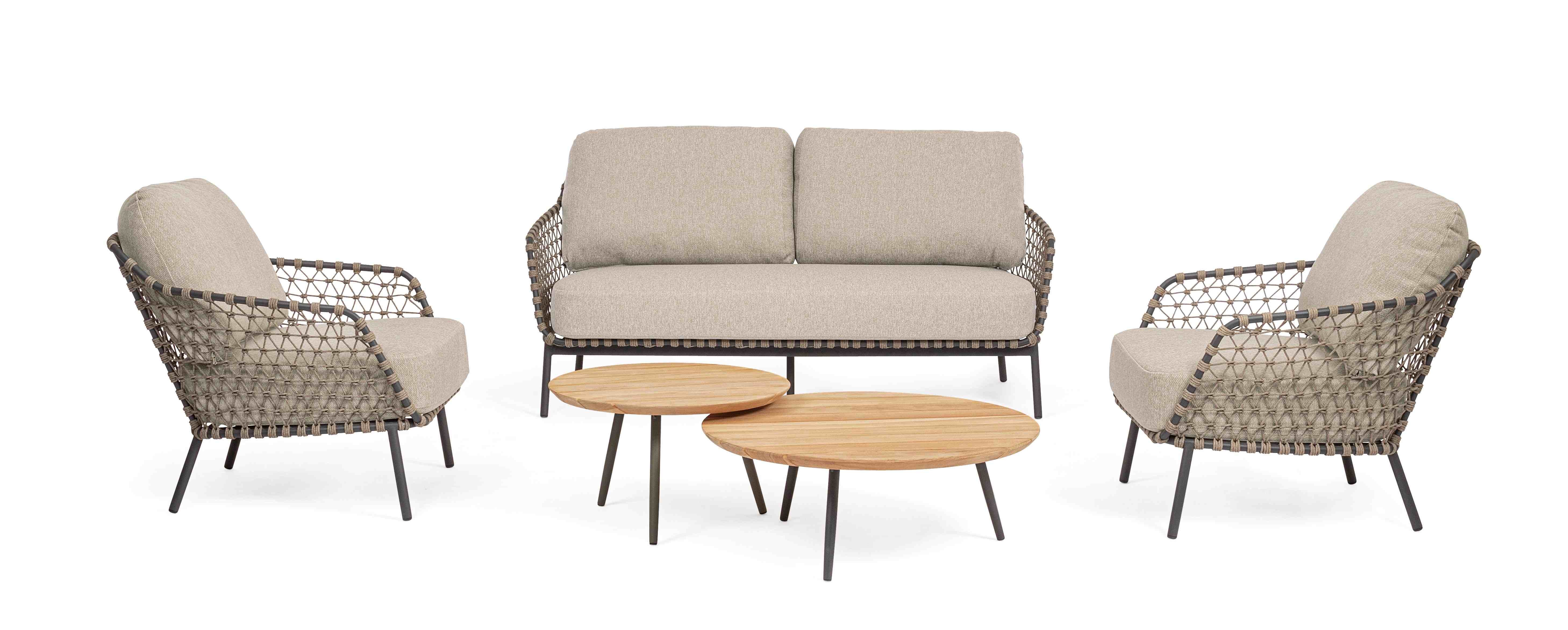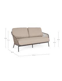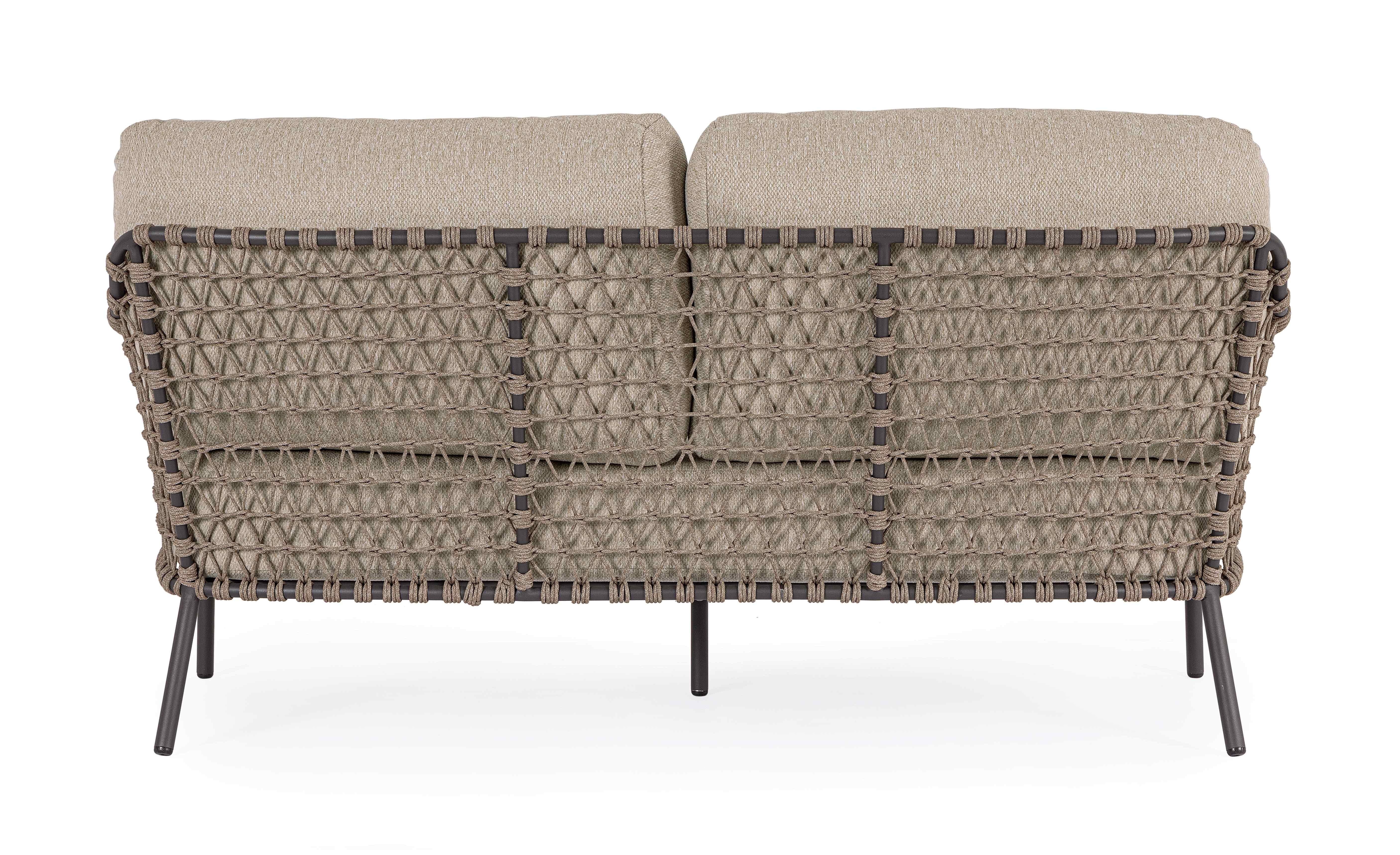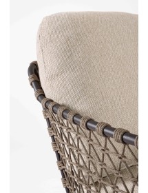 STRUTTURA IN ACCIAIO INOSSIDABILE (201). INTRECCIO PER ESTERNO IN CORDA (POLIPROPILENE). CUSCINI SFODERABILI IN TESSUTO IDROREPELLENTE SUNPROOF OLEFIN (100%POLIPROPILENE). PER EVITARE FENOMENI DI CORROSIONE, SI SCONSIGLIA DI POSIZIONARE MOBILI CON STRUTTURA IN ACCIAIO INOSSIDABILE 201 IN LUOGHI AD ALTA SALINITÀ ( AMBIENTI MARINI ).
