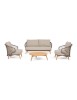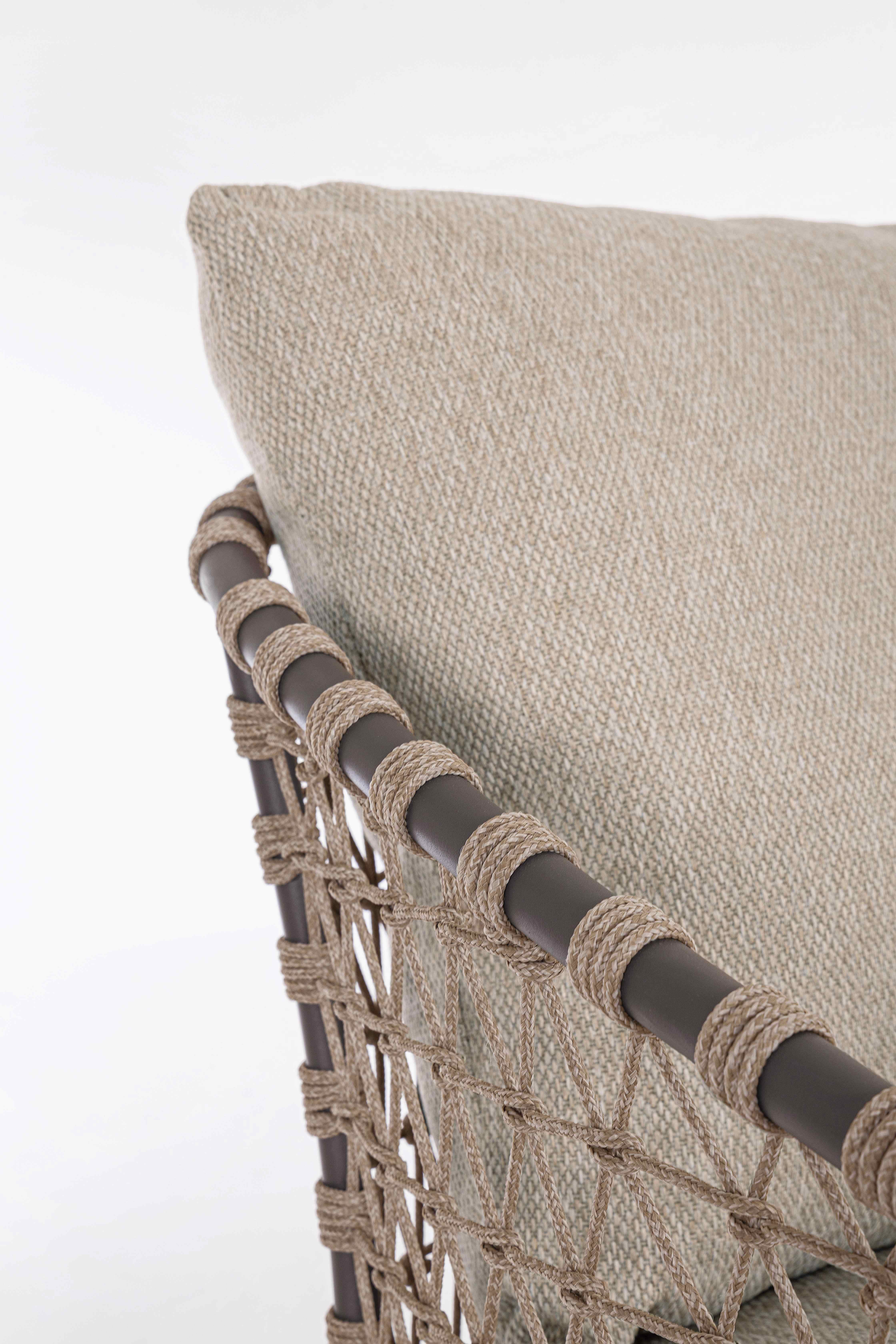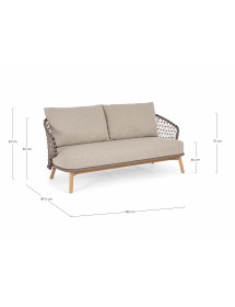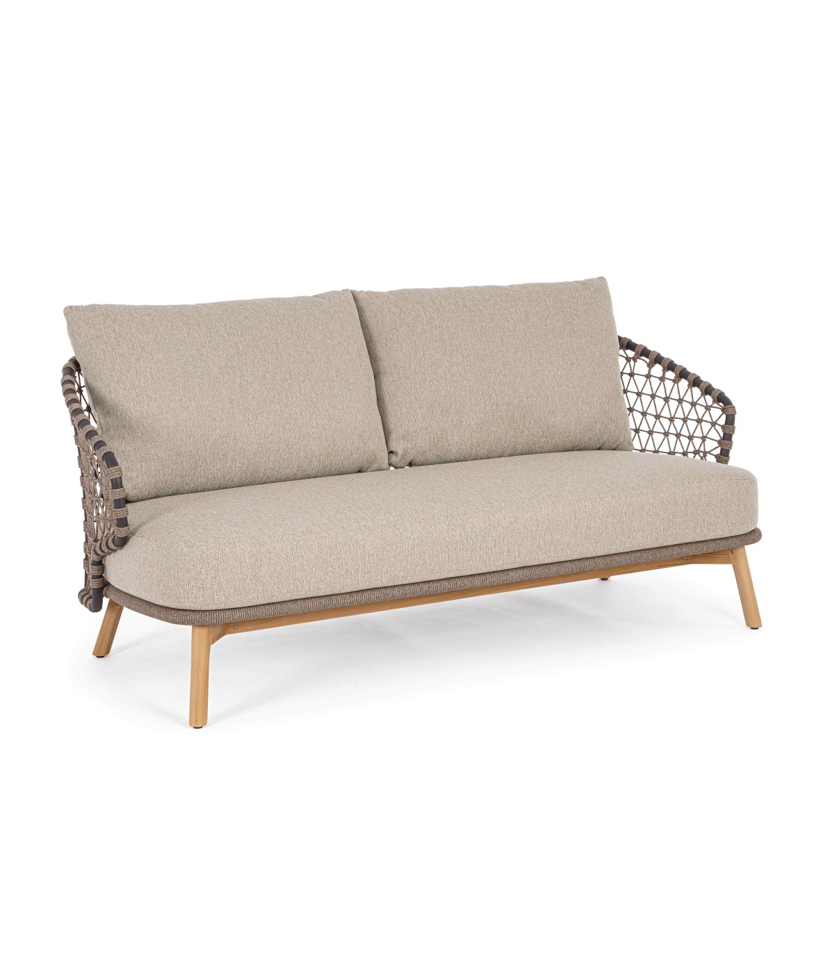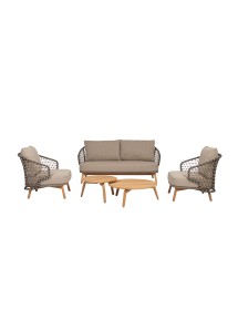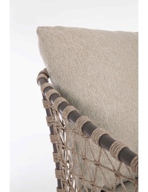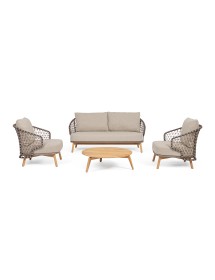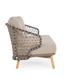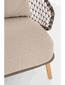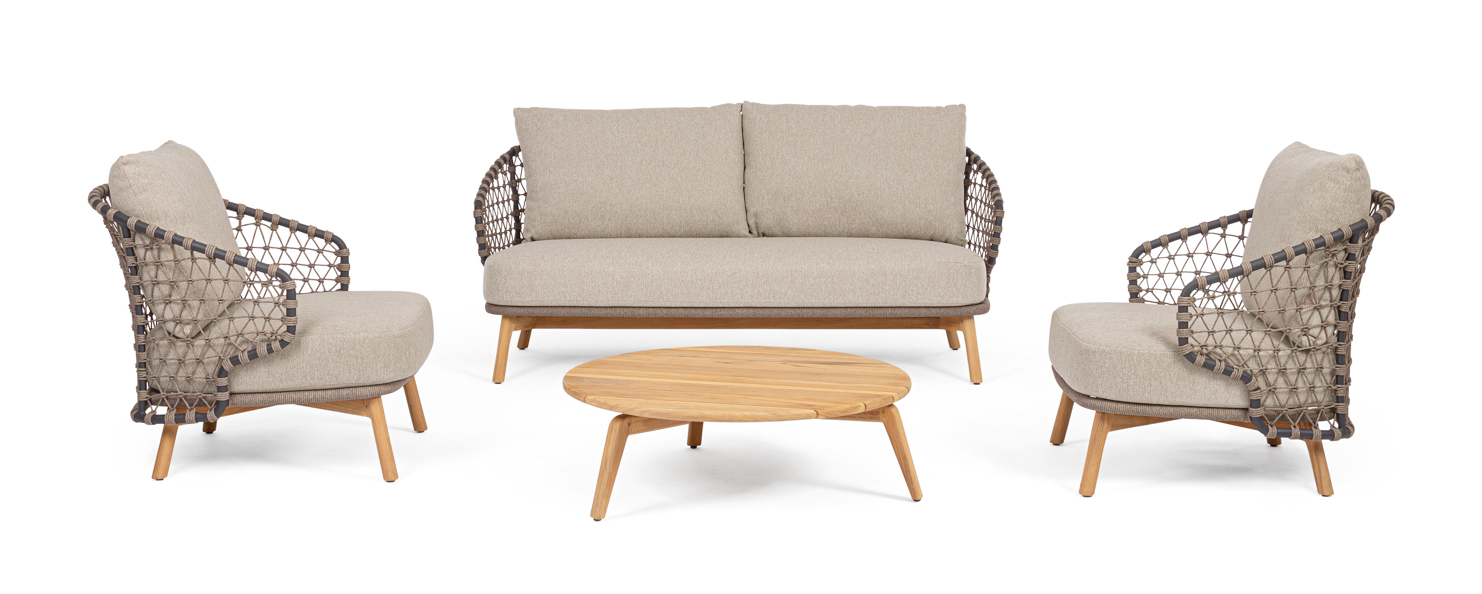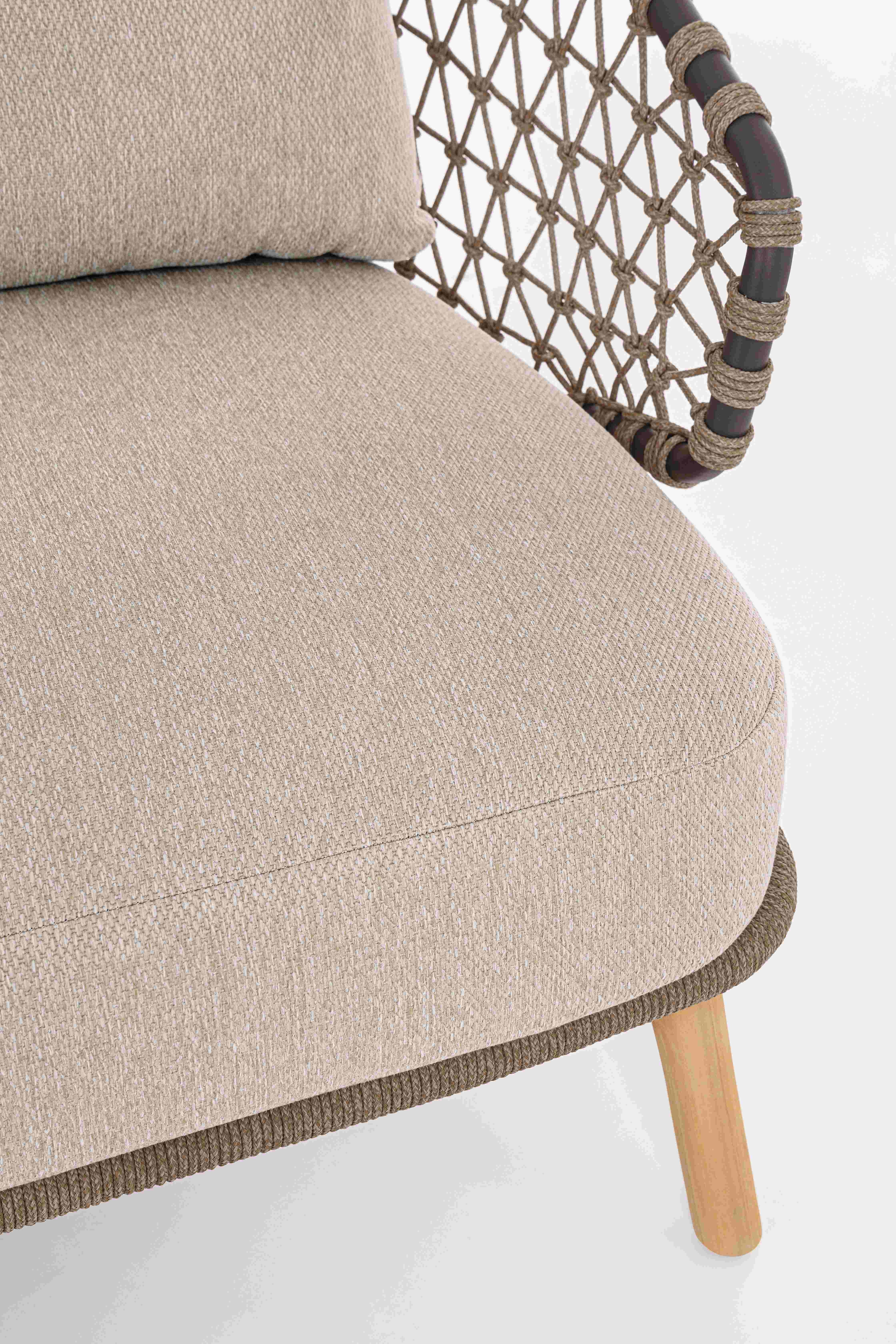 STRUTTURA IN ALLUMINIO VERNICIATA A POLVERE (POLIESTERE). GAMBE IN TEAK - SVLK (LEGNO CERTIFICATO PROVENIENTE DA FORESTE SOSTENIBILI). INTRECCIO PER ESTERNO IN CORDA (POLIPROPILENE). CUSCINI SFODERABILI IN TESSUTO IDROREPELLENTE SUNPROOF OLEFIN (100%POLIPROPILENE). VITERIA IN ACCIAIO INOSSIDABILE. GAMBE DA ASSEMBLARE.