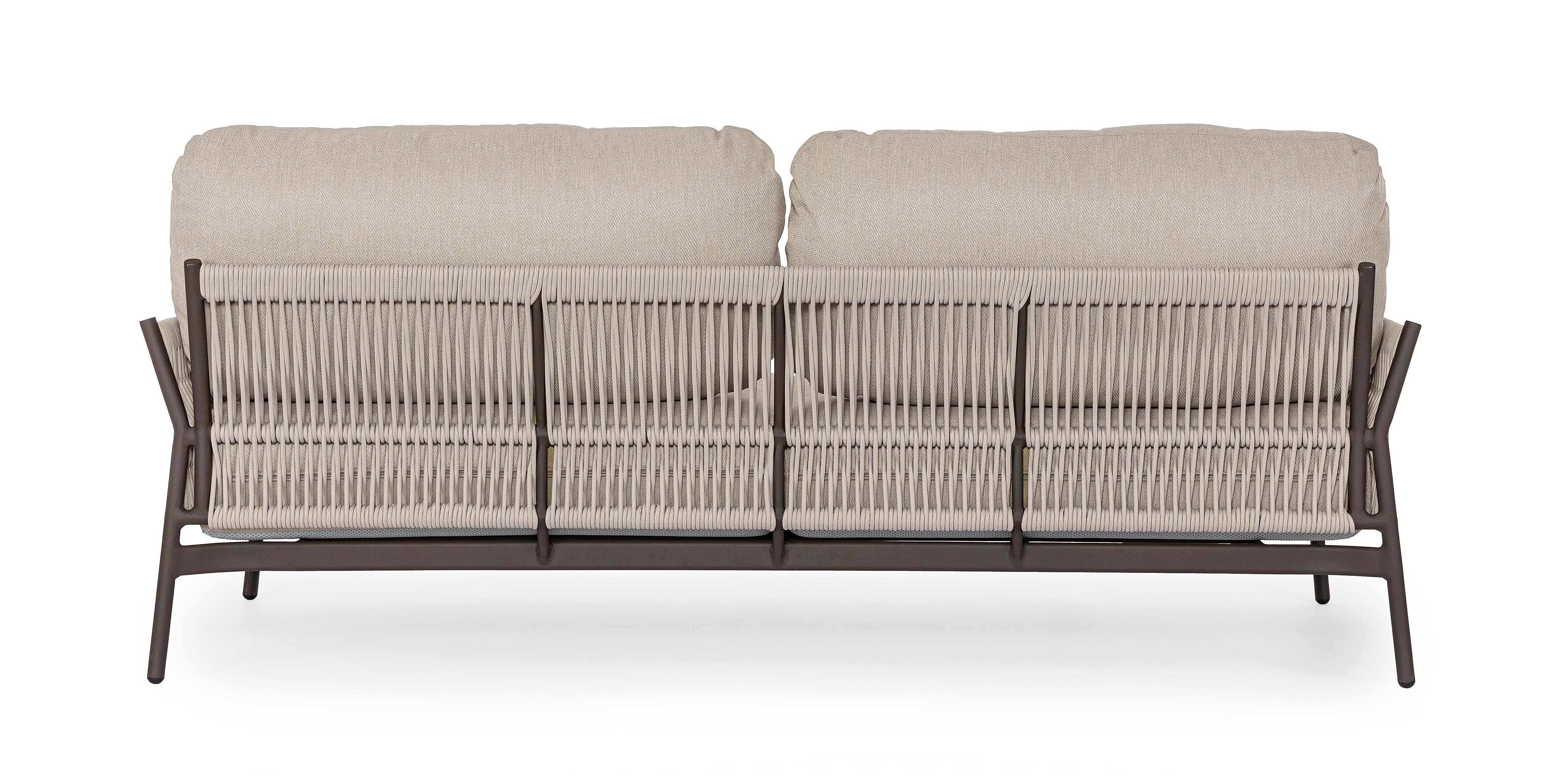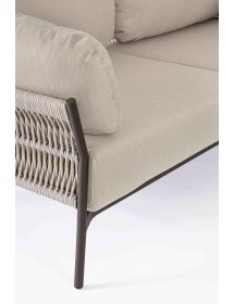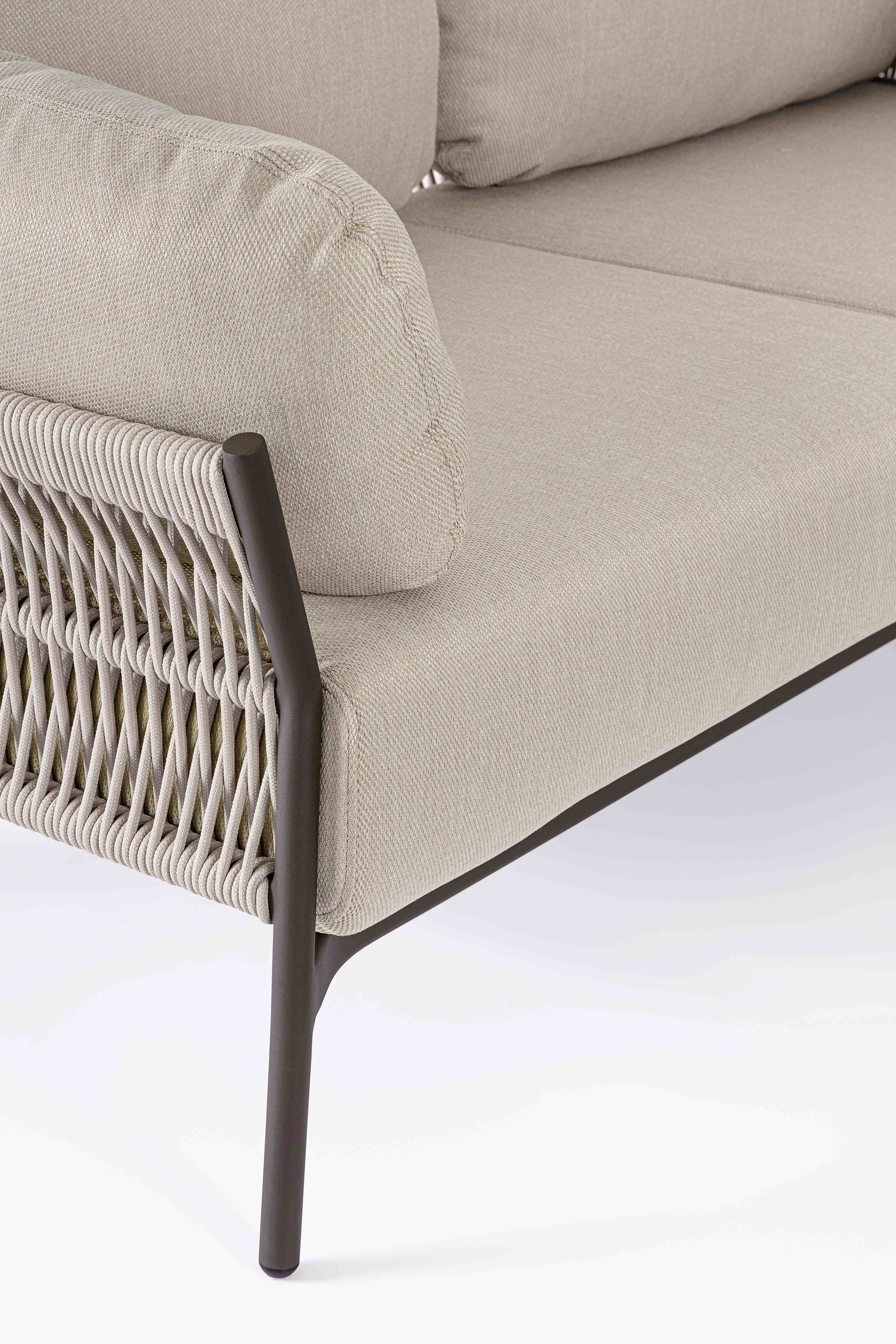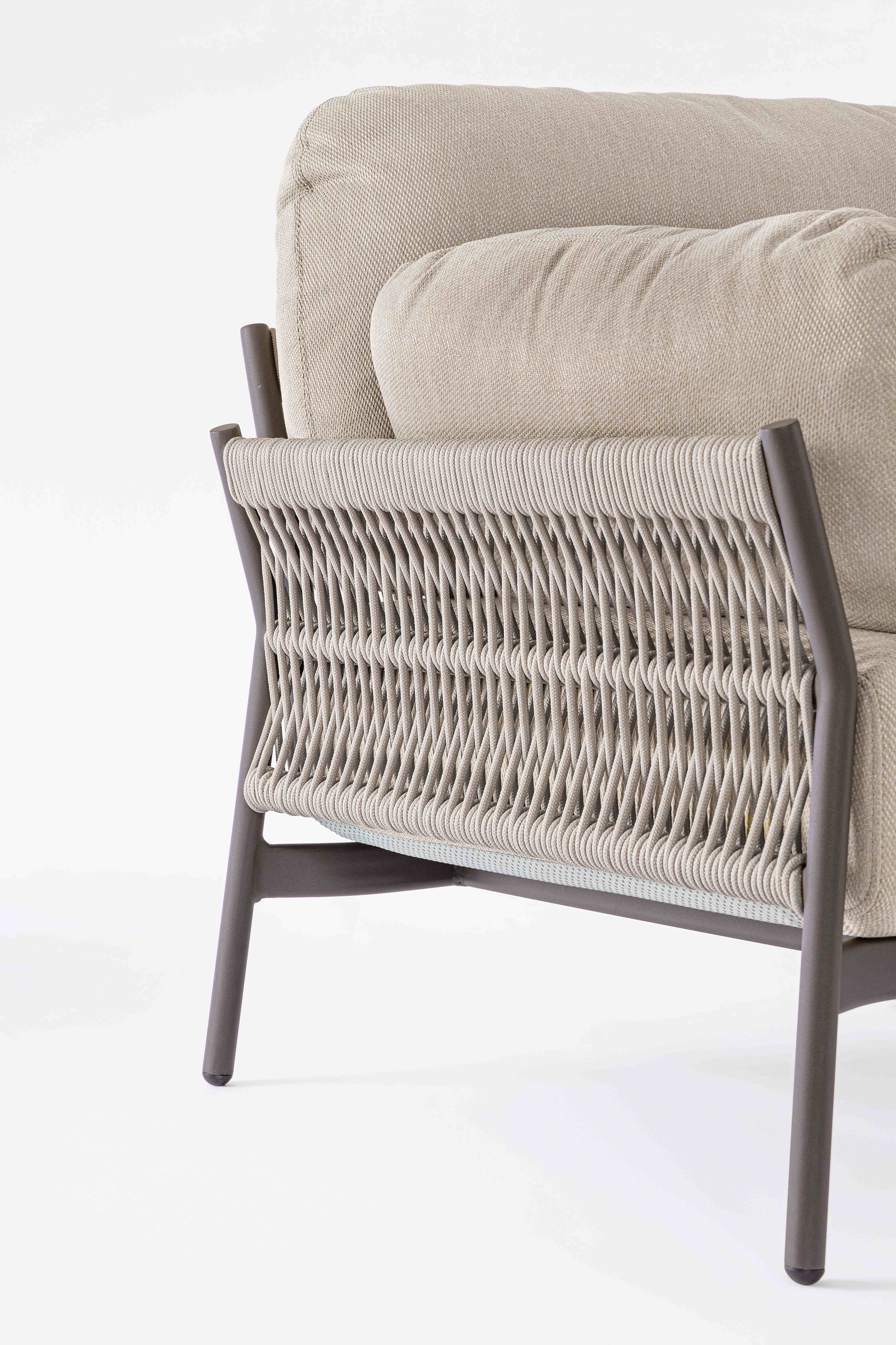 STRUTTURA IN ALLUMINIO VERNICIATO A POLVERE (POLIESTERE). INTRECCIO IN CORDA OLEFIN (100% POLIPROPILENE). CUSCINI SEDUTA E SCHIENALE SFODERABILI IN TESSUTO IDROREPELLENTE OLEFIN (100% POLIPROPILENE).