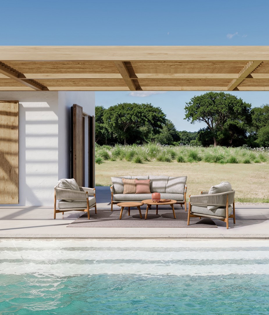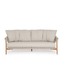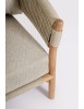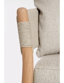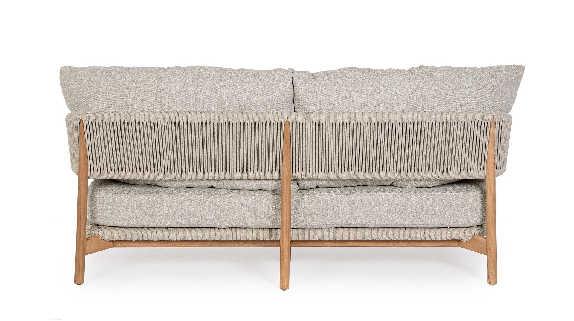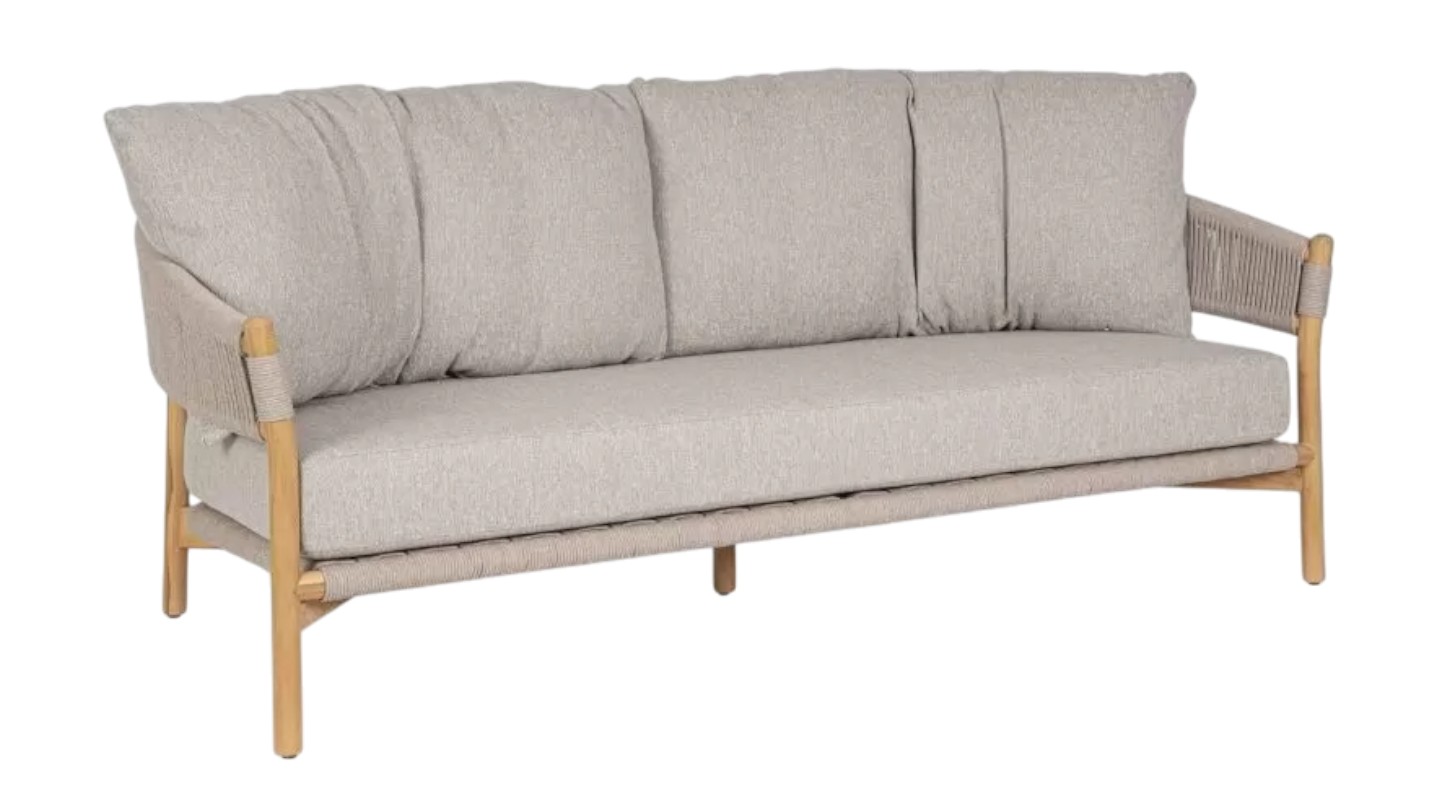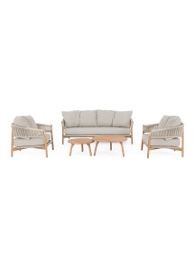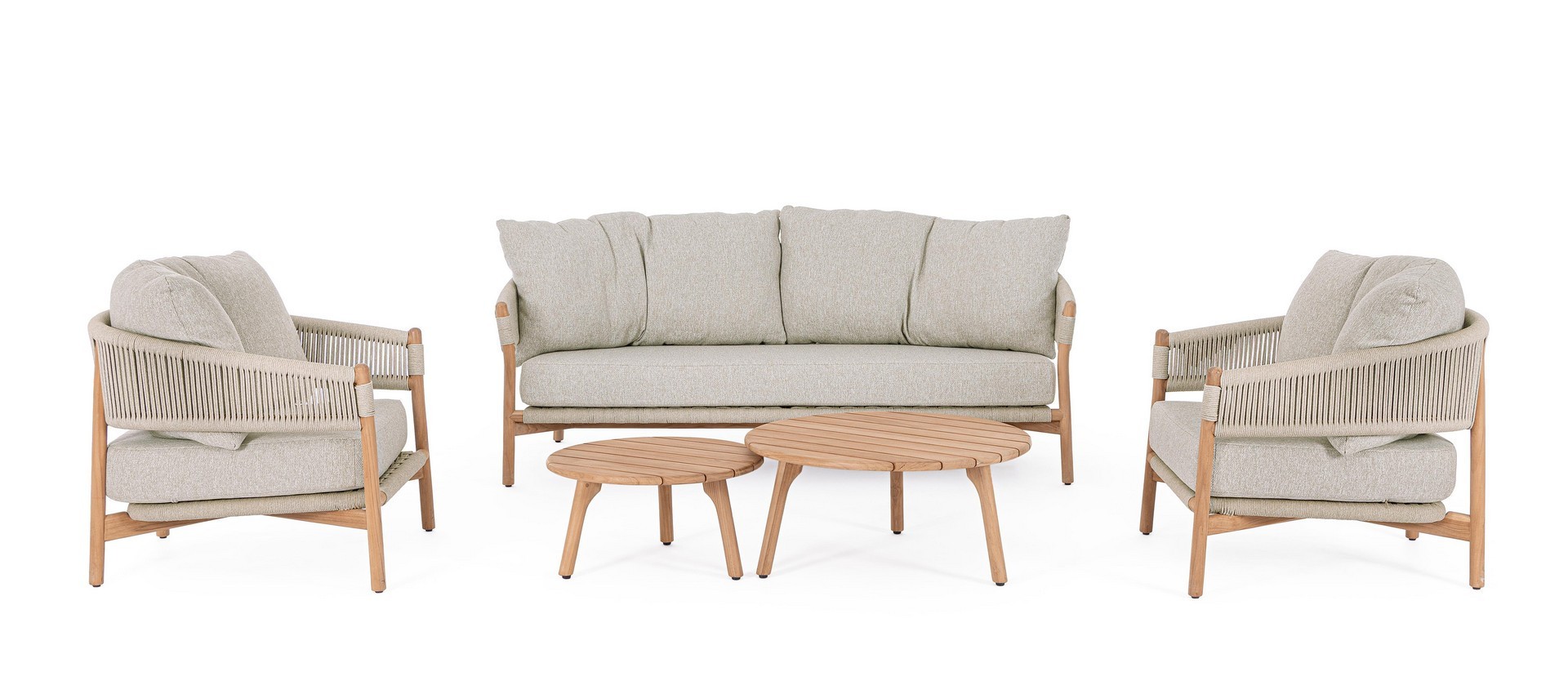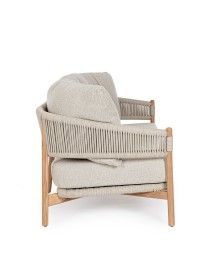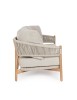 STRUTTURA IN TEAK - SVLK (LEGNO CERTIFICATO PROVENIENTE DA FORESTE SOSTENIBILI). INTRECCIO PER ESTERNO IN CORDA (POLIPROPILENE). CUSCINI SFODERABILI IN TESSUTO IDROREPELLENTE SUNPROOF OLEFIN (100%POLIPROPILENE).