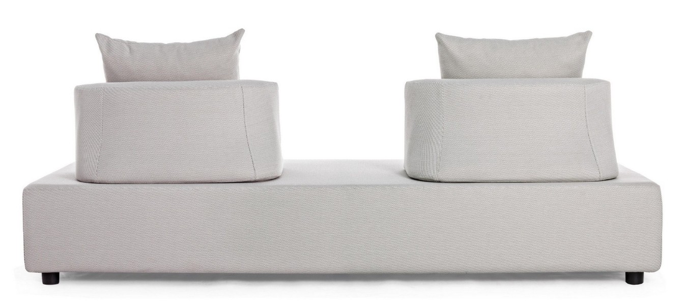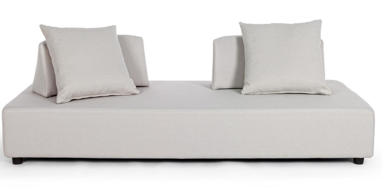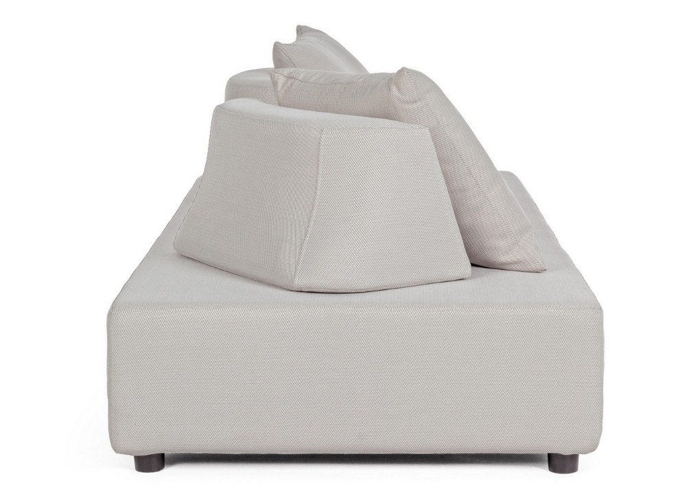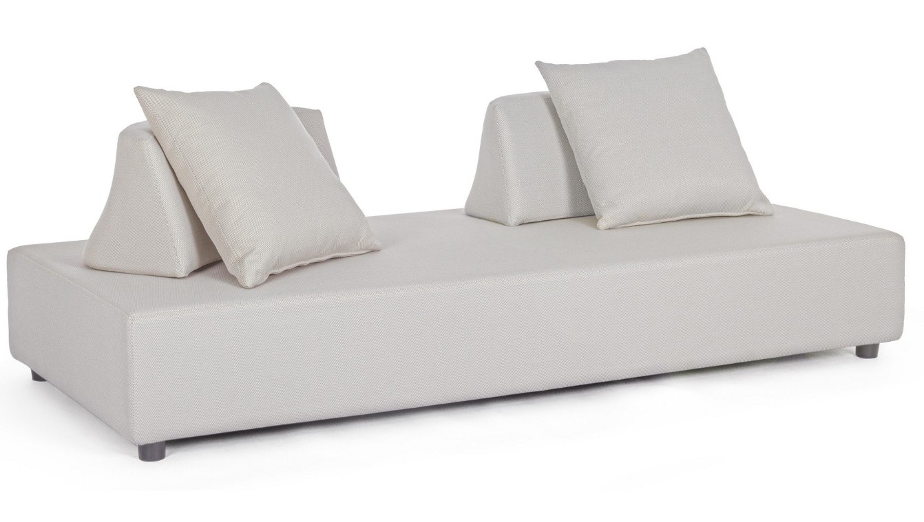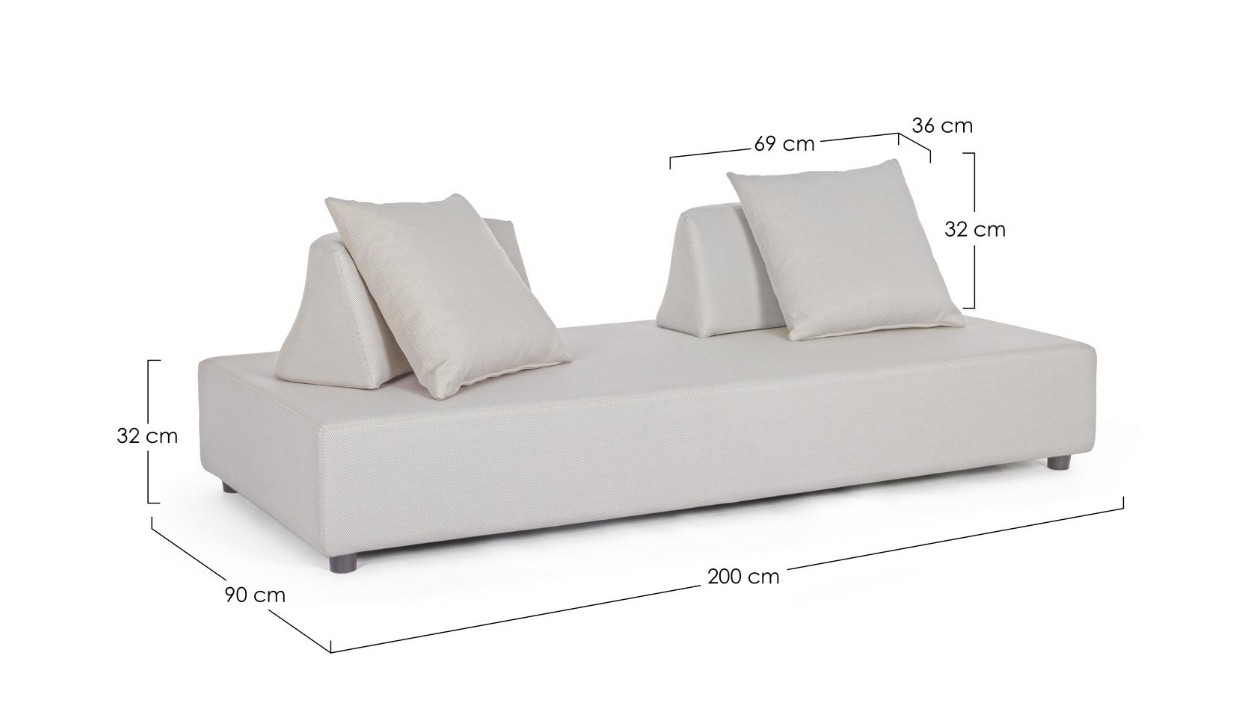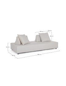 DIVANO CON STRUTTURA IN ALLUMINIO. SCHIENALI REMOVIBILI CON STRUTTURA IN ACCIAIO, GALVANIZZATA A CALDO E VERNICIATA A POLVERE (POLIESTERE). SEDUTA, SCHIENALI E CUSCINI SFODERABILI IN TESSUTO PER ESTERNO OLEFIN (100% POLIPROPILENE, 285GR/M2), IDROREPELLENTE E RESISTENTE AI RAGGI UV (GRADO 7), IMPERMEABILIZZATO INTERNAMENTE CON RIVESTIMENTO IN TESSUTO (POLIURETANO). IMBOTTITURA IN SCHIUMA POLIURETANICA, DENSITA' SEDUTA 38KG/M3, SCHIENALI 20KG/M3. ARTICOLO COMPOSTO DA: N °1 DIVANO, N°2 SCHIENALI MEZZALUNA, N°2 CUSCINETTI.
