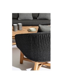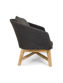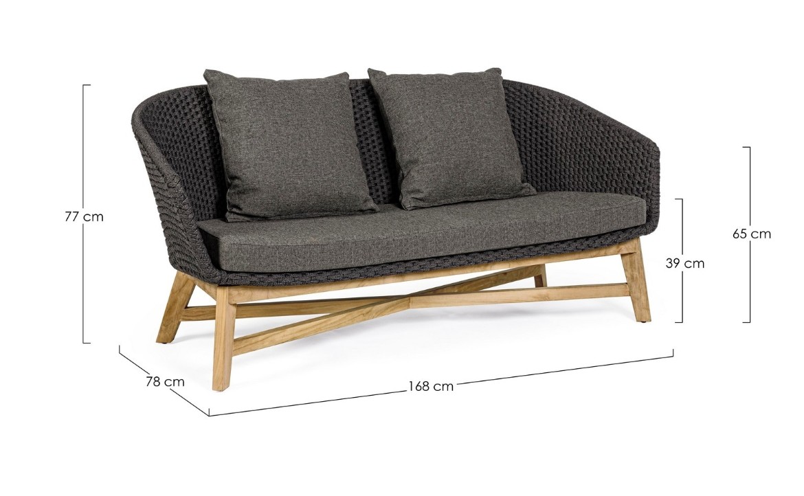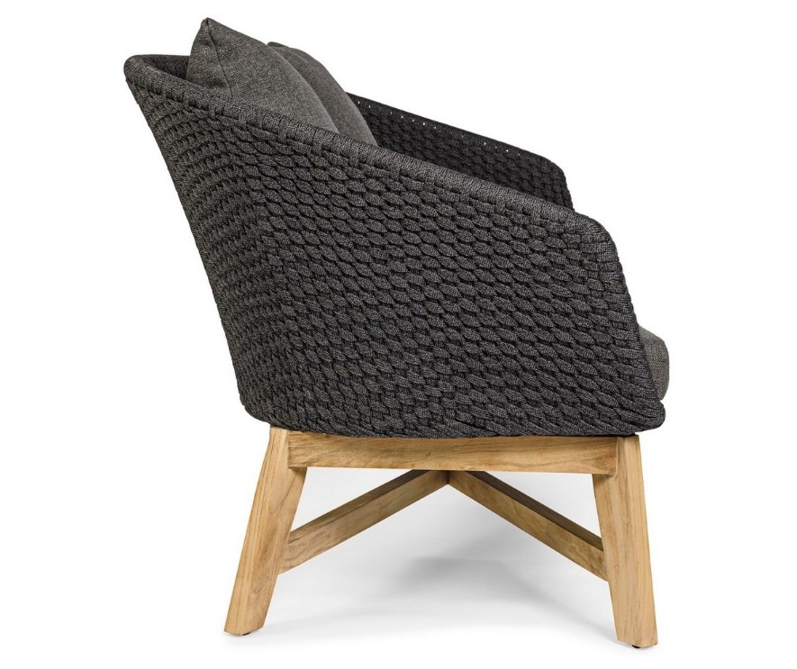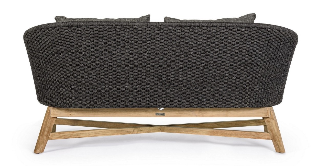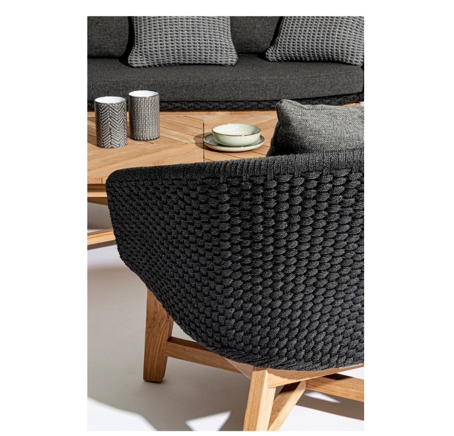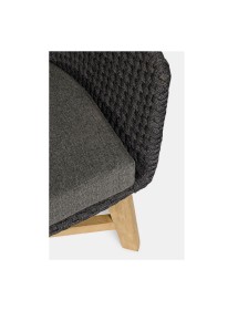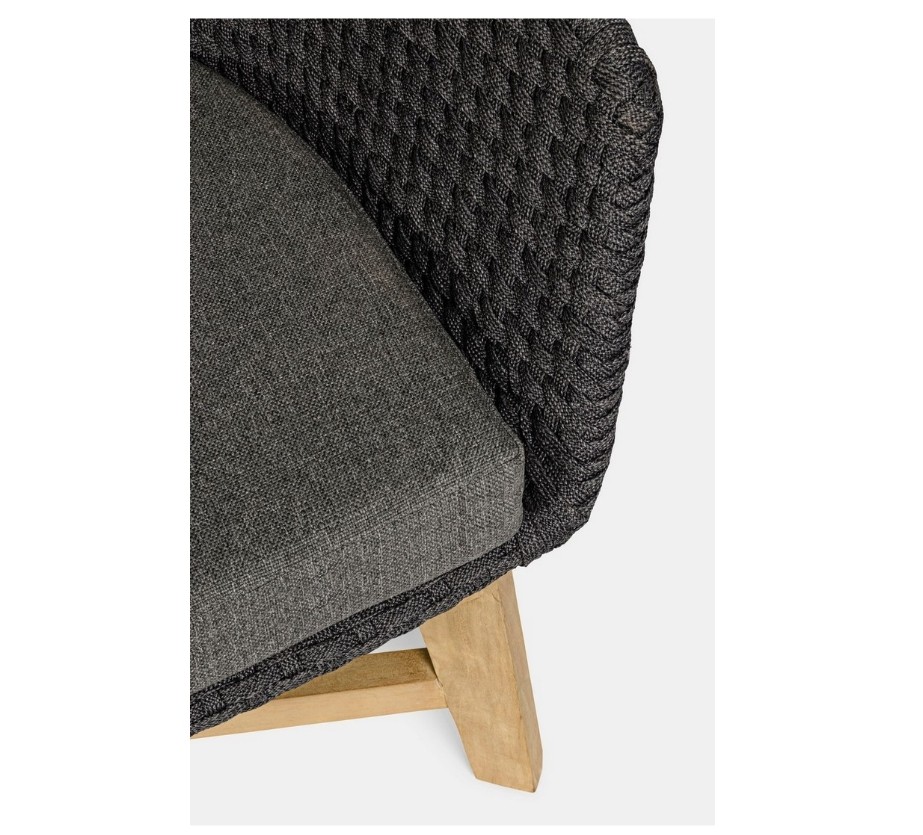 SEDUTA CON STRUTTURA IN ALLUMINIO VERNICIATA A POLVERE (POLIESTERE). INTRECCIO IN CORDA OLEFIN (100% POLIPROPILENE). CUSCINO SEDUTA E SCHIENALE SFODERABILE IN TESSUTO IDROREPELLENTE SUNPROOF OLEFIN (100% POLIPROPILENE). GAMBE IN TEAK - SVLK (LEGNO CERTIFICATO PROVENIENTE DA FORESTE SOSTENIBILI). VITERIA IN ACCIAIO GALVANIZZATO. GAMBE DA ASSEMBLARE. ATTENZIONE: PRIMA DI PROCEDERE AL MONTAGGIO, ASSICURARSI CHE LA NUMERAZIONE SEDUTA-GAMBE COINCIDA.