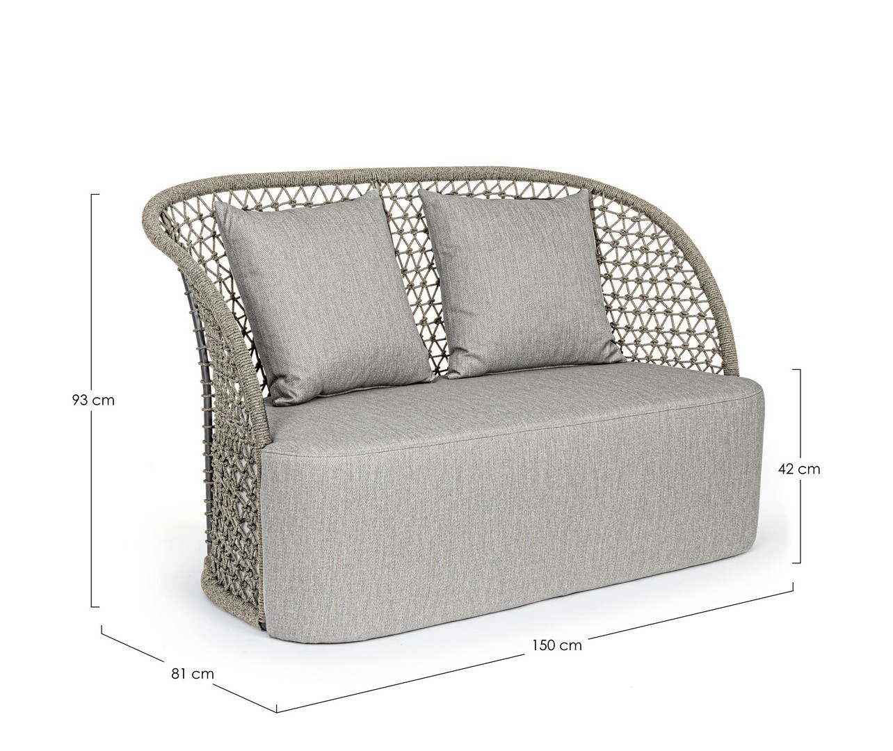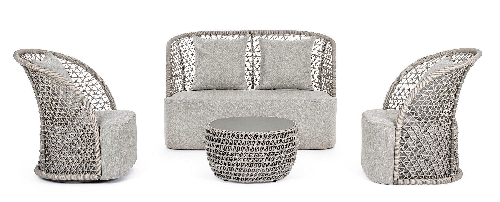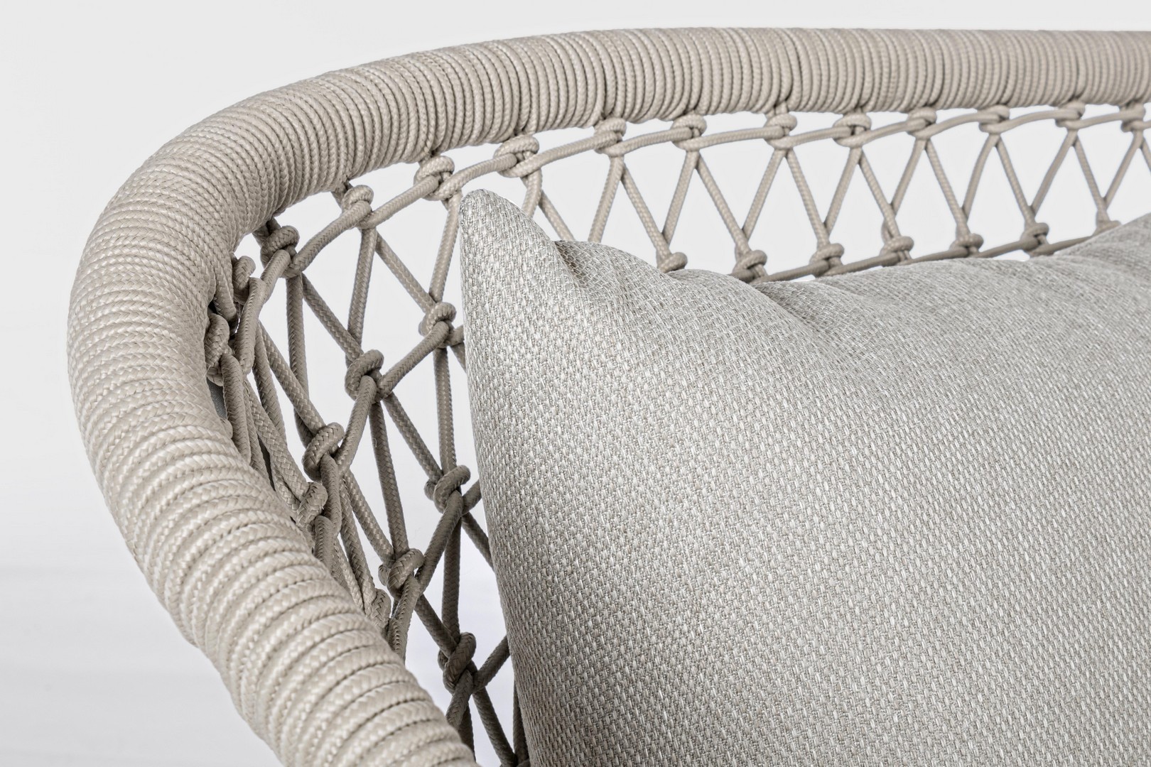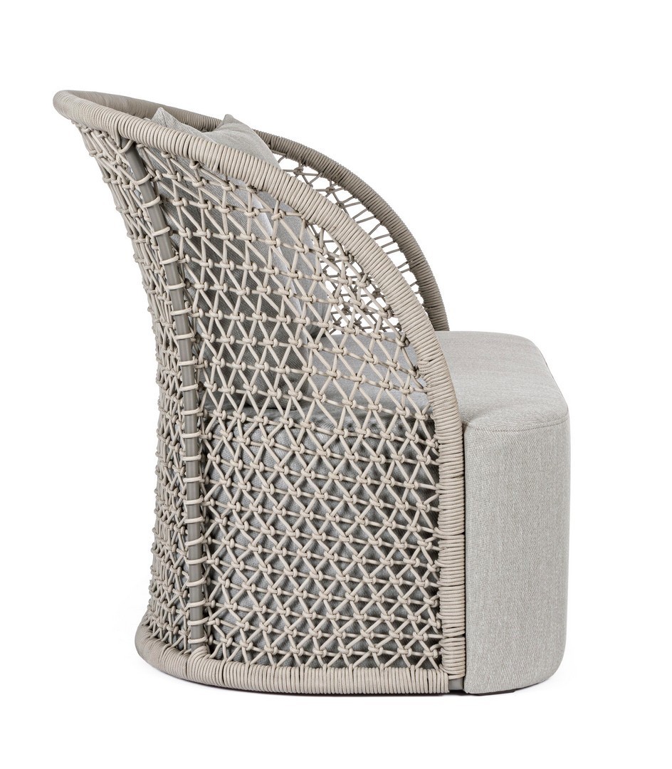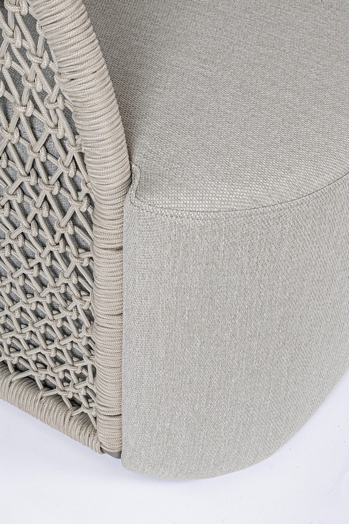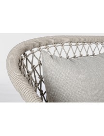 STRUTTURA IN ALLUMINIO VERNICIATO A POLVERE (POLIESTERE), INTRECCIO CON CORDA IN OLEFIN (100% POLIPROPILENE). SEDUTA CON IMBOTTITURA IMPERMEABILIZZATA, RIVESTIMENTO NON SFODERABILE CON TESSUTO PER ESTERNO IN OLEFIN (100% POLIPROPILENE, 285G/M2),IDROREPELLENTE E RESISTENTE AI RAGGI UV (GRADO 7). CUSCINO SCHIENALE SFODERABILE CON TESSUTO OLEFIN.