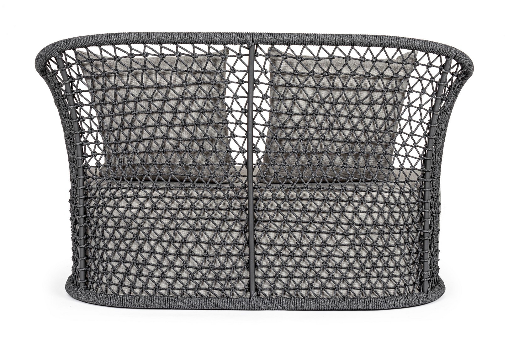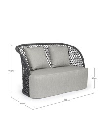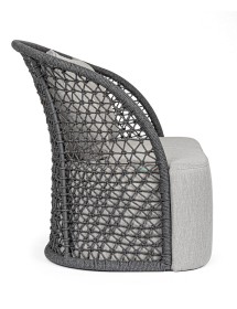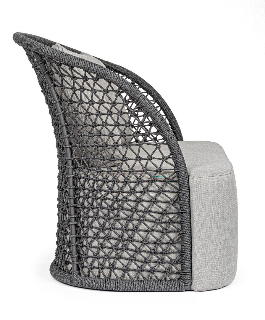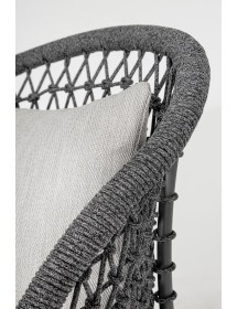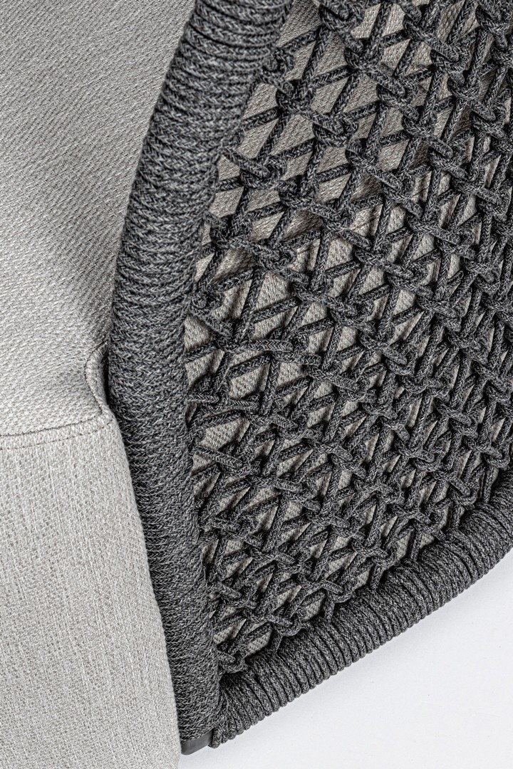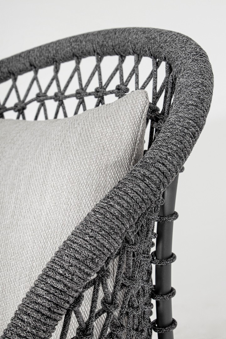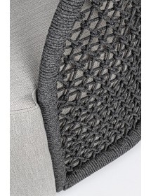 STRUTTURA IN ALLUMINIO VERNICIATO A POLVERE (POLIESTERE), INTRECCIO CON CORDA IN OLEFIN (100% POLIPROPILENE). SEDUTA CON IMBOTTITURA IMPERMEABILIZZATA, RIVESTIMENTO NON SFODERABILE IN TESSUTO PER ESTERNO IN OLEFIN (100% POLIPROPILENE, 285G/M2),IDROREPELLENTE E RESISTENTE AI RAGGI UV (GRADO 7). CUSCINO SCHIENALE SFODERABILE IN TESSUTO OLEFIN.