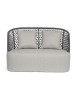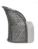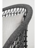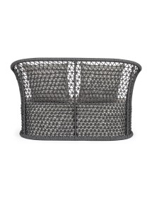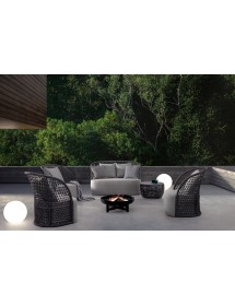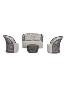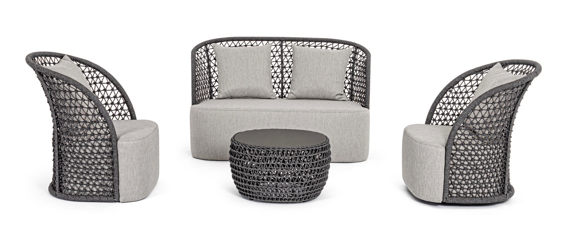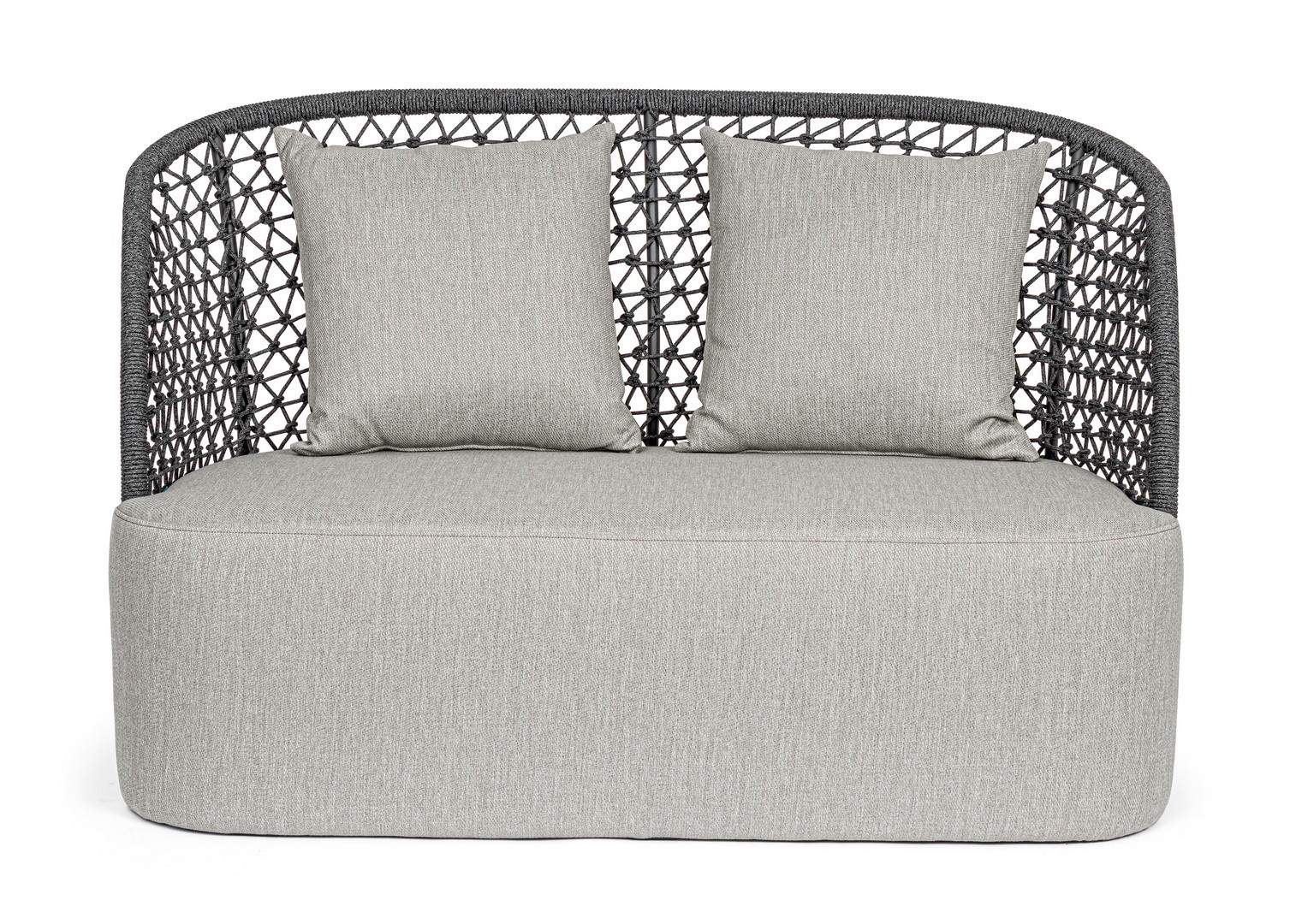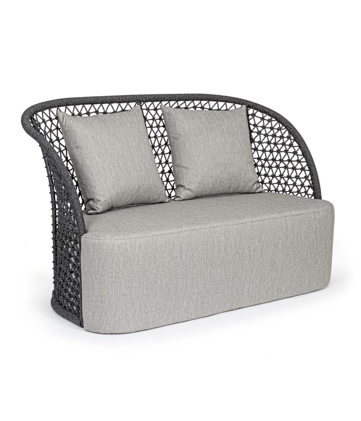 STRUTTURA IN ALLUMINIO VERNICIATO A POLVERE (POLIESTERE), INTRECCIO CON CORDA IN OLEFIN (100% POLIPROPILENE). SEDUTA CON IMBOTTITURA IMPERMEABILIZZATA, RIVESTIMENTO NON SFODERABILE IN TESSUTO PER ESTERNO IN OLEFIN (100% POLIPROPILENE, 285G/M2),IDROREPELLENTE E RESISTENTE AI RAGGI UV (GRADO 7). CUSCINO SCHIENALE SFODERABILE IN TESSUTO OLEFIN.