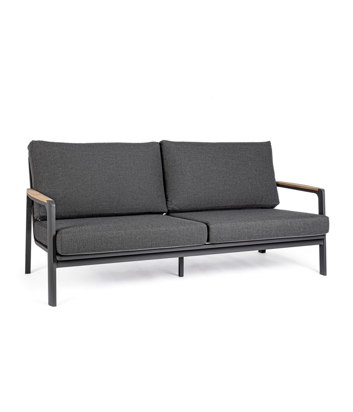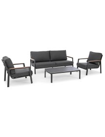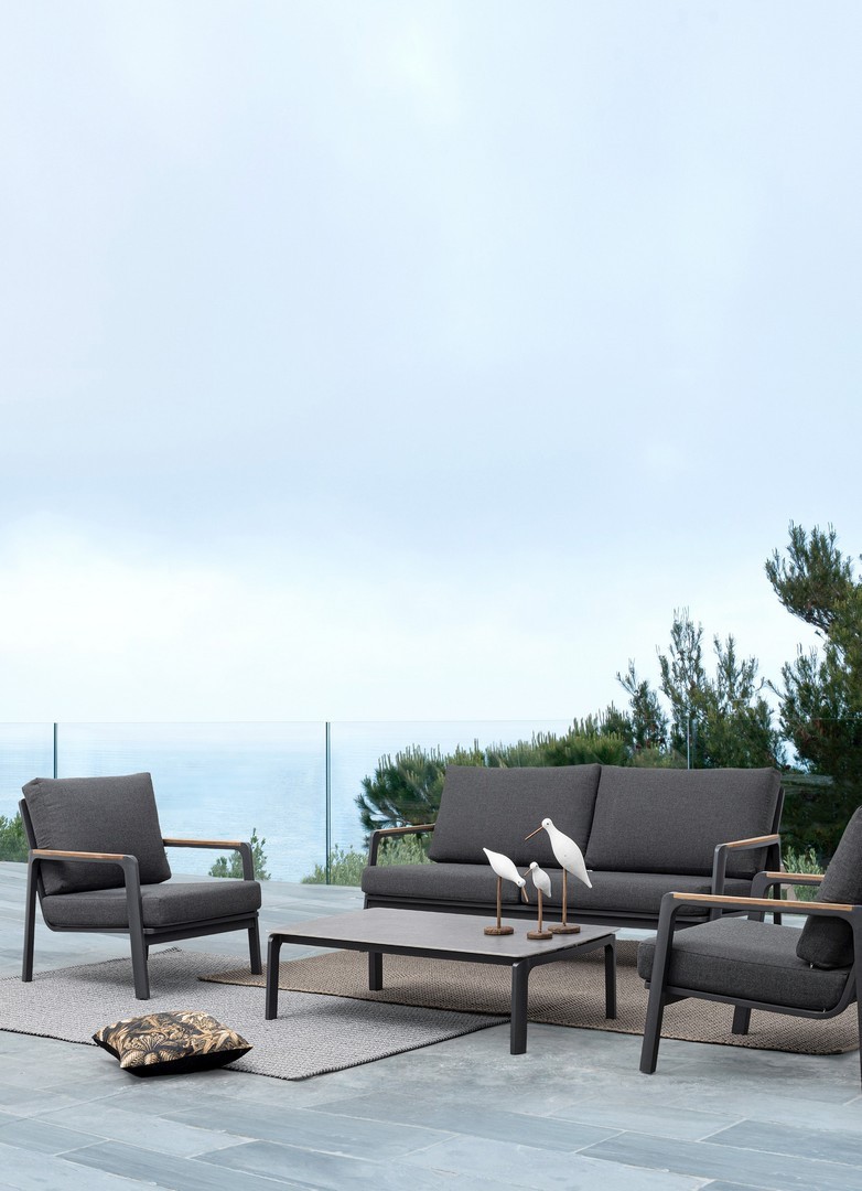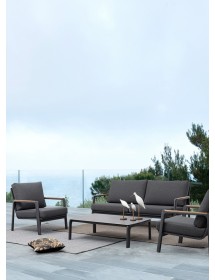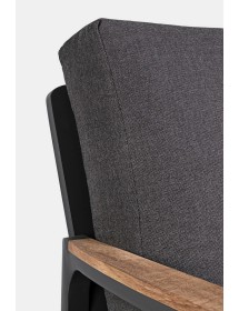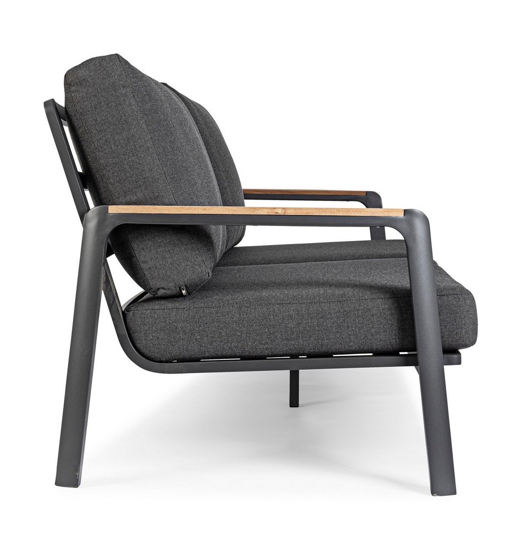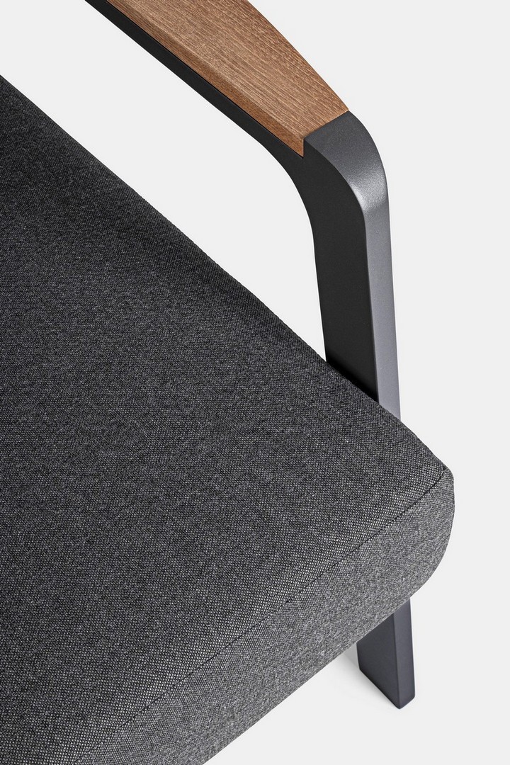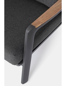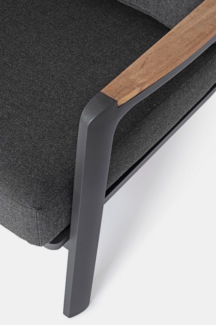 ALLUMINIO VERNICIATO A POLVERE (POLIESTERE). BRACCIOLI CON INSERTI IN TEAK. CUSCINI SEDUTA E SCHIENALE SFODERABILI IN TESSUTO ACRILICO.