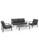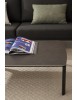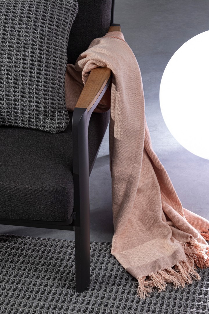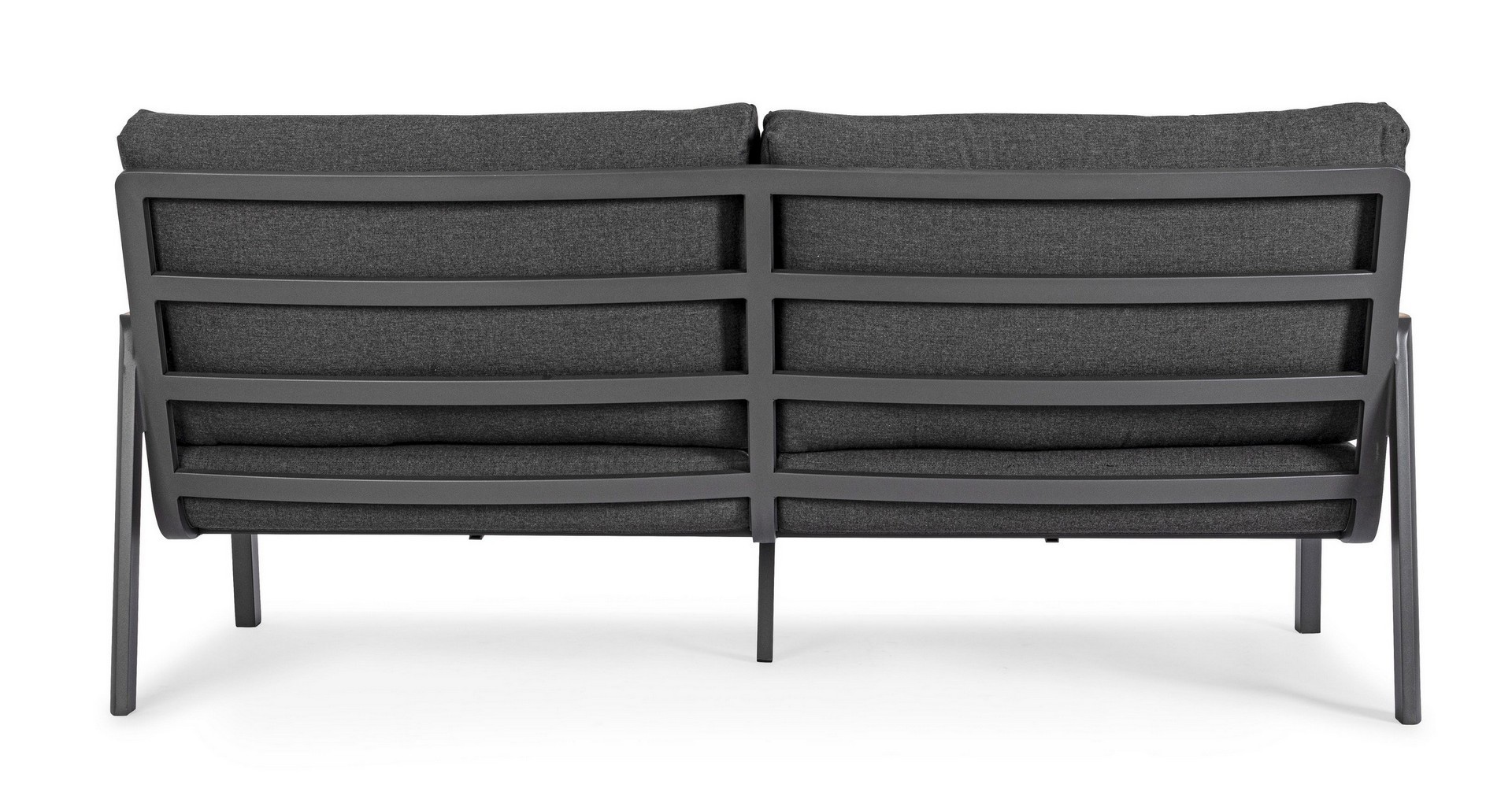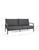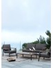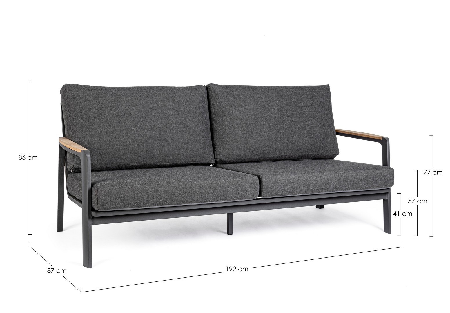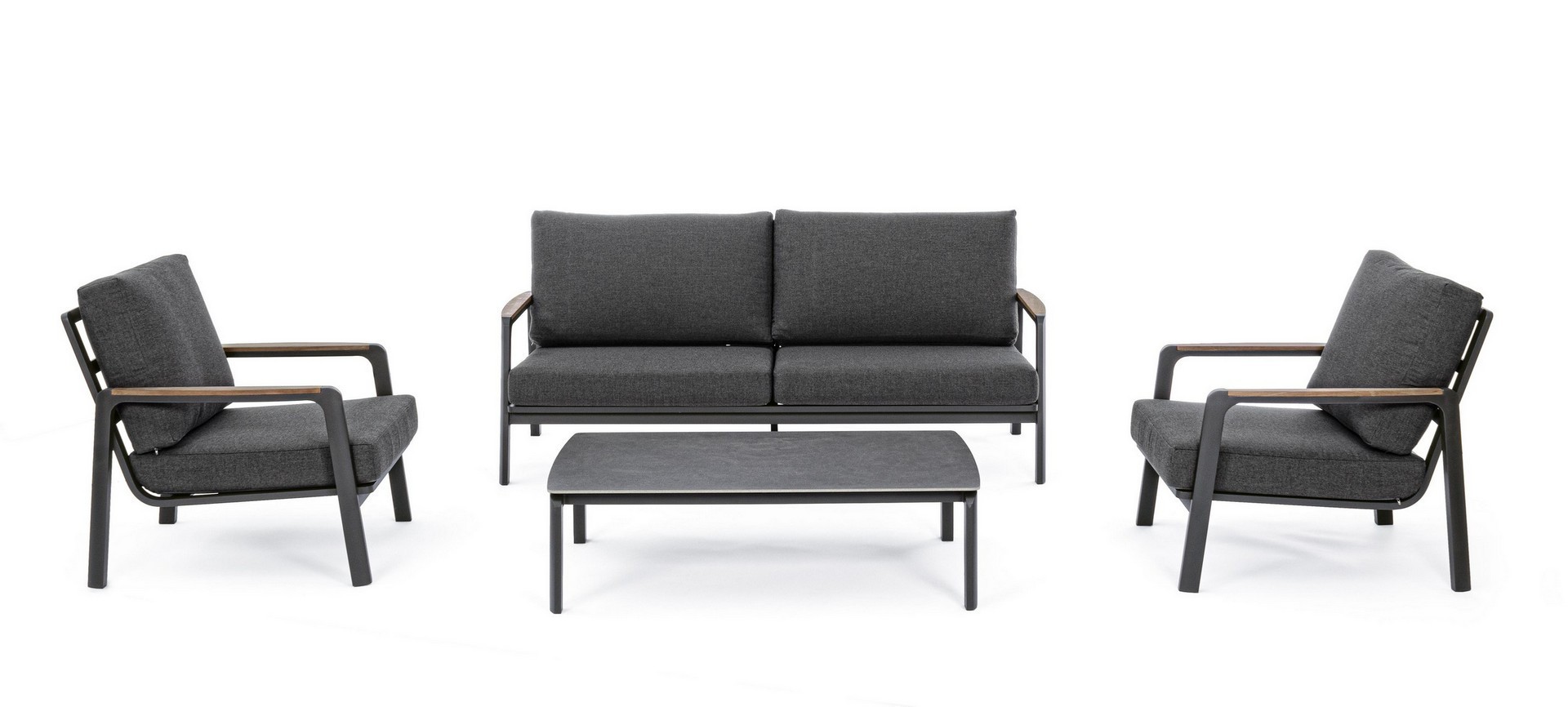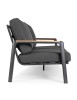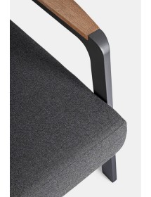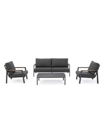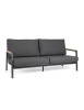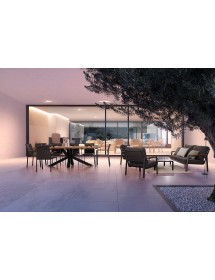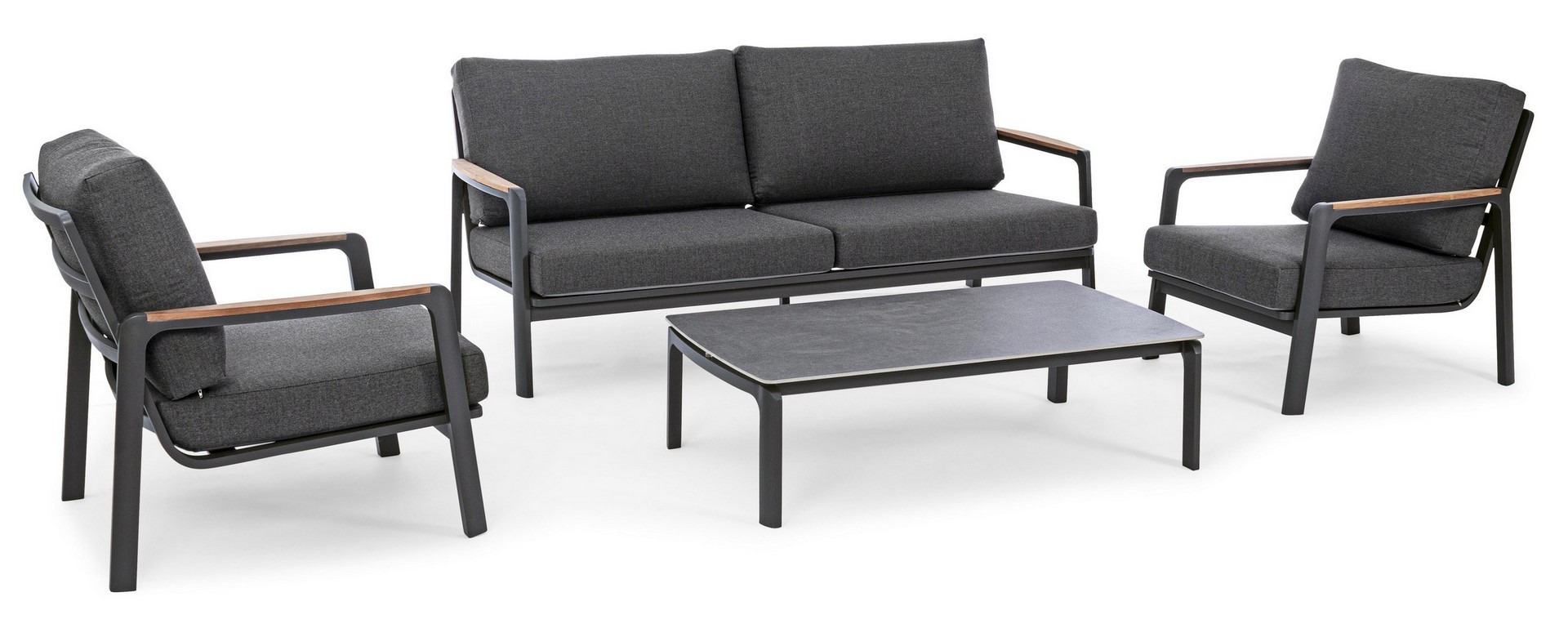 ALLUMINIO VERNICIATO A POLVERE (POLIESTERE). BRACCIOLI CON INSERTI IN TEAK. CUSCINI SEDUTA E SCHIENALE SFODERABILI IN TESSUTO ACRILICO.