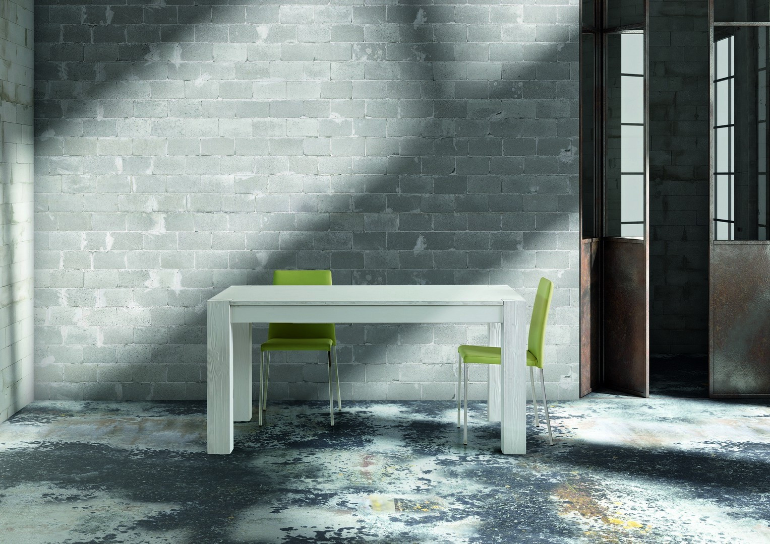 Tavolo allungabile in legno di abete laccato bianco e spazzolato per esaltare l'effetto materico, adatto per l'arredo della zona living con l'unicità del vero legno.