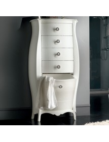 DESCRIZIONE DEL MOBILE Cassettiera 4 cassetti con ribalta Laccatura colore bianco. Fianchi sagomati. I cassetti, montano splendide maniglie tonde da 8 swarovski.