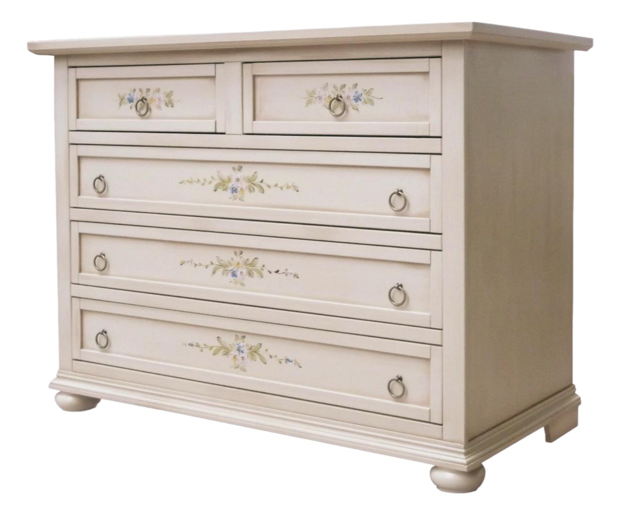 Cassettiera classica costruita in legno con tre cassettoni grandi per riporre biancheria intima e indumenti, fianchi riquadrati e traversi orizzontali, laccatura avorio patinato con decori floreali e gambe a cipolla, nella parte superiore si trovano due cassetti per riporre piccoli oggetti. Trovano facilmente posto nella zona notte grazie al suo design classico e raffinato. Complemento d'arredo in grado di rendere ancora più accogliente e caldo l'ambiente in cui verrà inserito. Adatto nelle camere classiche e moderne come elemento di contrasto.