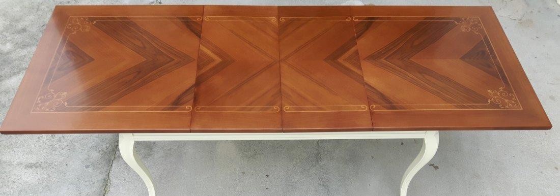 Tavolo costruito in legno massello con piano intarsiato e con gambe sagomate rendendo il mobile elegante e leggero. Dotato di due allunghe da 40 cm allungabile con apertura al centro. Fascia sottostante finemente incorniciata rendendola unica nel suo genere. Ideale per il soggiorno o in cucina.