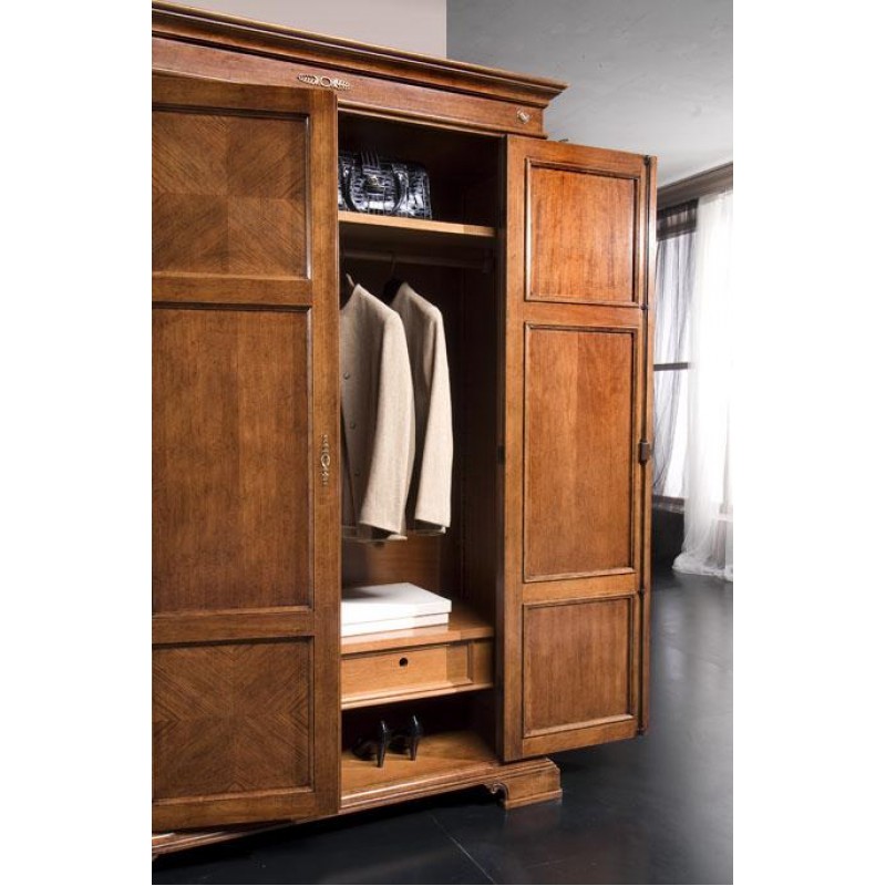 Armadio classico da ingresso, costruito in legno, arricchito da fregi in metallo applicati sotto il cappello rendendolo unico per la sua originalità. Armadio dalle classiche scalette laterali che permettono di regolare il ripiano e la cassettiera all' altezza desiderata. Dotato di di un ripiano interno e un palo appendiabiti per riporre e appendere indumenti. Prodotto esclusivamente prodotto e realizzato in Italia da mani di esperti artigiani del settore dell'arredamento.