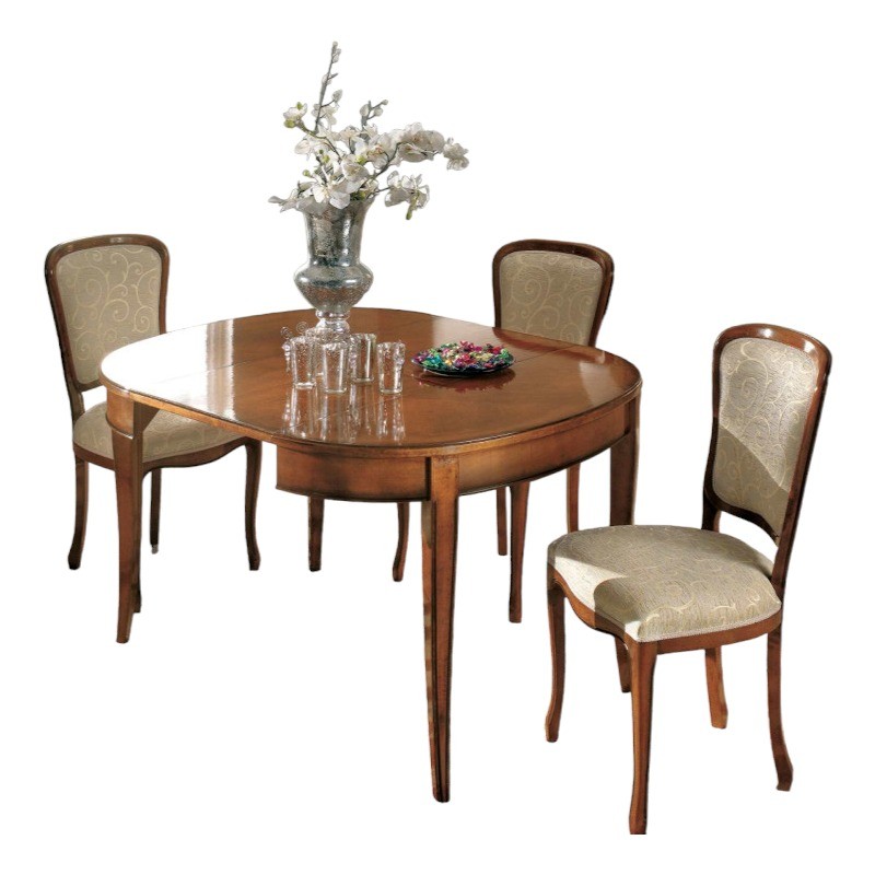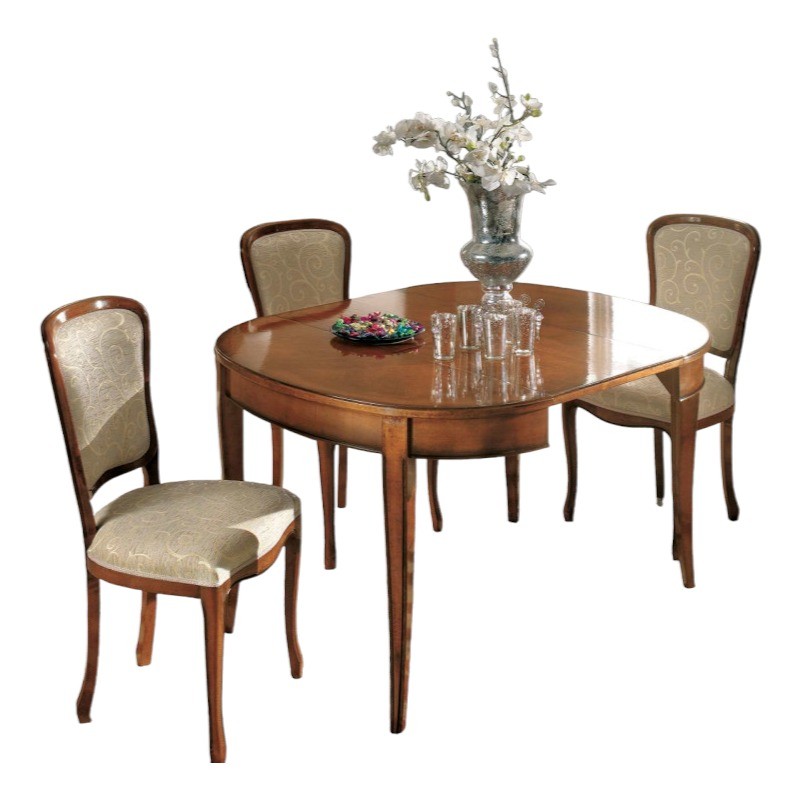 Tavolo ovale costruito in legno massello ovale con gambe a sciabola sagomate rendendo il mobile solido e allo stesso tempo elegante. Dotato di una allunga da 50 cm allungabile con apertura centrale, detta anche 'apertura a scorrimento', la allunga è riposta sotto il piano. Ideale per il soggiorno e la cucina , un must intramontabile destinato a durare nel tempo e fuori dalle mode del presente.