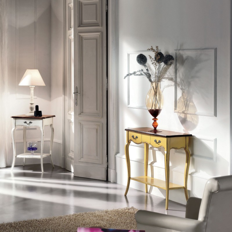 Consolle classica dallo stile francese del 700' in legno con gambe arcuate intagliate e un ripiano per appoggiare libri e oggetti. Grazie ai suoi due cassetti ti permetteranno di sbarazzarti da quei famosi svuota tasche che da anni vengono lasciati all'ingresso in maniera casuale. Consolle dalla finitura shabby consumata donando la capacità di adattarsi ad ogni gusto personale. Ideale per la zona giorno o come mobile per l' entrata.