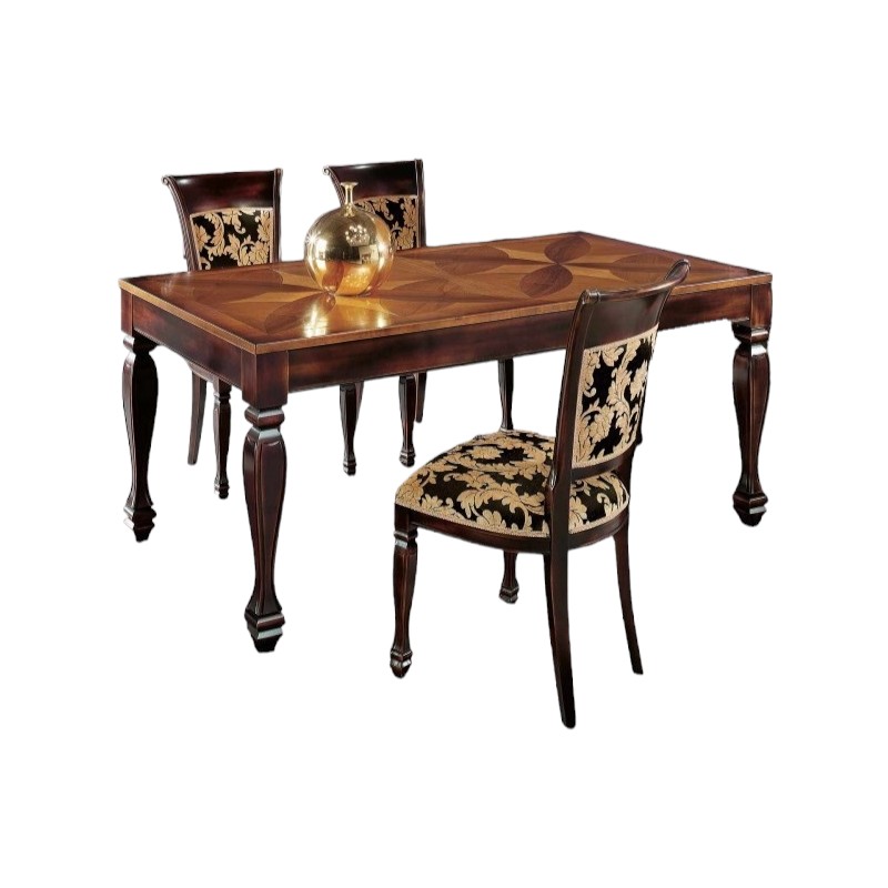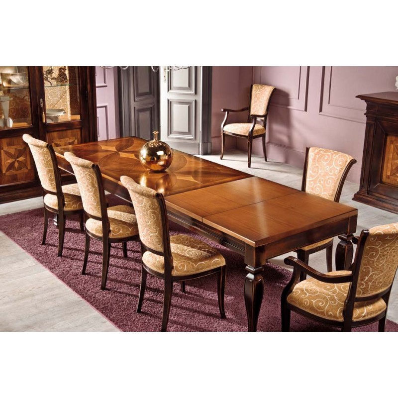 Tavolo rettangolare allungabile costruito in legno massello con gambe tornite e sagomate rendendo il mobile stabile e resistente. Piano del tavolo intarsiato con filettatura realizzata da mani di esperti artigiani. Adatto per la sala da pranzo e perfetto da posizionare sia in salotto che in cucina grazie alle sue misure per accogliere fino a 10 posti.