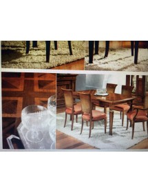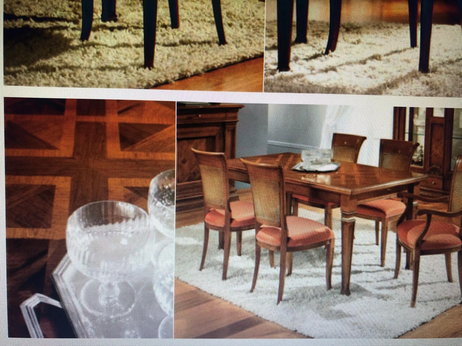 Tavolo rettangolare allungabile costruito in legno massello con gambe tornite e spillo rendendo il mobile stabile e resistente. Piano del tavolo intarsiato realizzato da mani di esperti artigiani. Le due allunghe da 40 cm sono estraibili lateralmente " detta anche apertura a tiro " e quando non vengono utilizzate possono essere riposte sotto al piano del tavolo. Adatto per la sala da pranzo e perfetto da posizionare sia in salotto che in cucina grazie alle sue misure per accogliere fino a 10/12 posti.