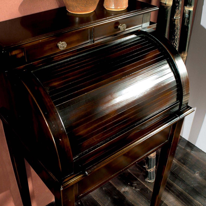 Bureau con tiretto che allarga il piano disponibile, costruito in legno con gambe a spillo. Funzionale e pratico, dotato di un cassetto centrale e quattro cassettini con due vani a giorno, il tutto richiudibile con una serrandina a rullo . Ideale per la zona giorno o come mobile per l' entrata.
