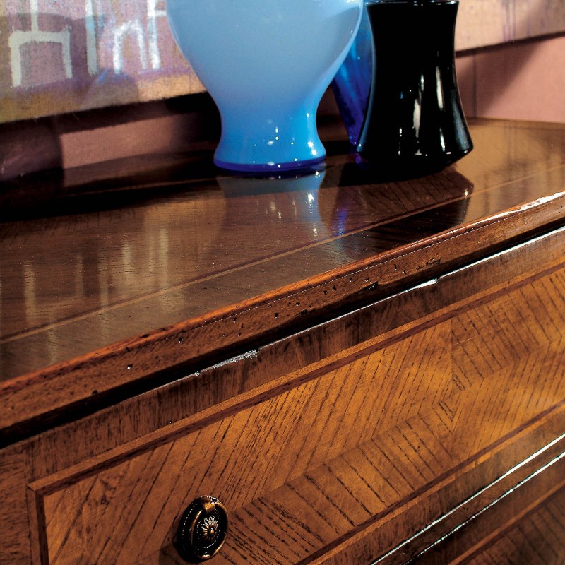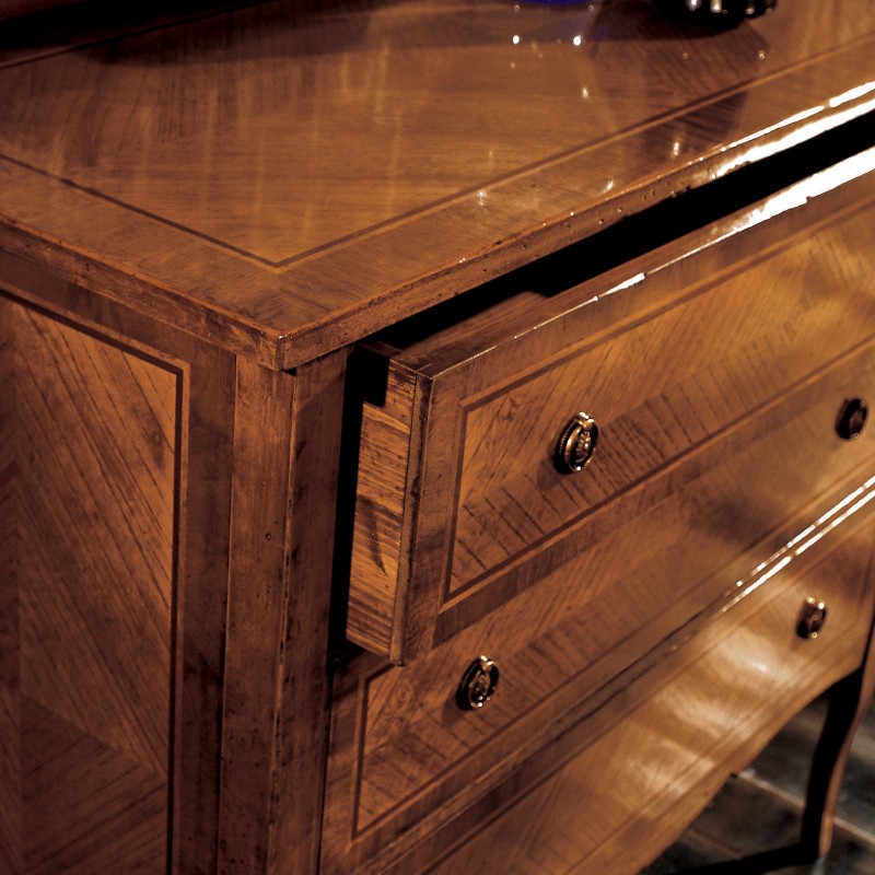Cassettiera costruita in legno con piano rettangolare, gambe a sciabola e fianchi riquadrati. Dotata di tre cassettoni per riporre all'occorrenza biancheria intima e indumenti. Trova facilmente posto nella zona notte come comodino o nella zona giorno come complemento d' arredo, proteggendo con i suoi cassetti il suo contenuto all'interno. Unica nel suo genere con la sua particolare verniciatura noce bassano creando un bellissimo contrasto con i tre cassettoni e i fianchi riquadrati con filetti e intarsi, dando un tocco a un' atmosfera dallo stile classico.