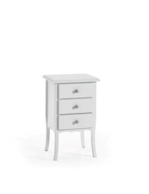 Gruppo cassettiera e Comodini costruiti in legno con angoli smussati e gambe a sciabola. Cassettiera e comodini dotati di cassetti per riporre all'occorrenza biancheria intima e oggetti. Trovano facilmente posto nella zona notte proteggendo con i suoi cassetti il suo contenuto all'interno. Unici nel loro genere con la sua particolare laccatura bianco opaco dando un tocco a un' atmosfera dallo stile romantico.